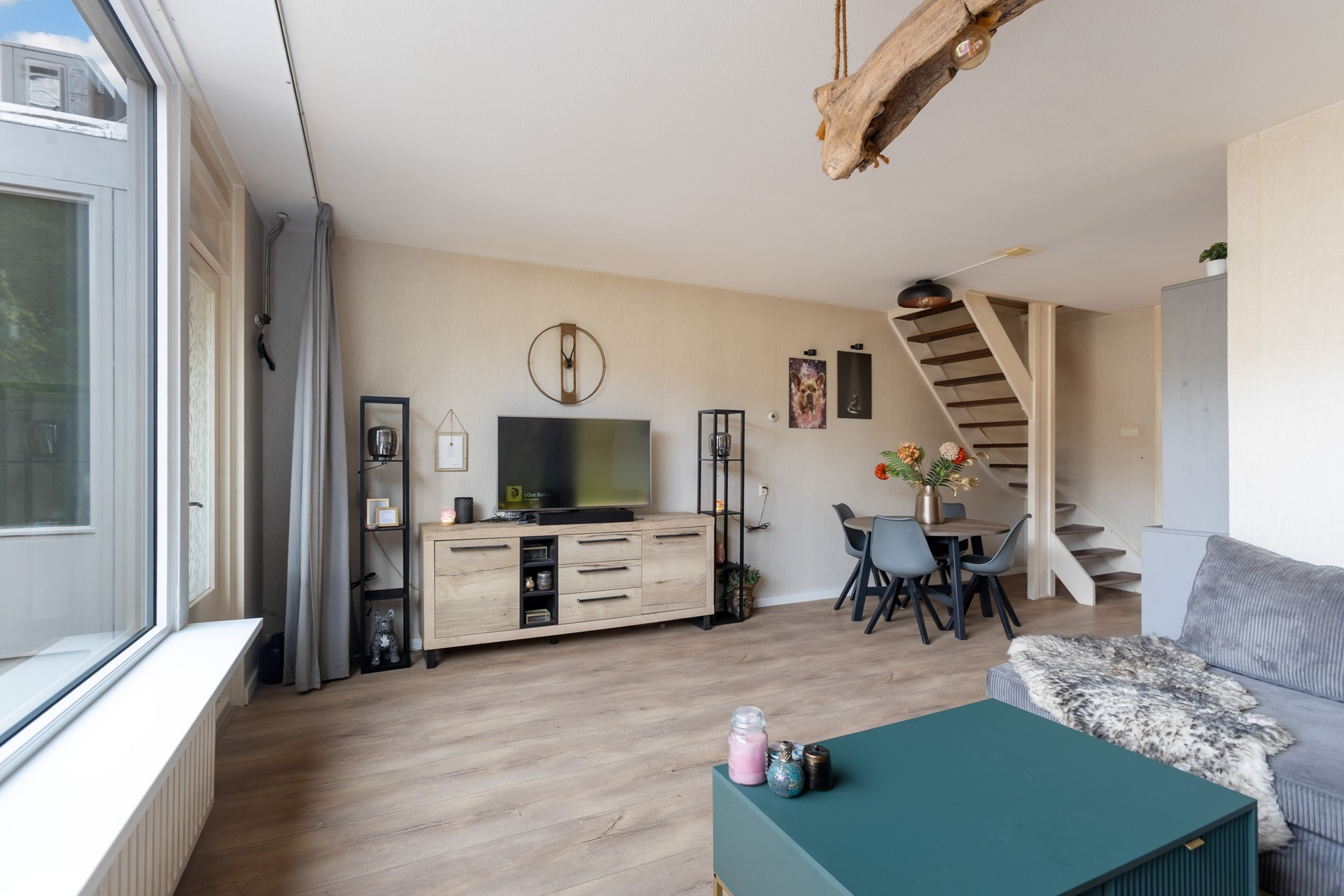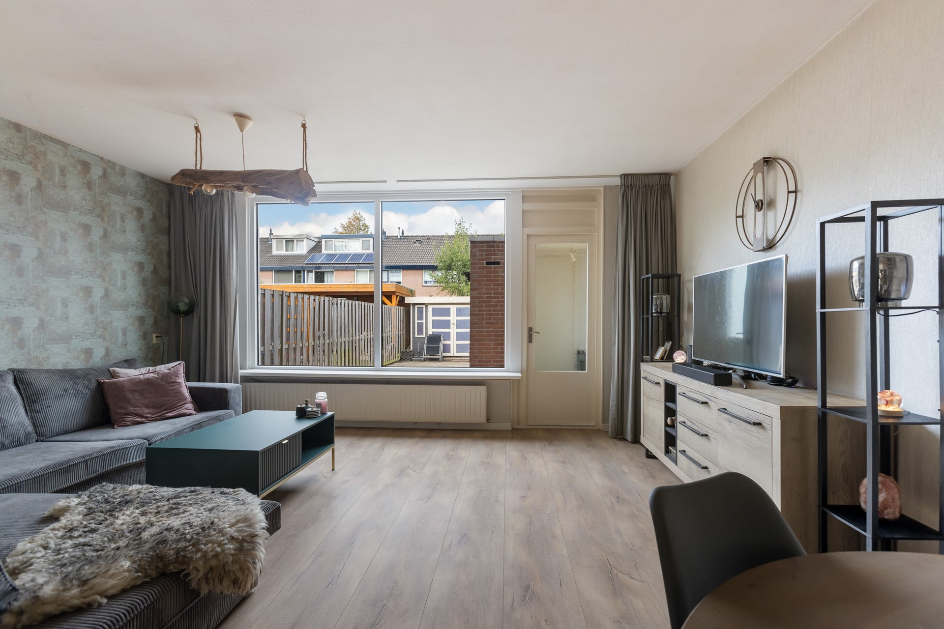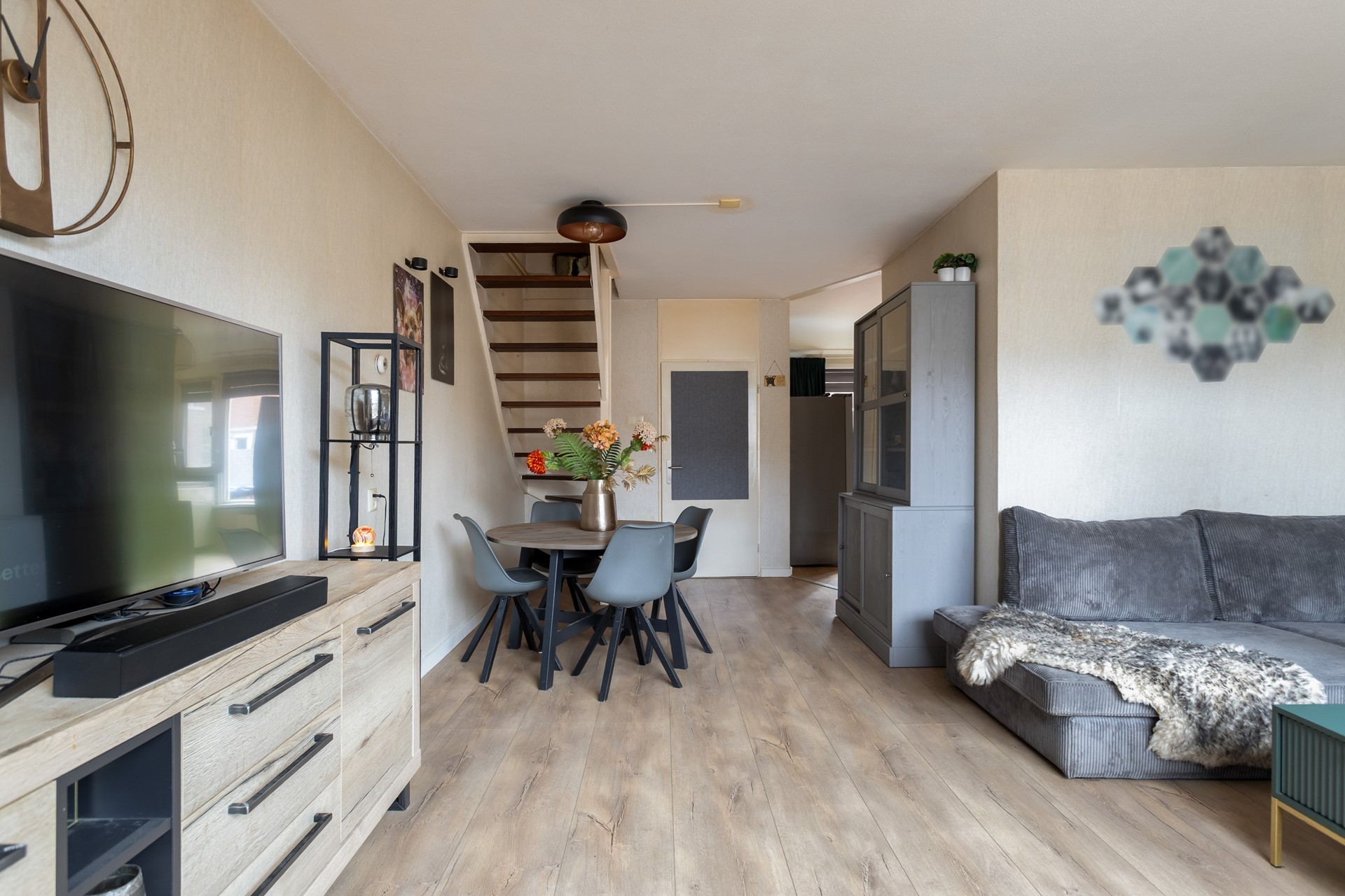 Vanuit de hal kom je in de ruime woonkamer die over de volle breedte van de woning ligt en prettig uitzicht biedt op de achtertuin. De trap naar de eerste verdieping zit in de woonkamer. De vloer- en wanafwerking is respectievelijk laminaat en behang.