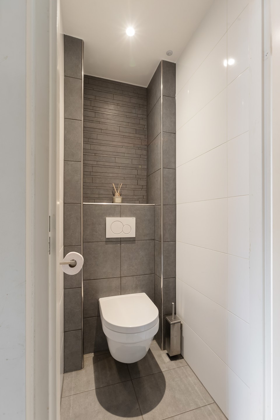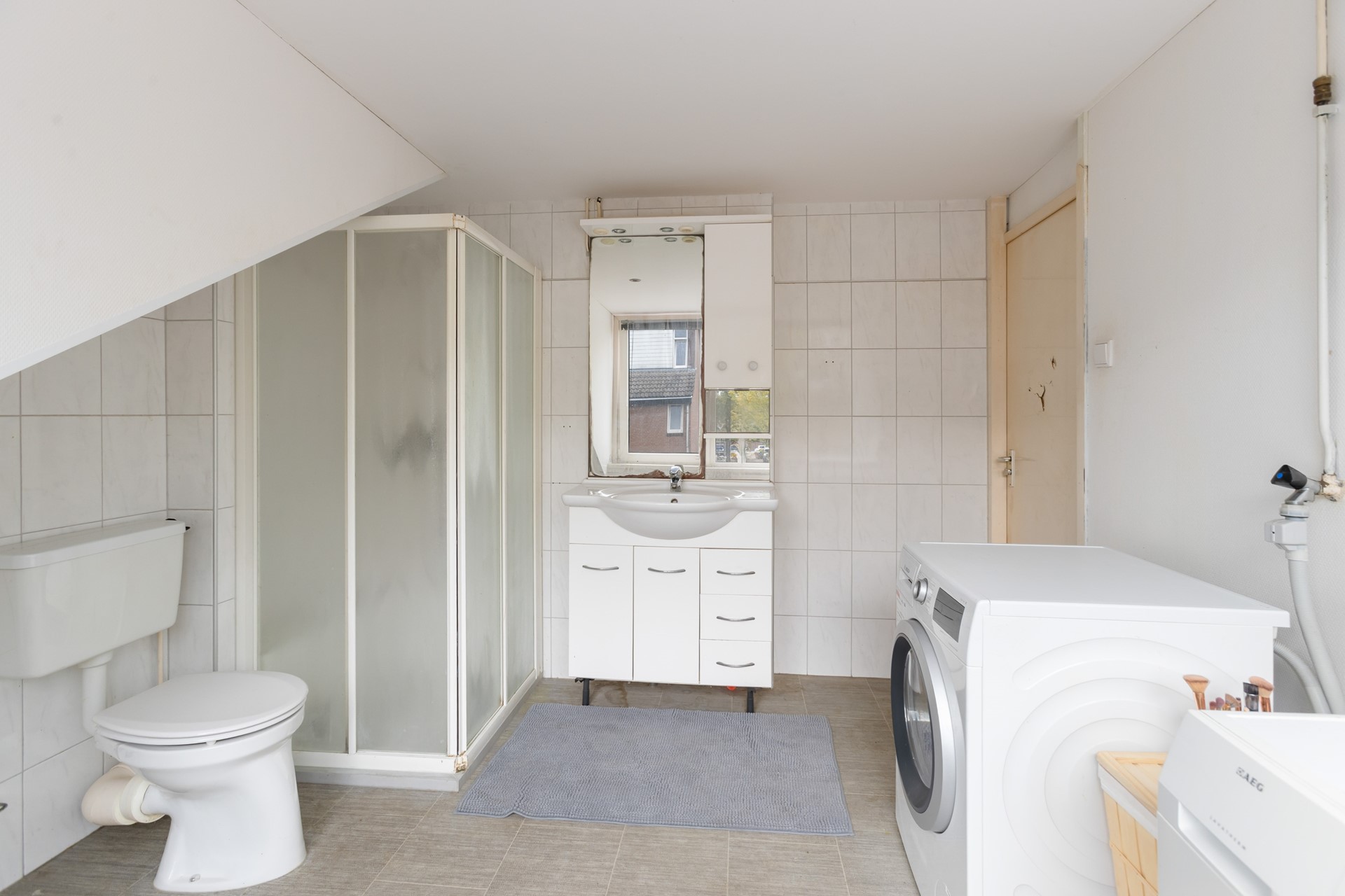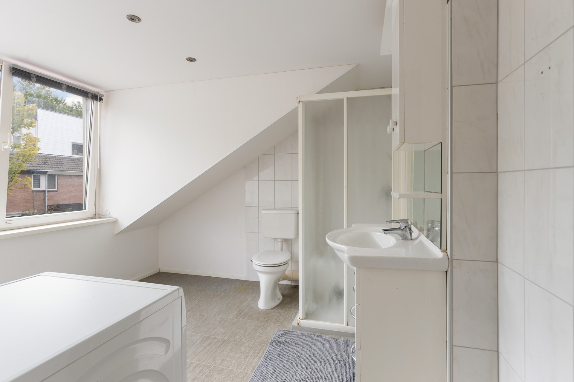 Aan de voorkant van de woning bevindt zich de ruime badkamer dankzij de dakkapel met inbouwspots. De badkamer is voorzien van douchcabine, toilet, wastafel en wasmachine aansluiting.