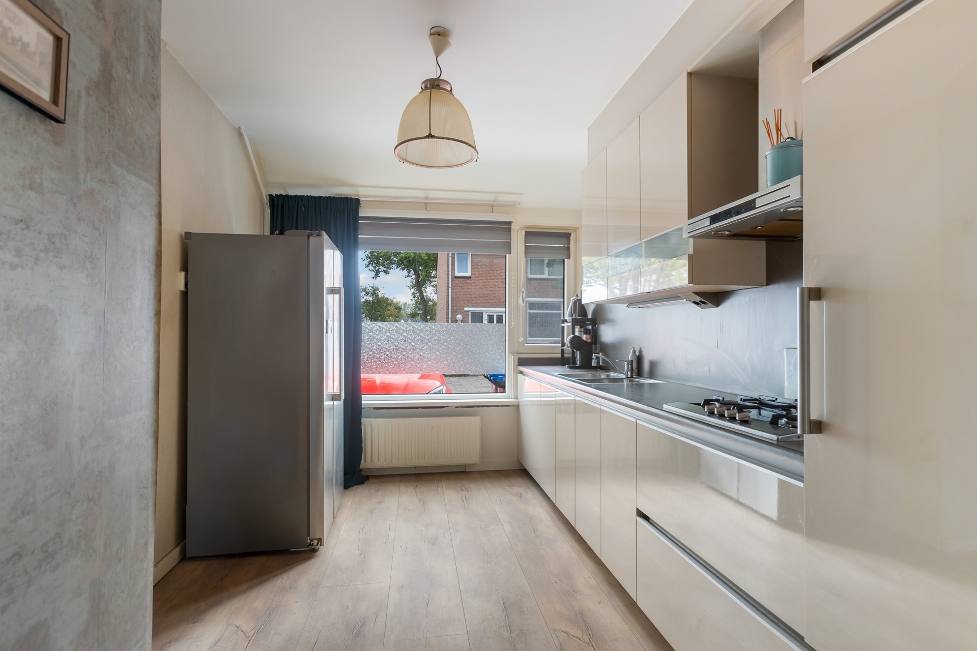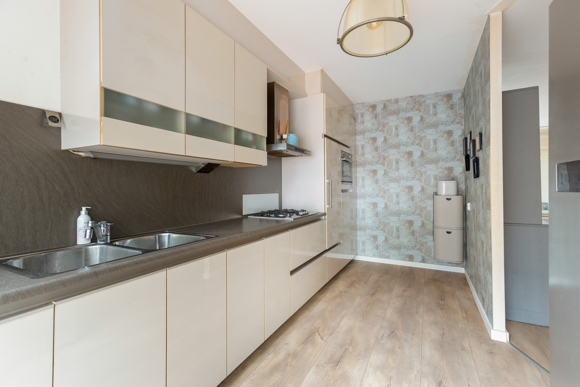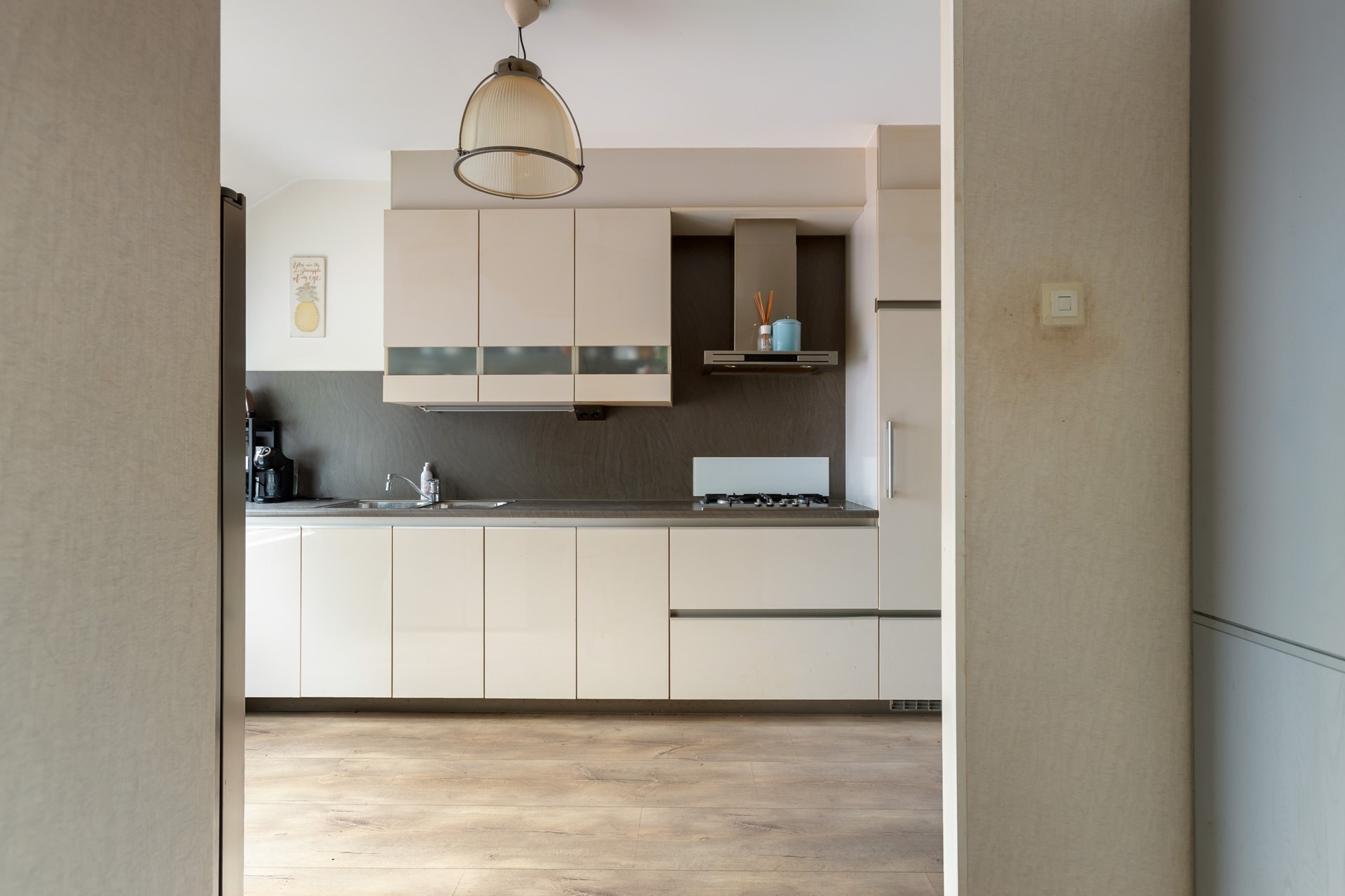 De halfopen keuken in rechte opstelling en is gesitueerd aan de voorzijde. De keuken is praktisch ingericht met dubbele spoelbak, oven en gaskookplaat met afzuiging, vrijstaande koelkast (blijft achter) en vaatwasser.