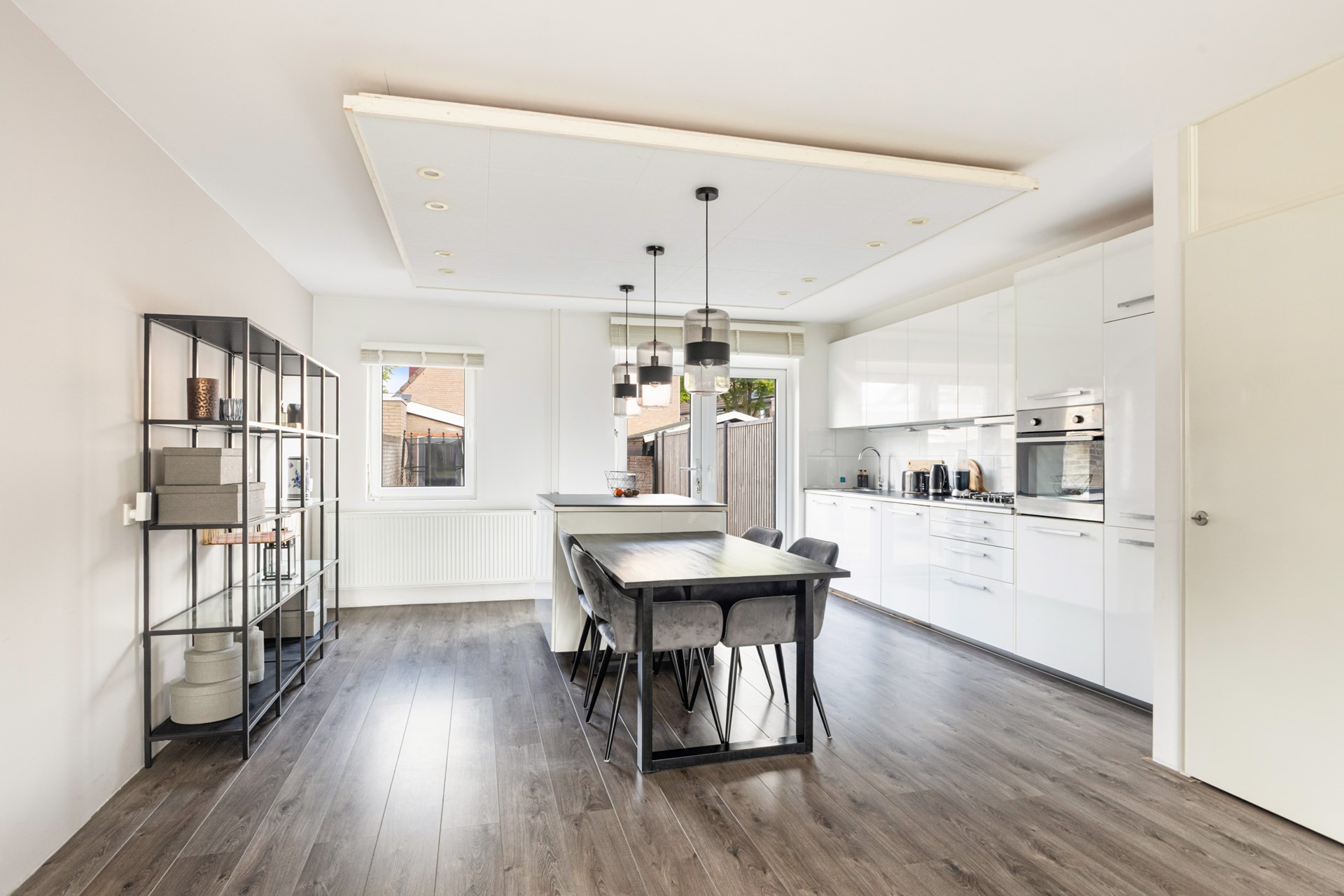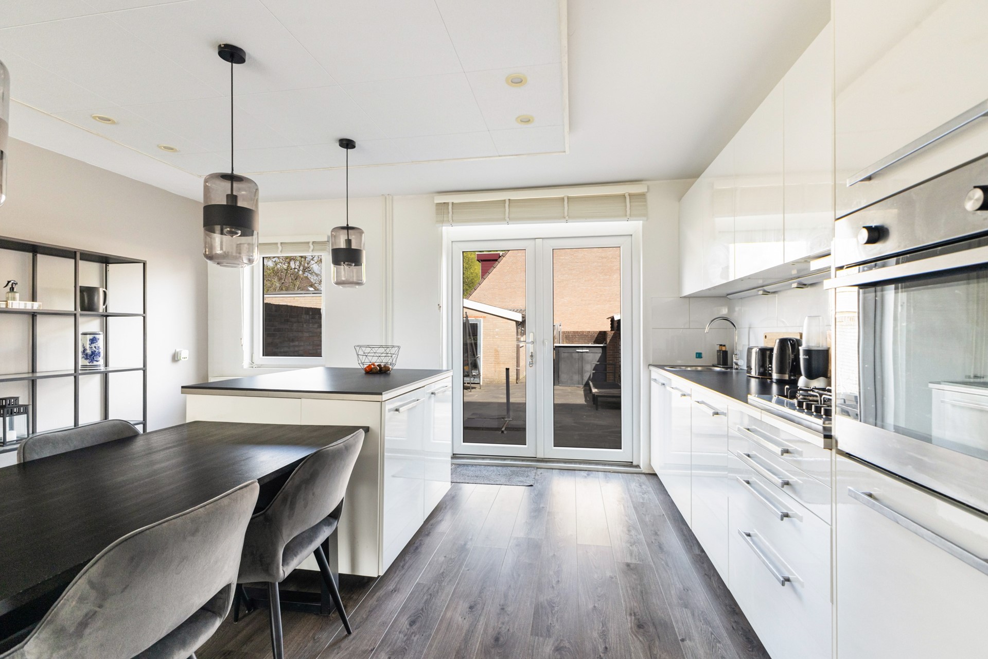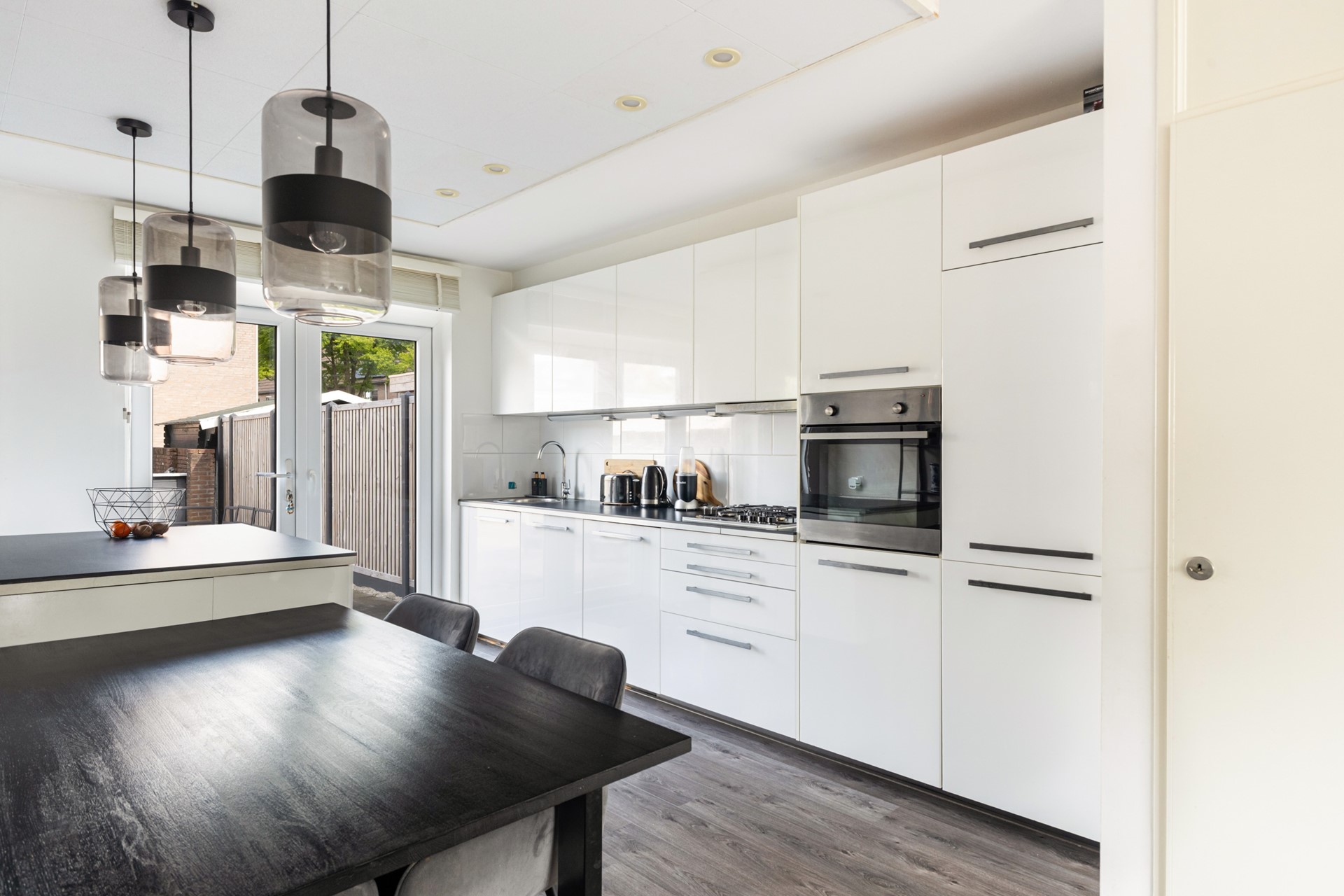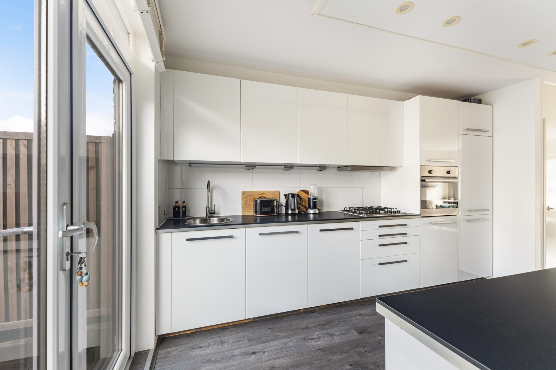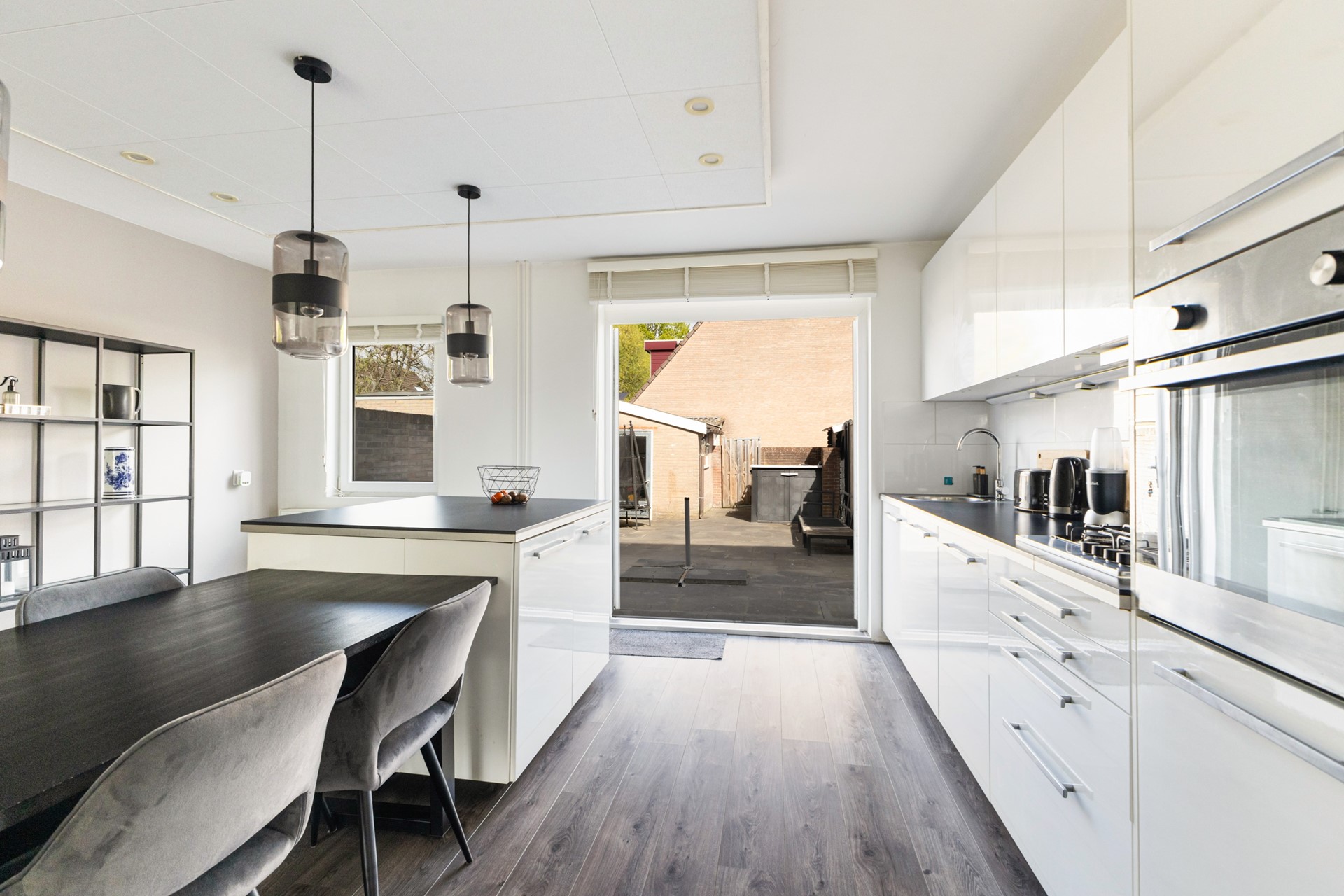 De keuken is uitgevoerd in een rechte opstelling met een modern keukenblok. Boven het werkblad bevindt zich een verlaagd plafond (koof) met inbouwspotjes. De keuken is voorzien van een koelkast, vriezer, 4-pits gasfornuis, oven en vaatwasser.