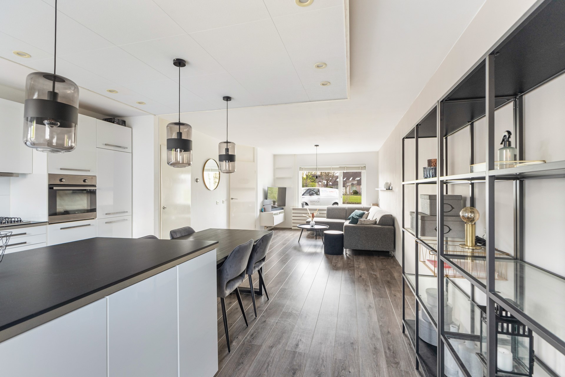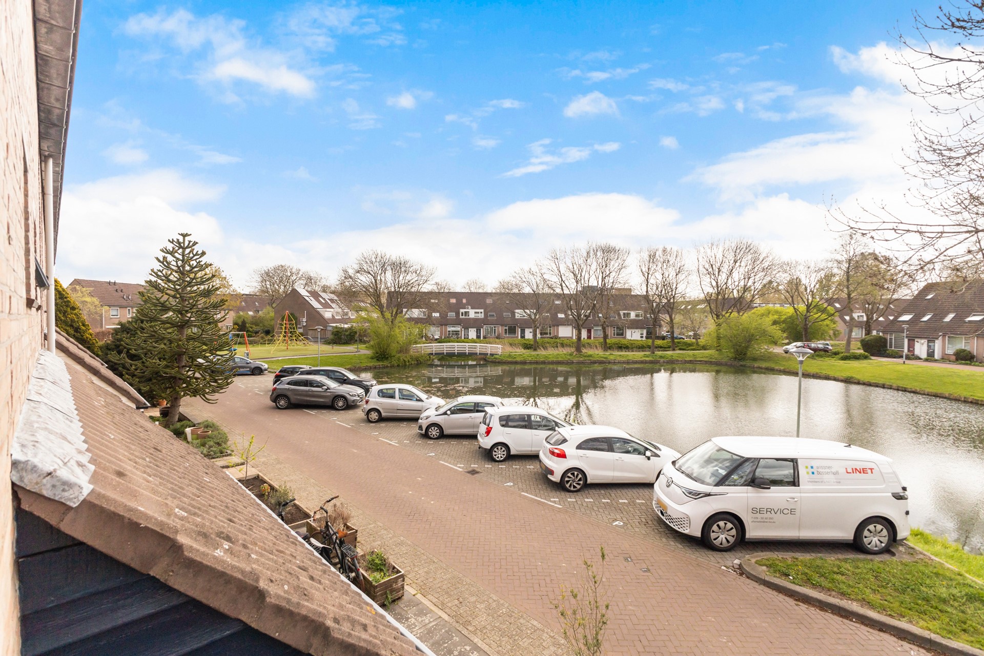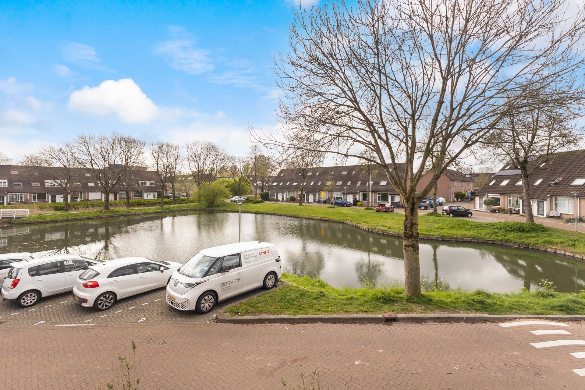 De lichte woonkamer van ca. 9 meter diep met open keuken en grote raampartijen biedt een ruimtelijk gevoel en mooi uitzicht op de vijver. De ca. 12 meter diepe achtertuin ligt op het zonnige westen.