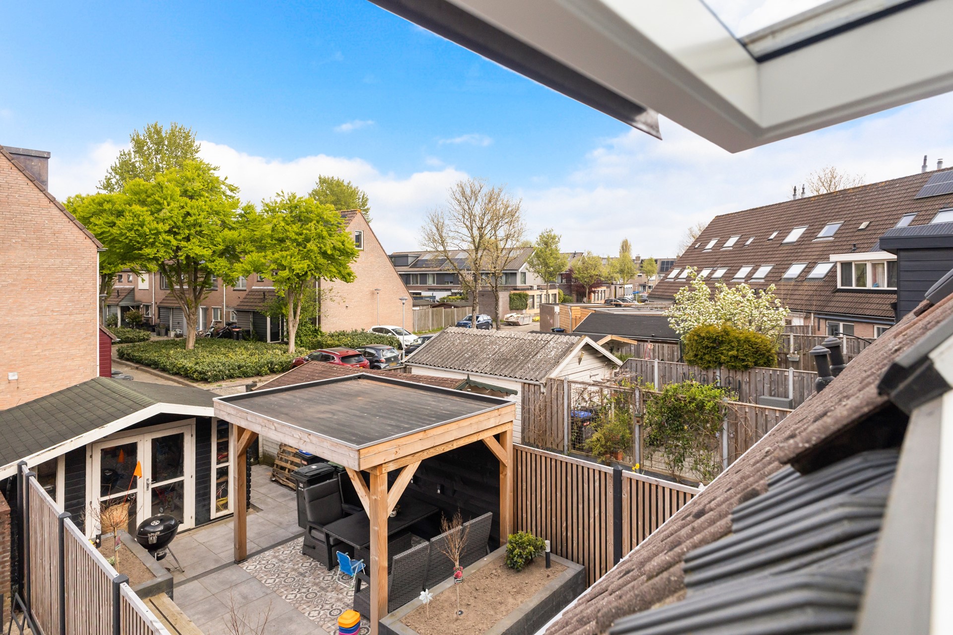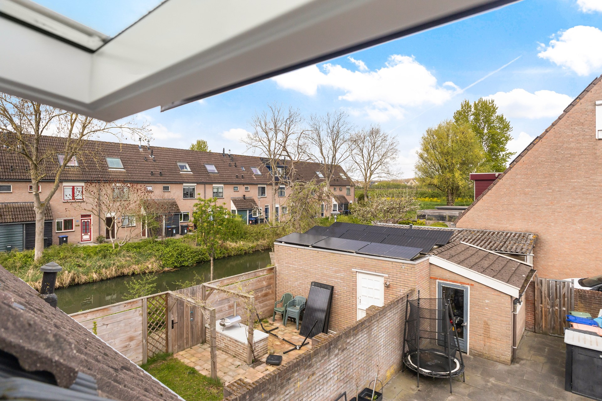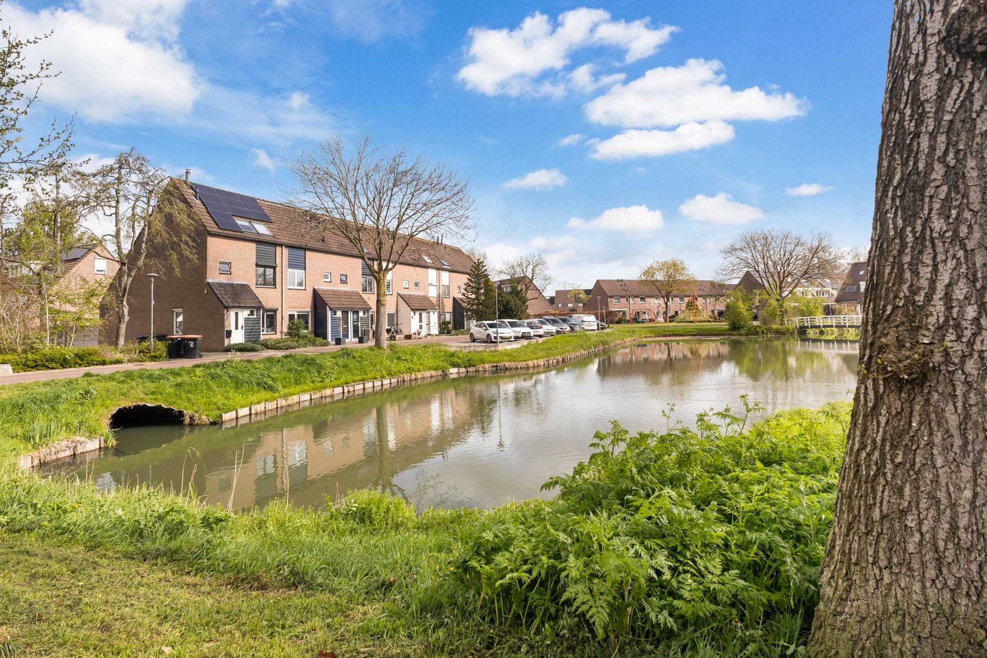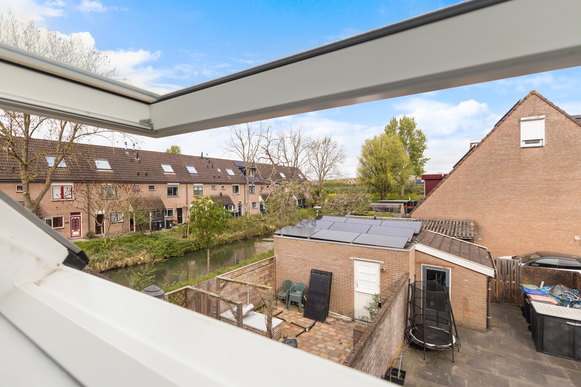 De lichte woonkamer van ca. 9 meter diep met open keuken en grote raampartijen biedt een ruimtelijk gevoel en mooi uitzicht op de vijver. De ca. 12 meter diepe achtertuin ligt op het zonnige westen.