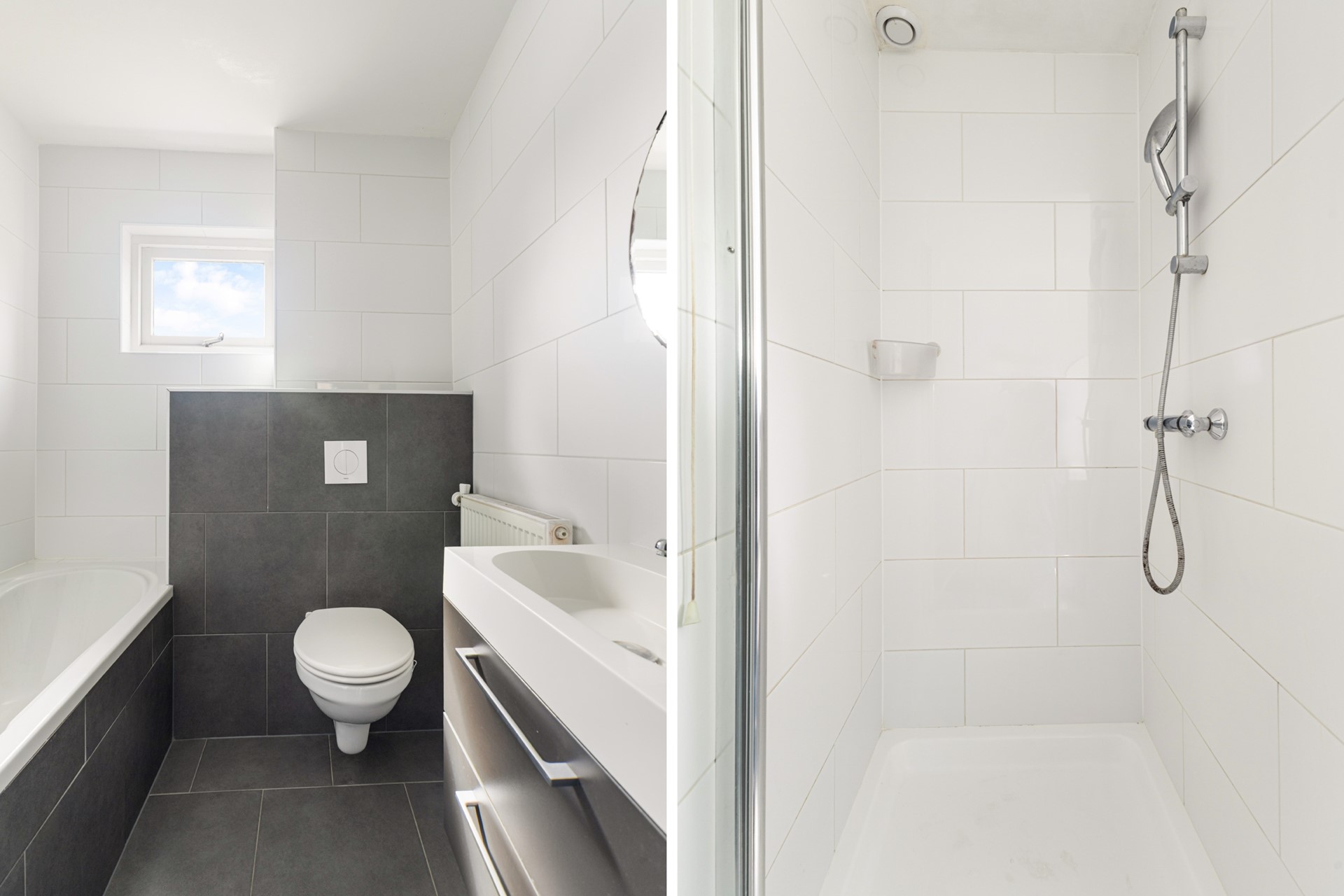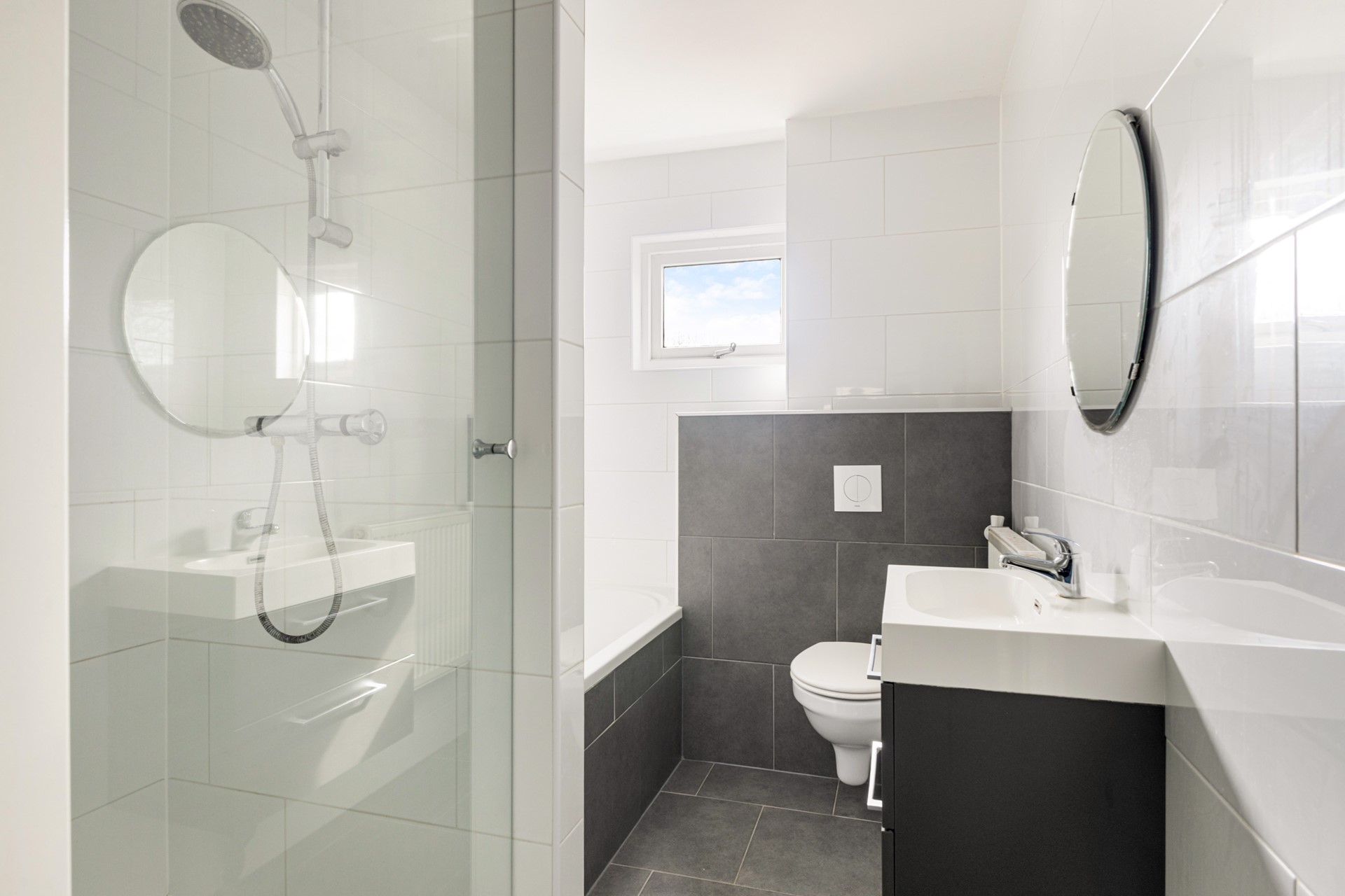 De ruime badkamer is uitgerust met een douchecabine, ligbad, toilet en een wastafelmeubel in antracietkleurige afwerking. Daarnaast is er een raam aanwezig voor natuurlijke ventilatie.