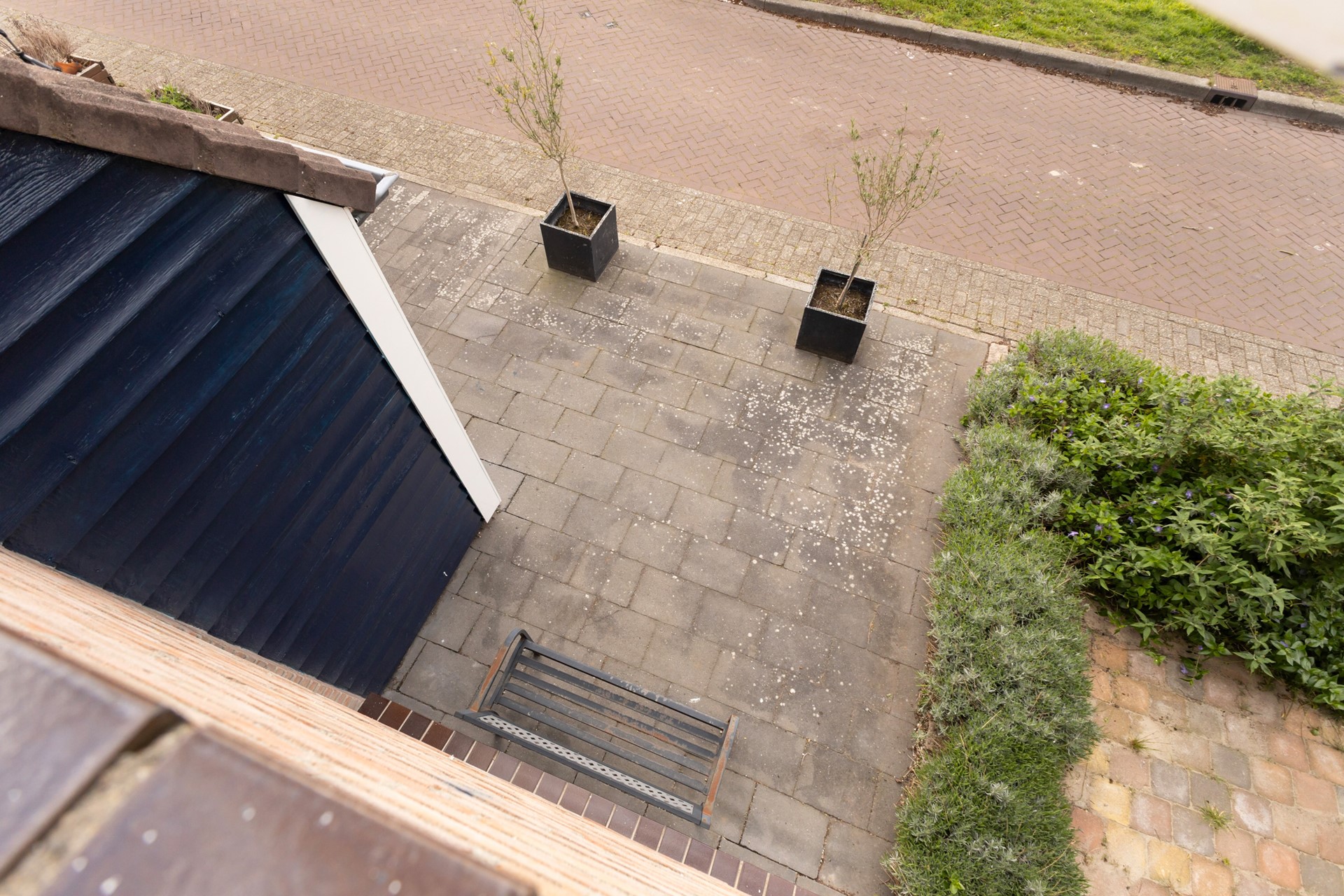 De voortuin is grotendeels bestraat en voorzien van een gezellig zithoekje. Een groene border met plantenbakken zorgt voor een natuurlijke afscheiding en een verzorgde uitstraling.