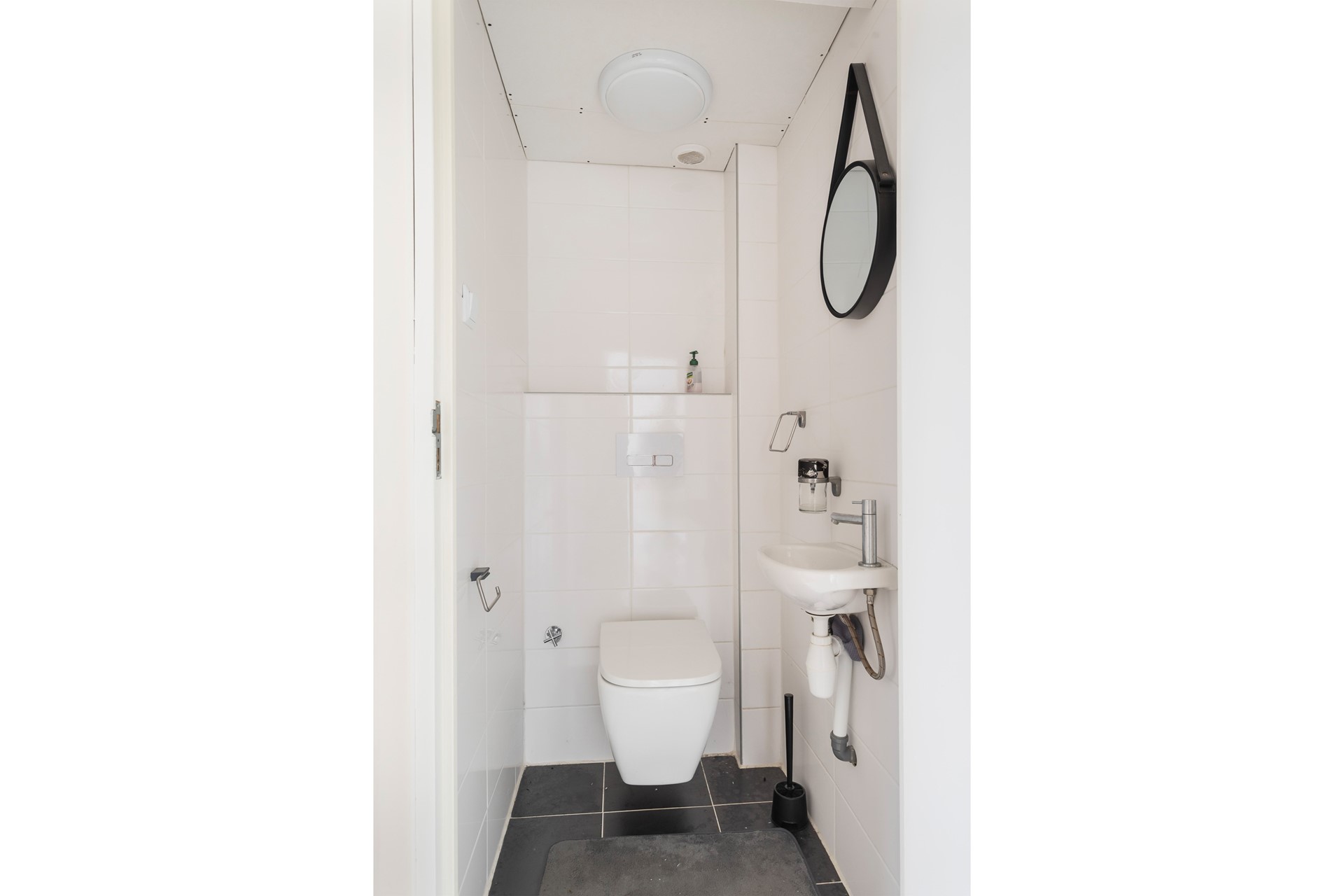 Het toilet is modern afgewerkt met zwarte en witte tegels, voorzien van inbouwreservoir en fontein met mechanische ventilatie