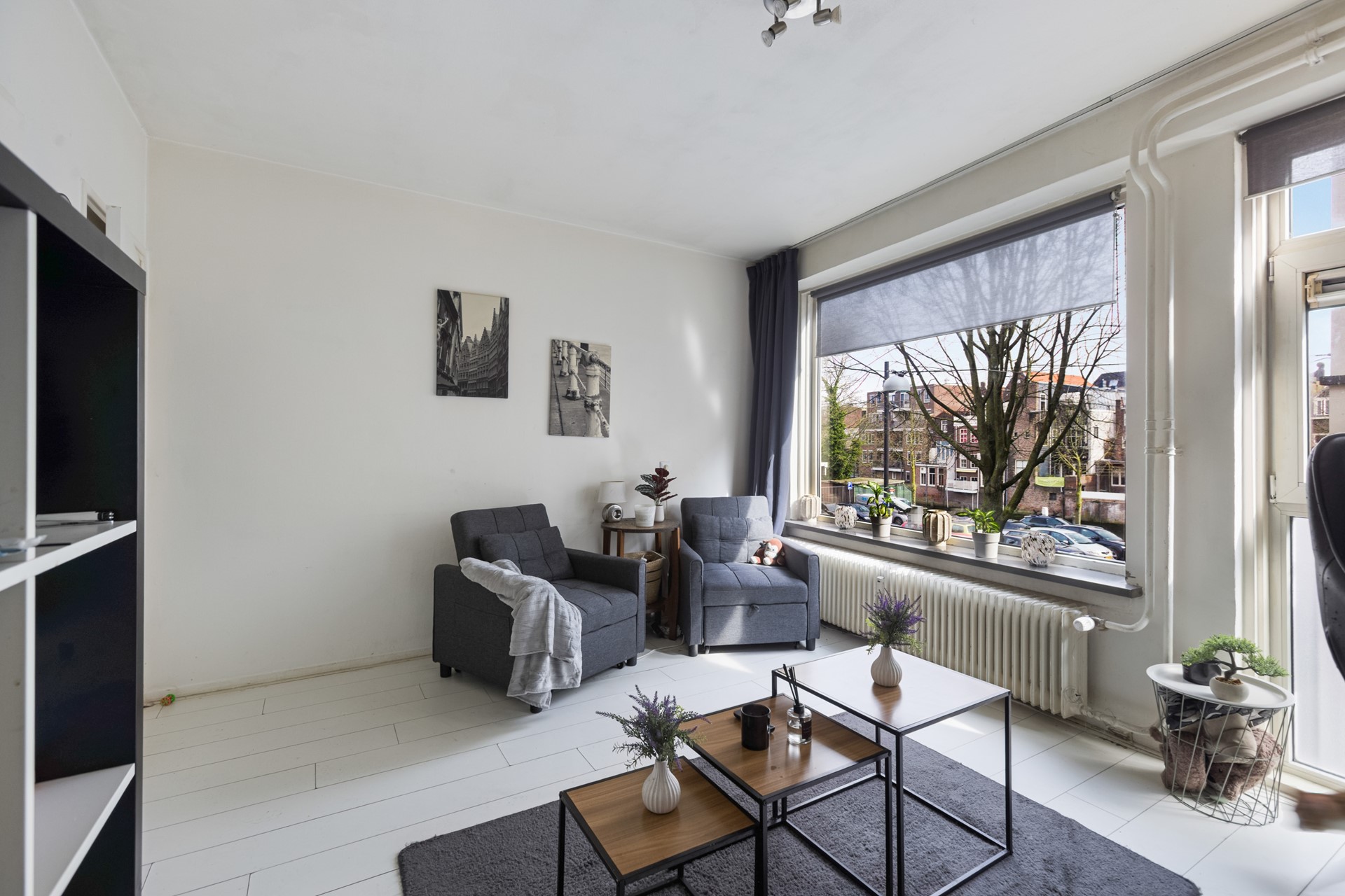De woonkamer is voorzien van grote raampartijen die veel daglicht binnenlaten en uitzicht bieden op de levendige Wijnstraat. Hier kun je een inklapbed of slaapbank plaatsen, waardoor de ruimte multifunctioneel wordt. Perfect voor een knusse zithoek, werkplek of combinatie van beiden.