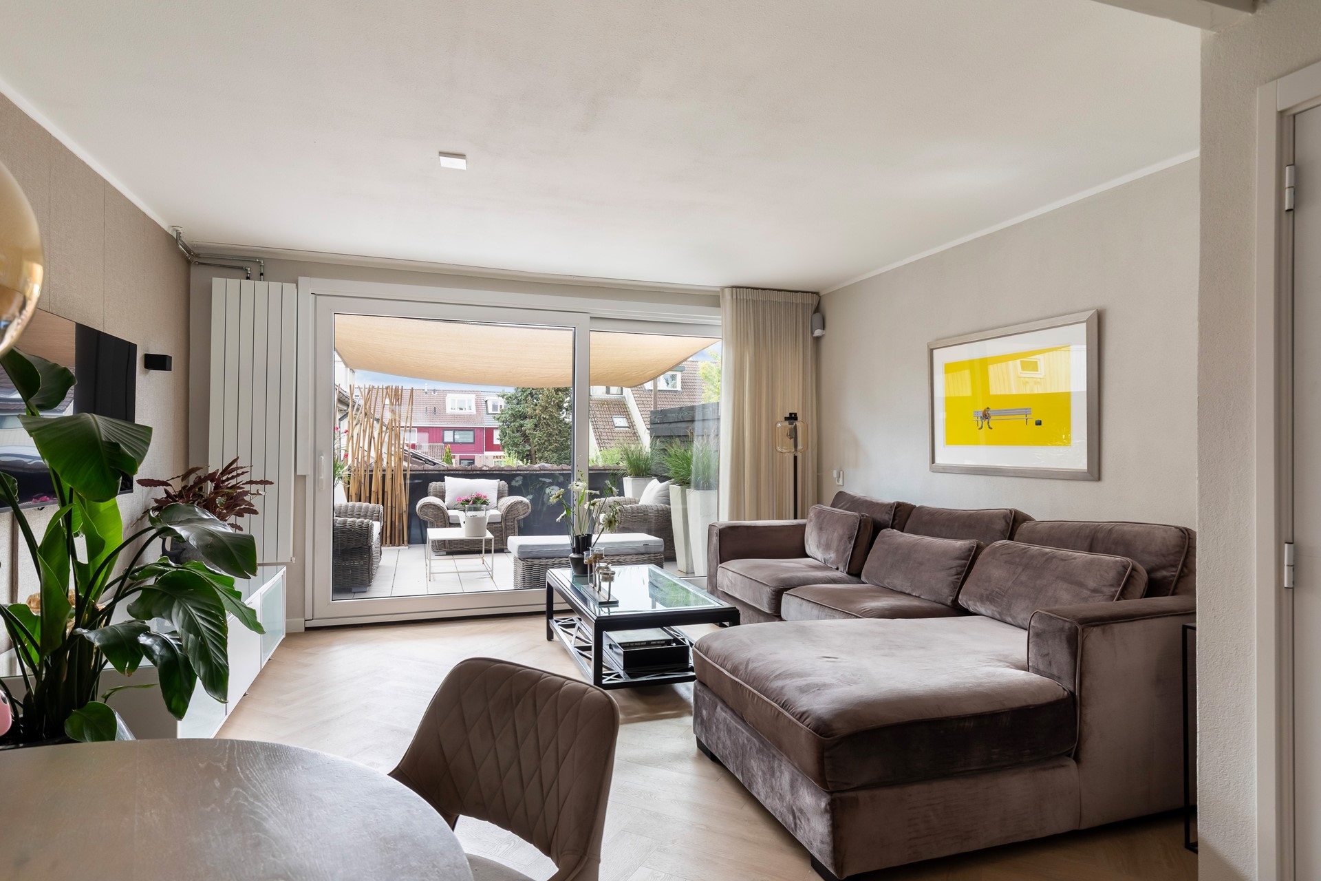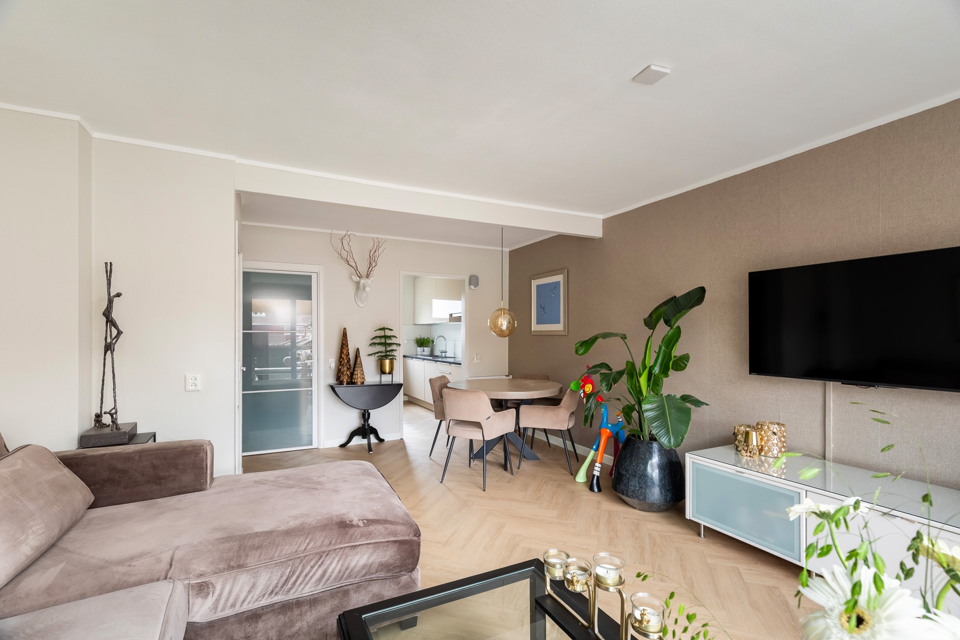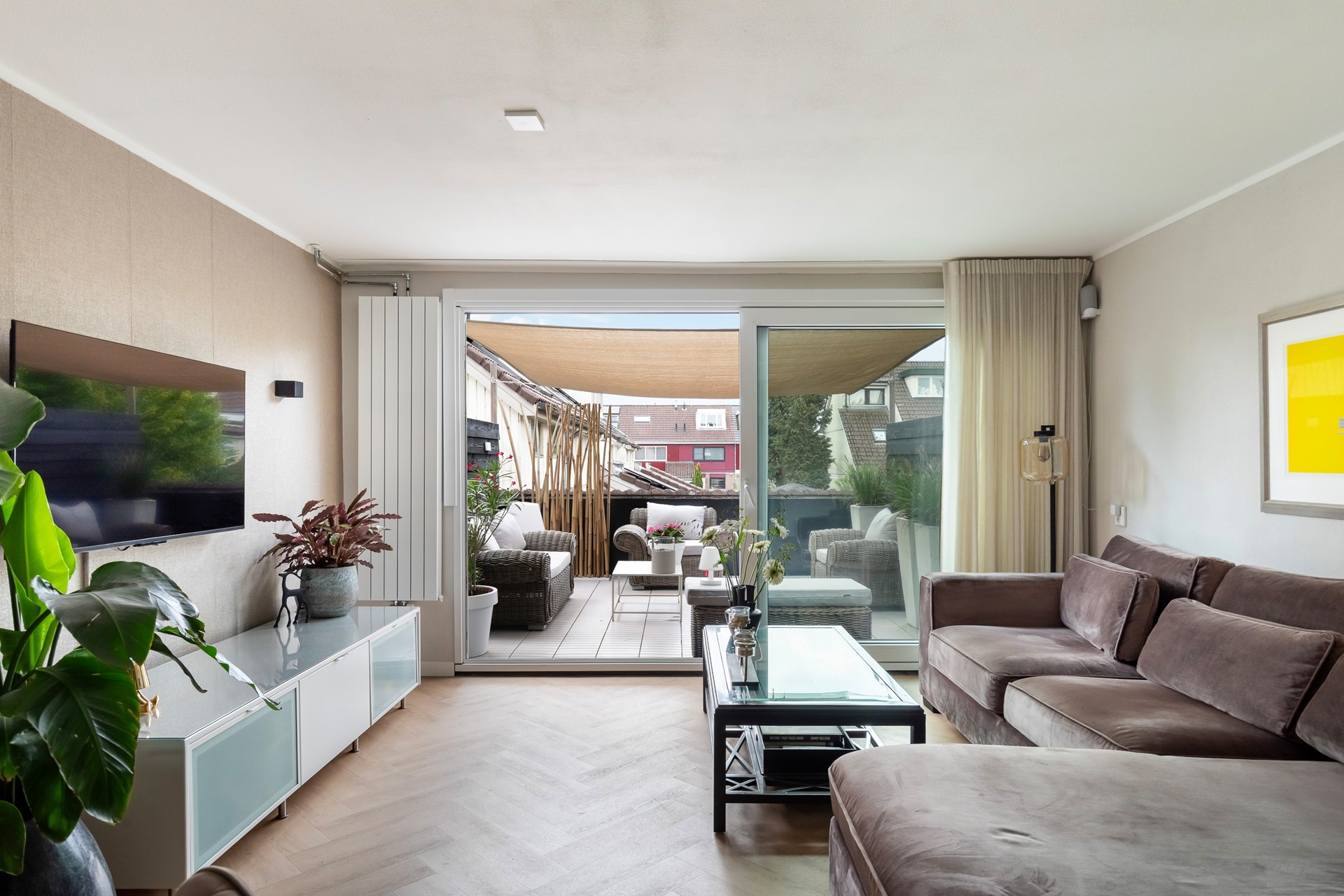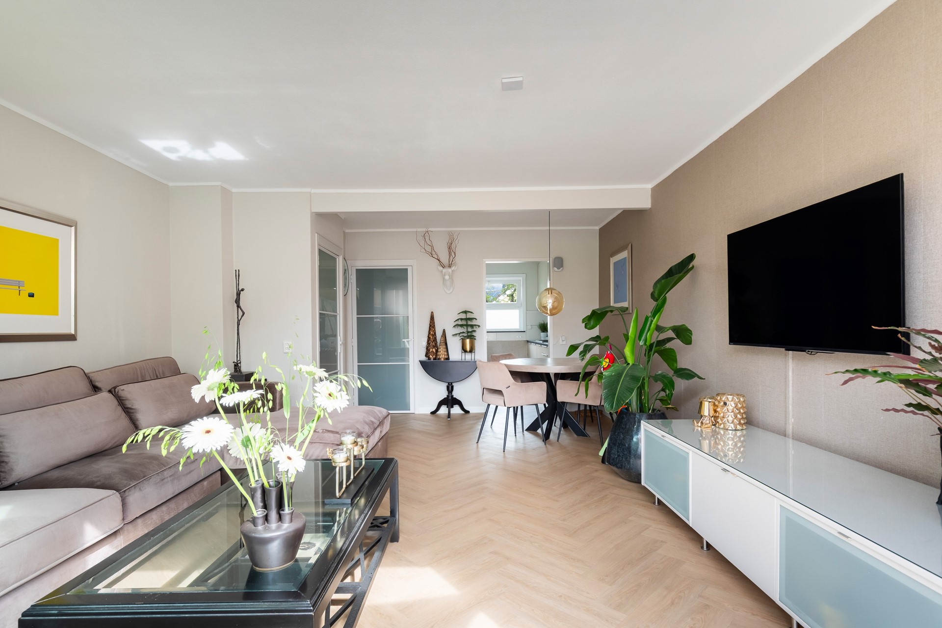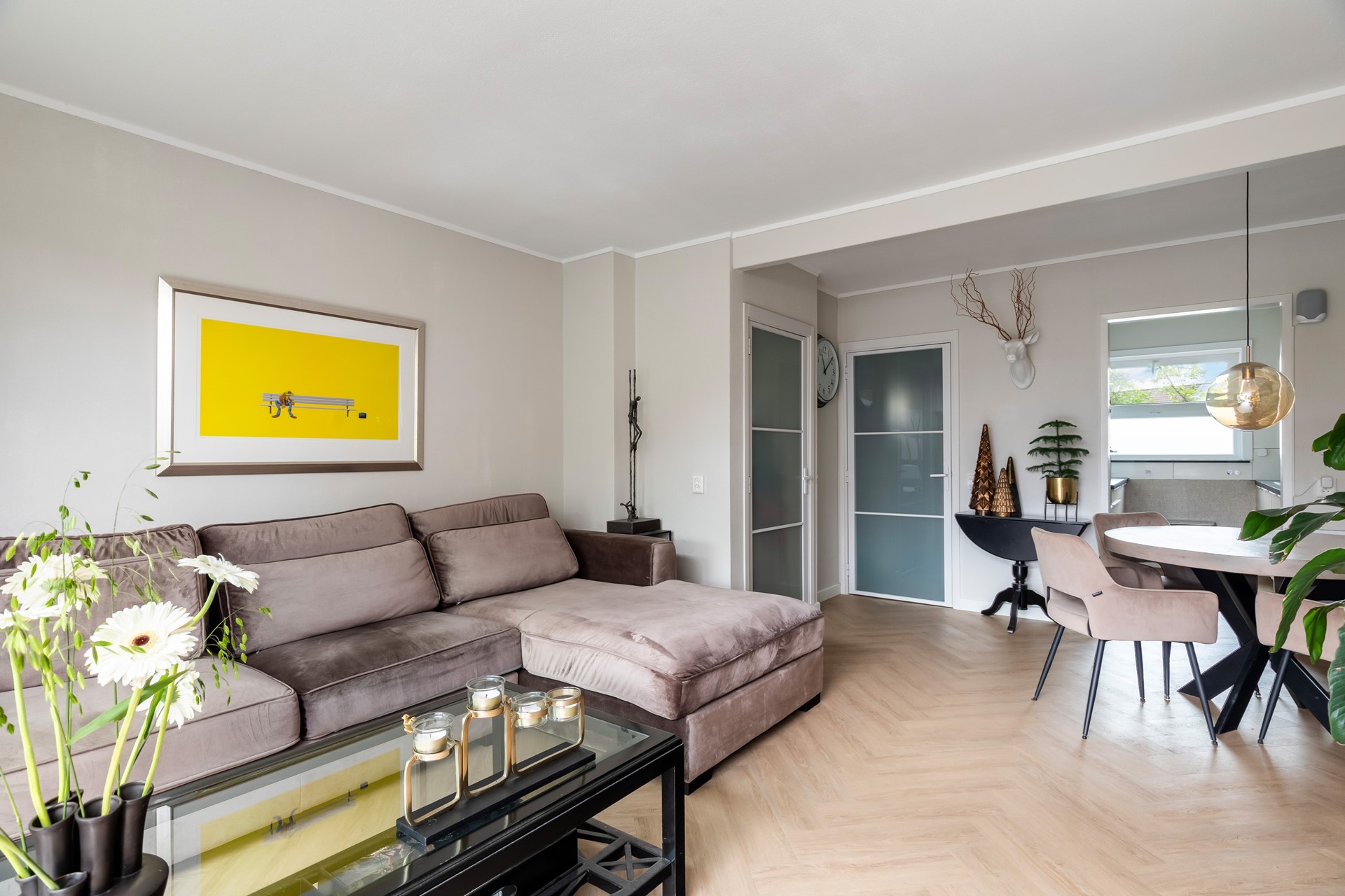 De lichte PVC-visgraatvloer benadrukt de lengte van de ruimte en geeft samen met de stalen deuren een moderne karakteristieke uitstraling. Tegelijkertijd zorgen de zachte kleuren op de wanden voor een warme en uitnodigende sfeer. De grote schuifpui brengt veel licht en een naadloze verbinding met het terras – ideaal om te relaxen of te borrelen met vrienden.