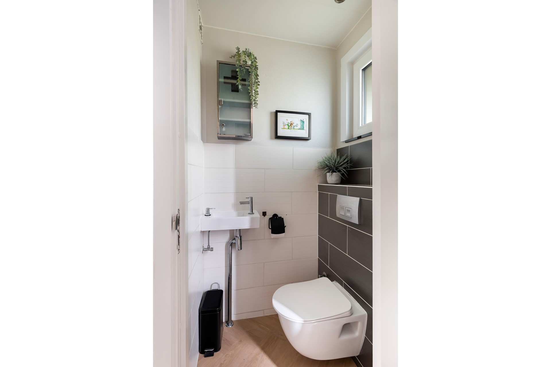 De half betegelde toiletruimte is voorzien van een wandcloset en een fonteintje. De pvc-visgraatvloer in de woonkamer is doorgelegd tot de hal en het toilet, hetgeen een verzorgde indruk geeft.