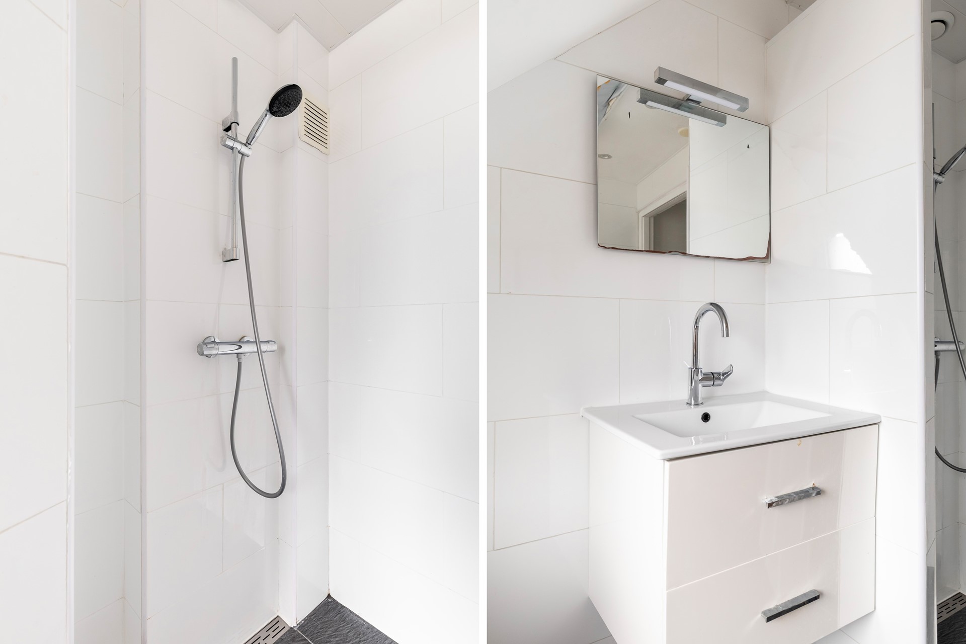 De betegelde badkamer is voorzien van een wastafelmeubel, designradiator, inloopdouche (voorzien van douche en geïntegreerde kranen). Hier bevindt zich tevens de aansluiting van de wasmachine. De dakkapel dient aan de binnenzijde nog verder te worden afgewerkt met tevens de mogelijkheid voor extra bergruimte achter de knieschotten.