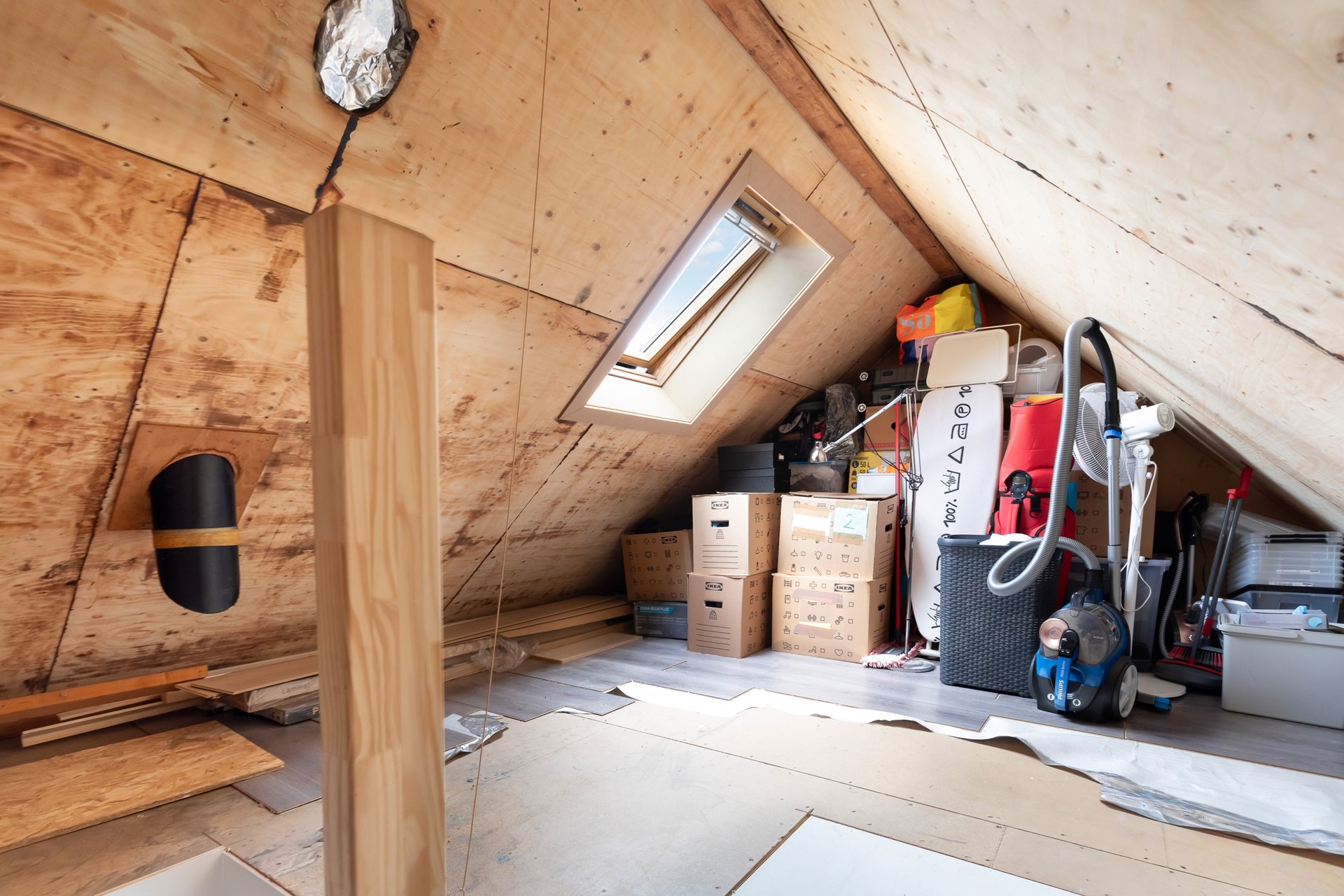 De vlizotrap is vervangen door een vaste trap, wat de toegankelijkheid aanzienlijk verbetert. Daarnaast is er een nieuw dakraam geplaatst, dat zorgt voor meer natuurlijke lichtinval. Naast bergruimte bevindt zich hier tevens de ophangplaats van de CV-combiketel. De CV ketel is in 2024 opnieuw geplaatst (Remeha).