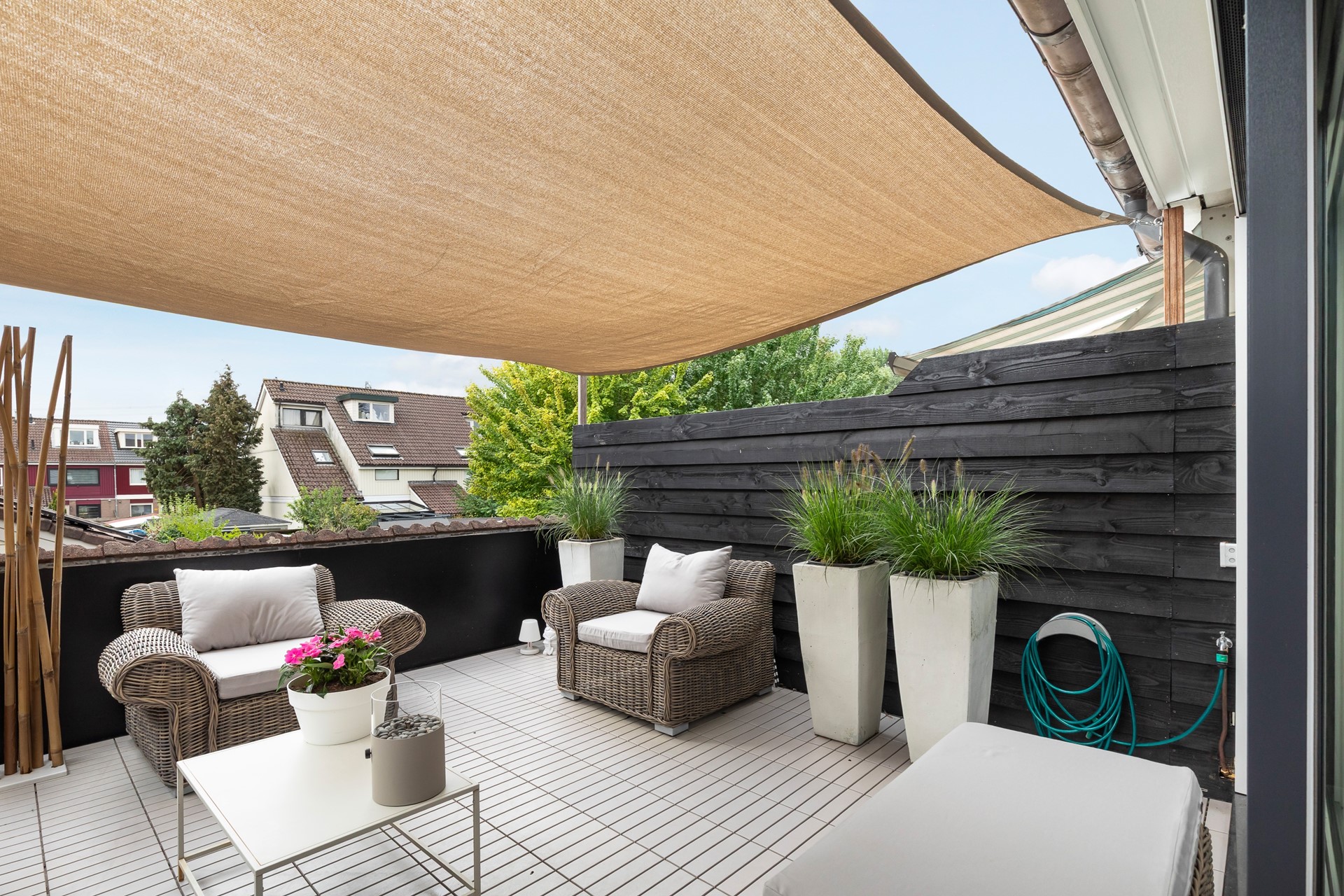 Vanuit de woonkamer loopt u via de riante schuifpui direct het royale dakterras op. Dit terras van maar liefst 20 m² is gelegen op het zonnige zuidoosten en biedt volop ruimte om te ontspannen en te genieten van het buitenleven. Het terras is recent voorzien van een nieuwe vloer en schutting. De staalconstructie boven de schuifpui is eveneens vernieuwd, wat zorgt voor een stevige en duurzame constructie.
