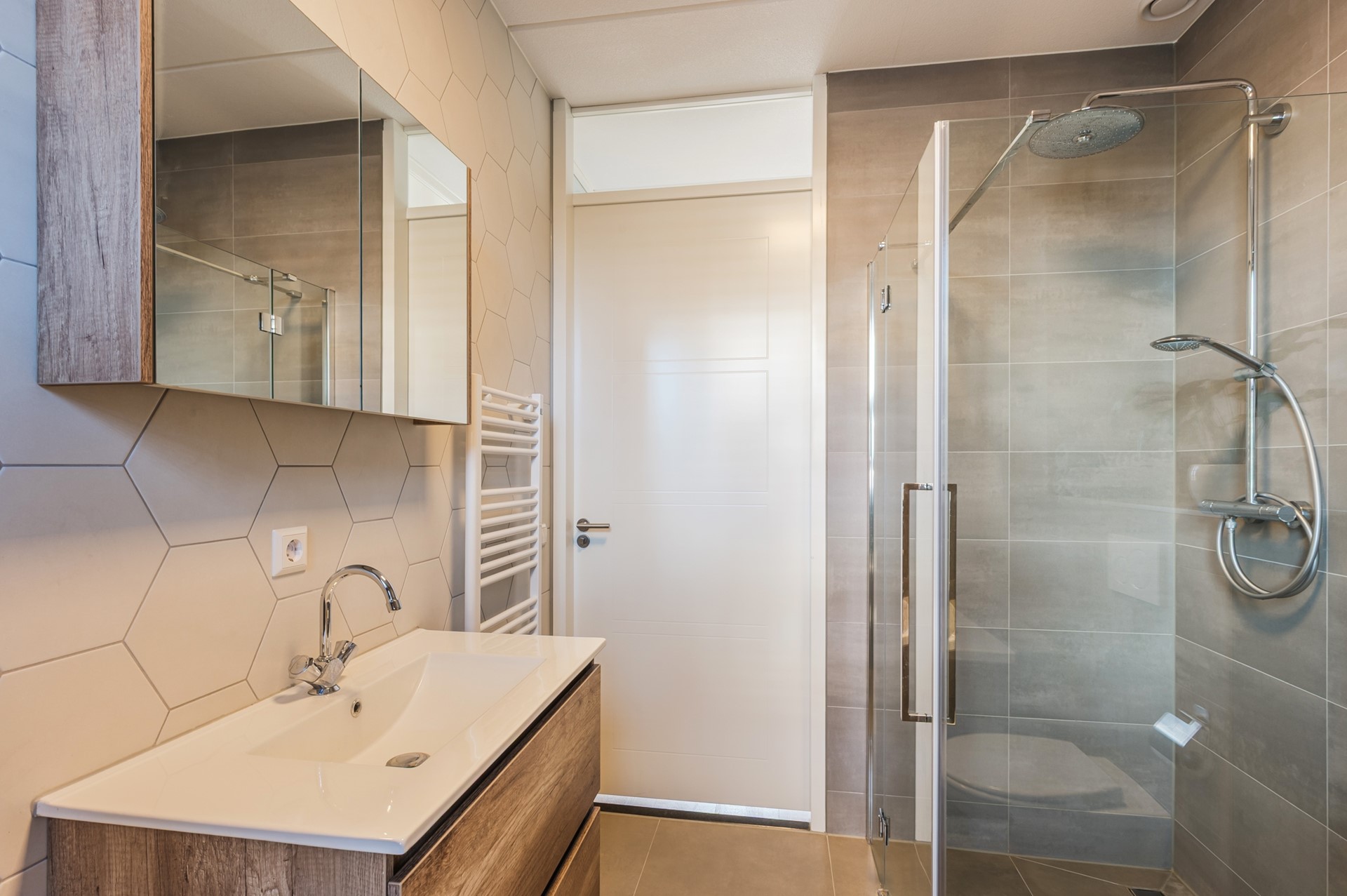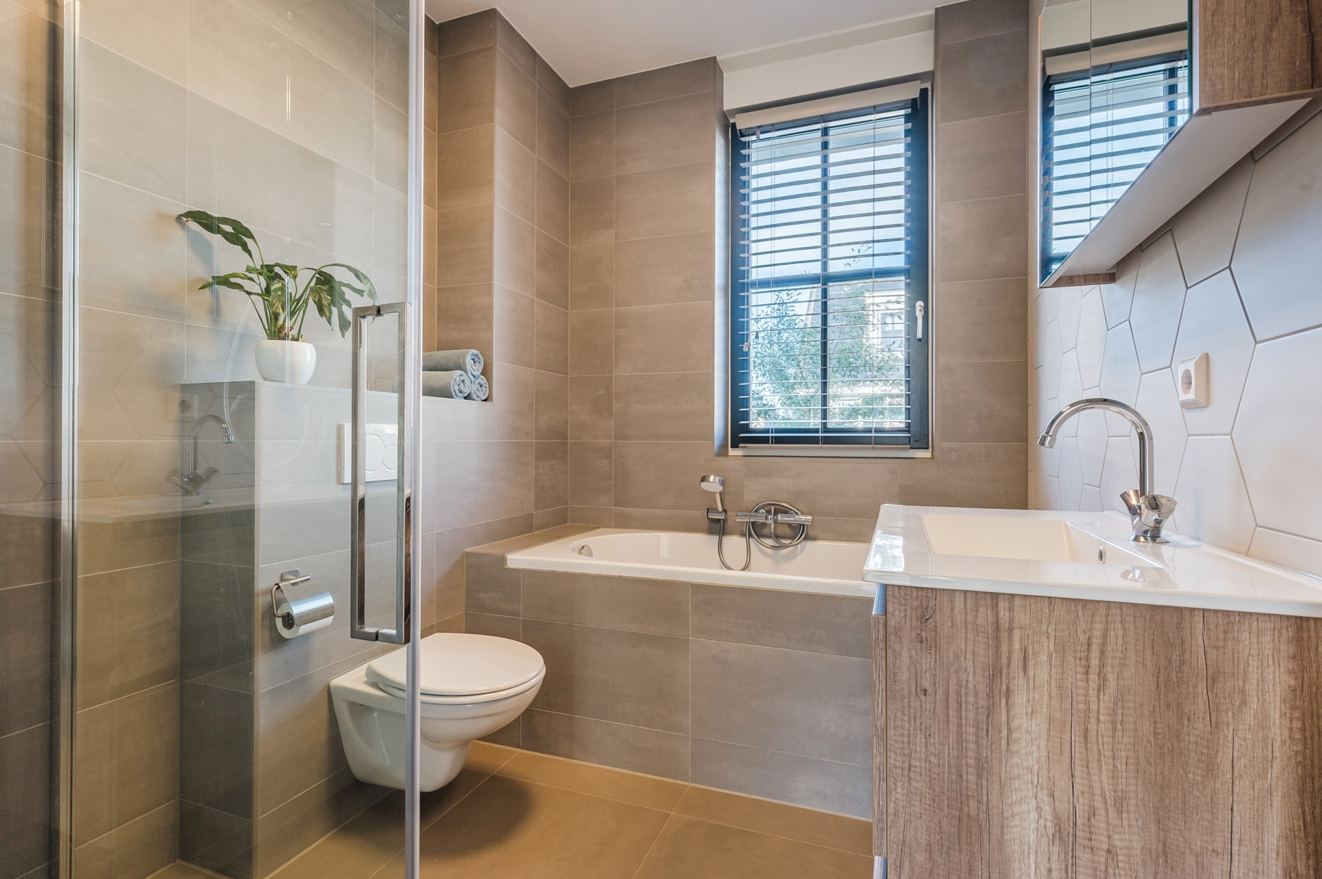 - Moderne badkamer met ligbad, inloopdouche, toilet en wastafelmeubel