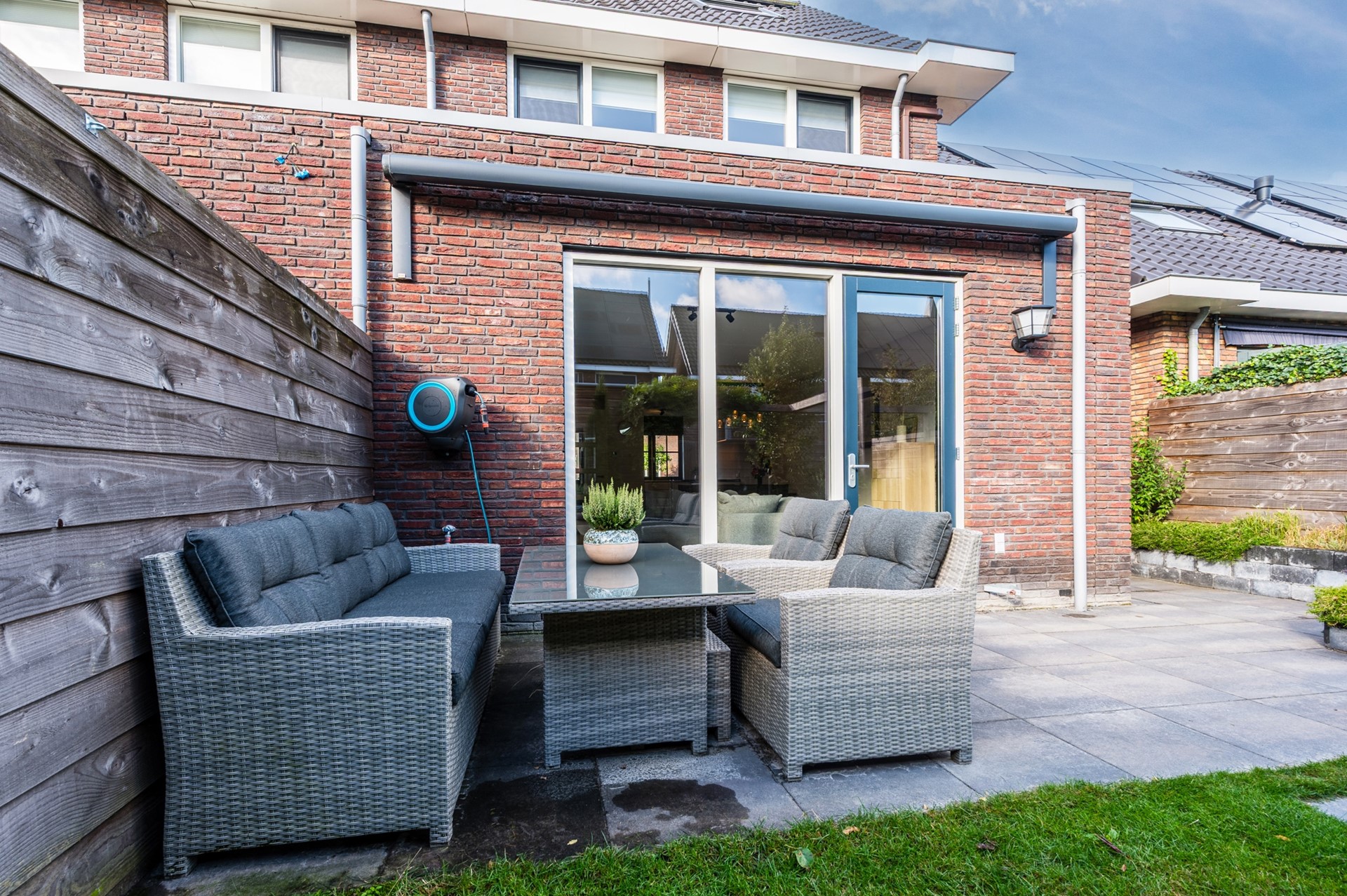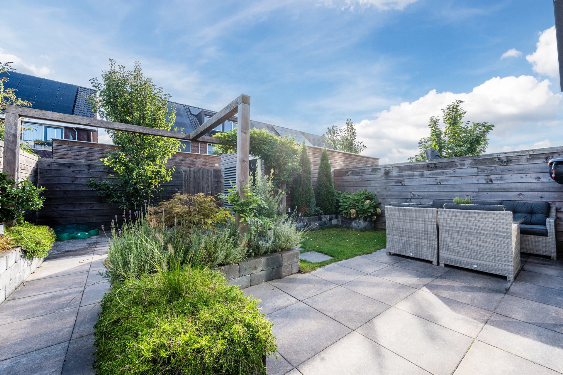 - Fraai aangelegde achtertuin, onderheid en voorzien van elektrisch zonnescherm