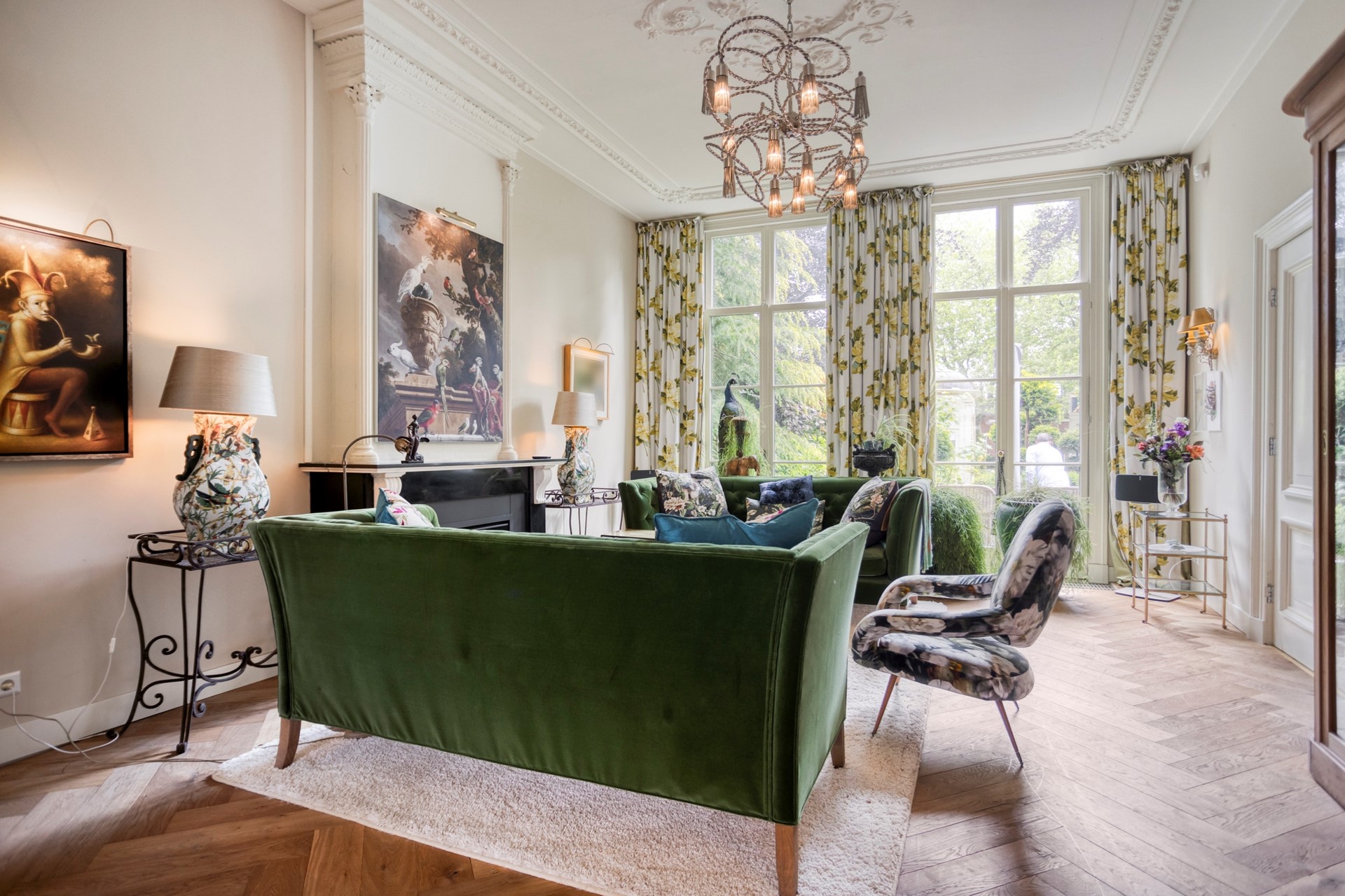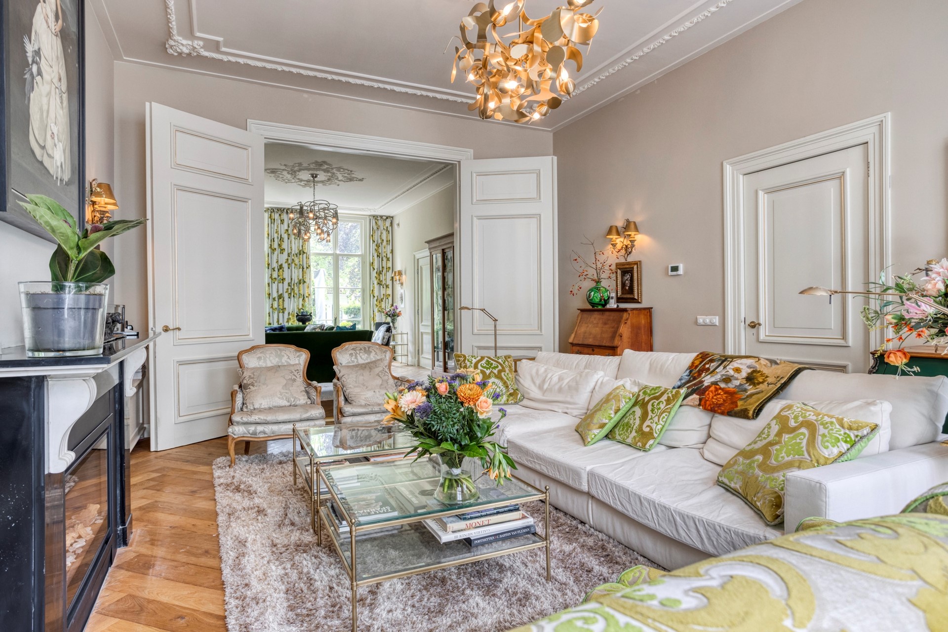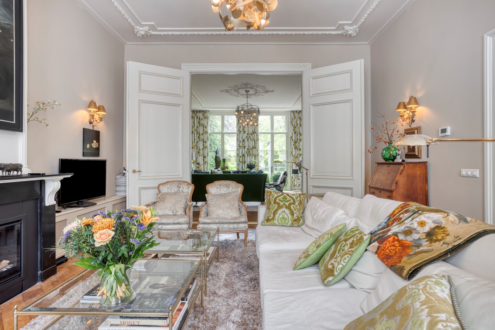 Via de kamer-en-suite deuren komt u in de achterkamer, gelijk maar iets groter dan de voorkamer. Ook hier zijn originele ornamenten en een gashaard aanwezig. Deze ruimte heeft een iets formeler karakter – ideaal voor ontvangst of ontspanning. Aan de achterzijde geven vier openslaande deuren, tot aan het plafond, toegang tot het terras.