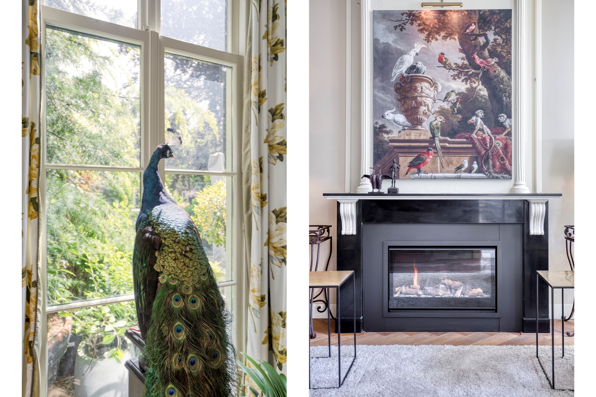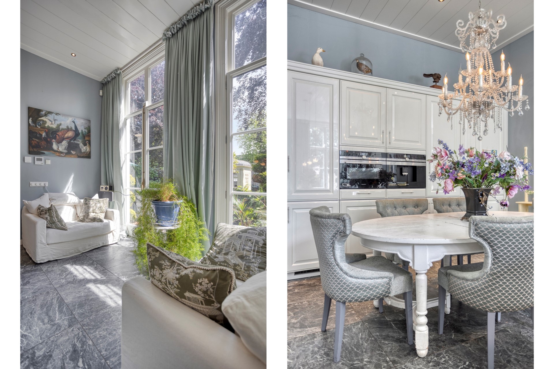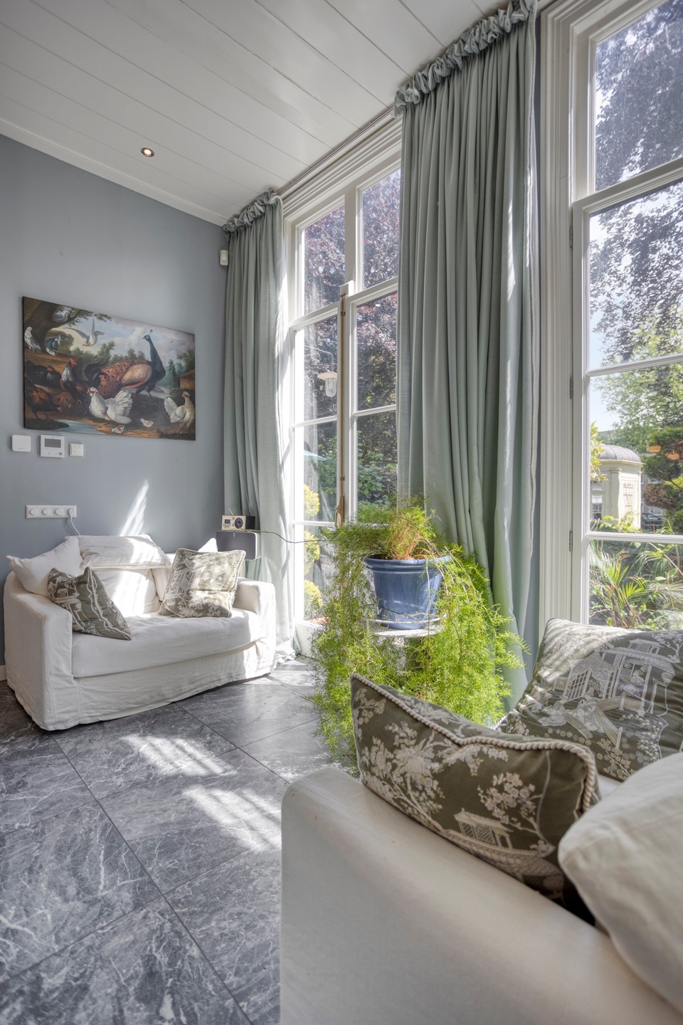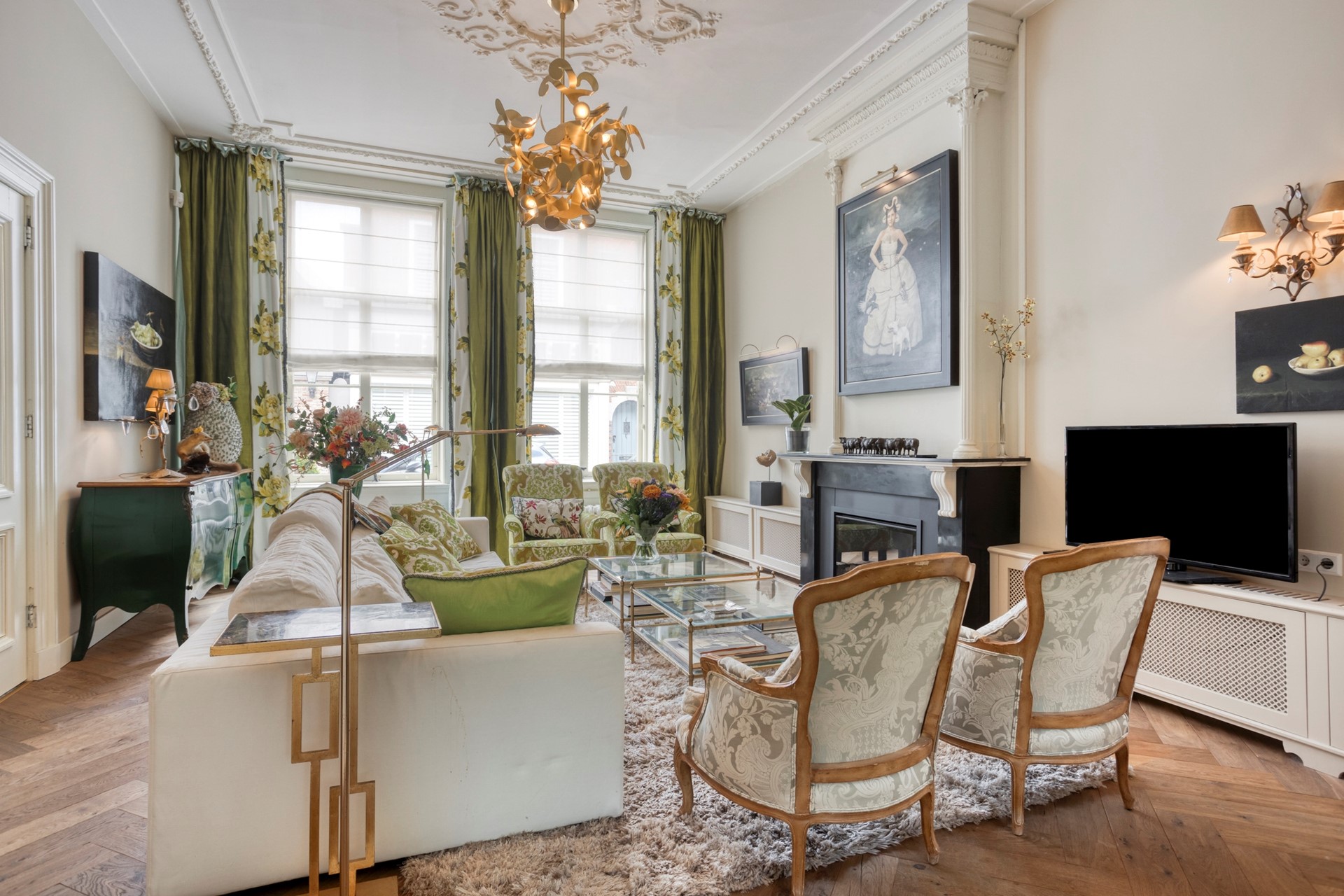 Via de kamer-en-suite deuren komt u in de achterkamer, gelijk maar iets groter dan de voorkamer. Ook hier zijn originele ornamenten en een gashaard aanwezig. Deze ruimte heeft een iets formeler karakter – ideaal voor ontvangst of ontspanning. Aan de achterzijde geven vier openslaande deuren, tot aan het plafond, toegang tot het terras.