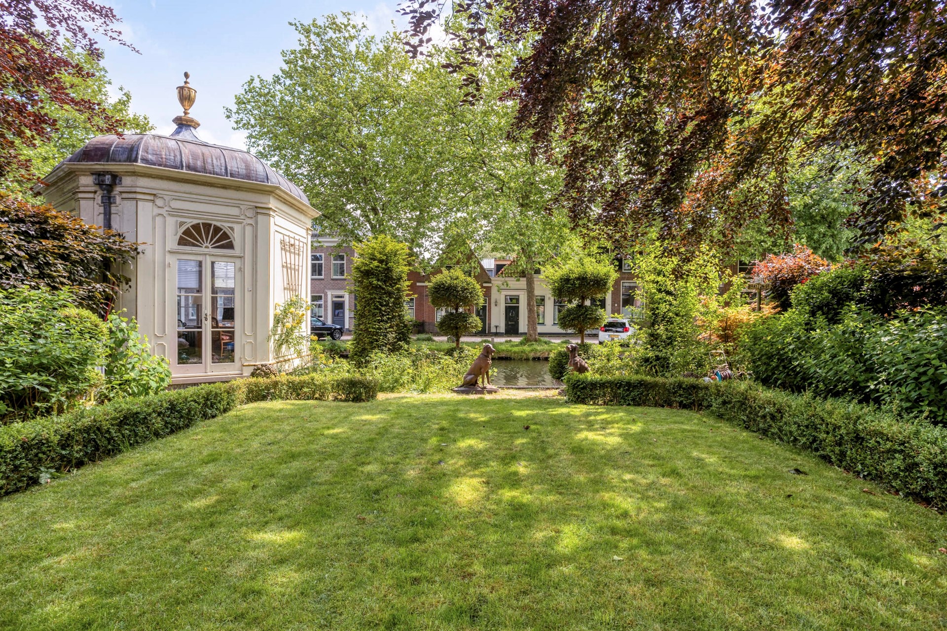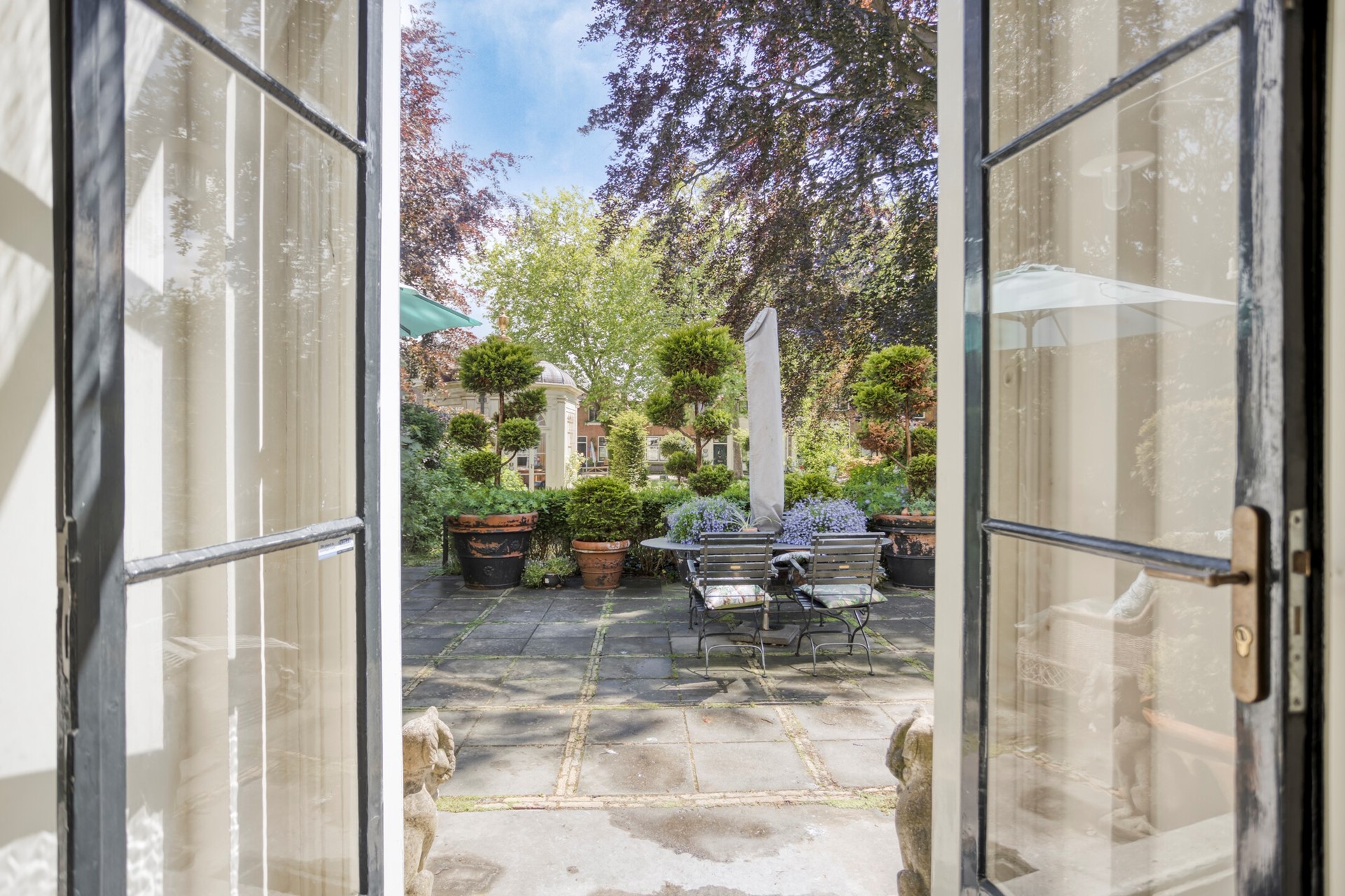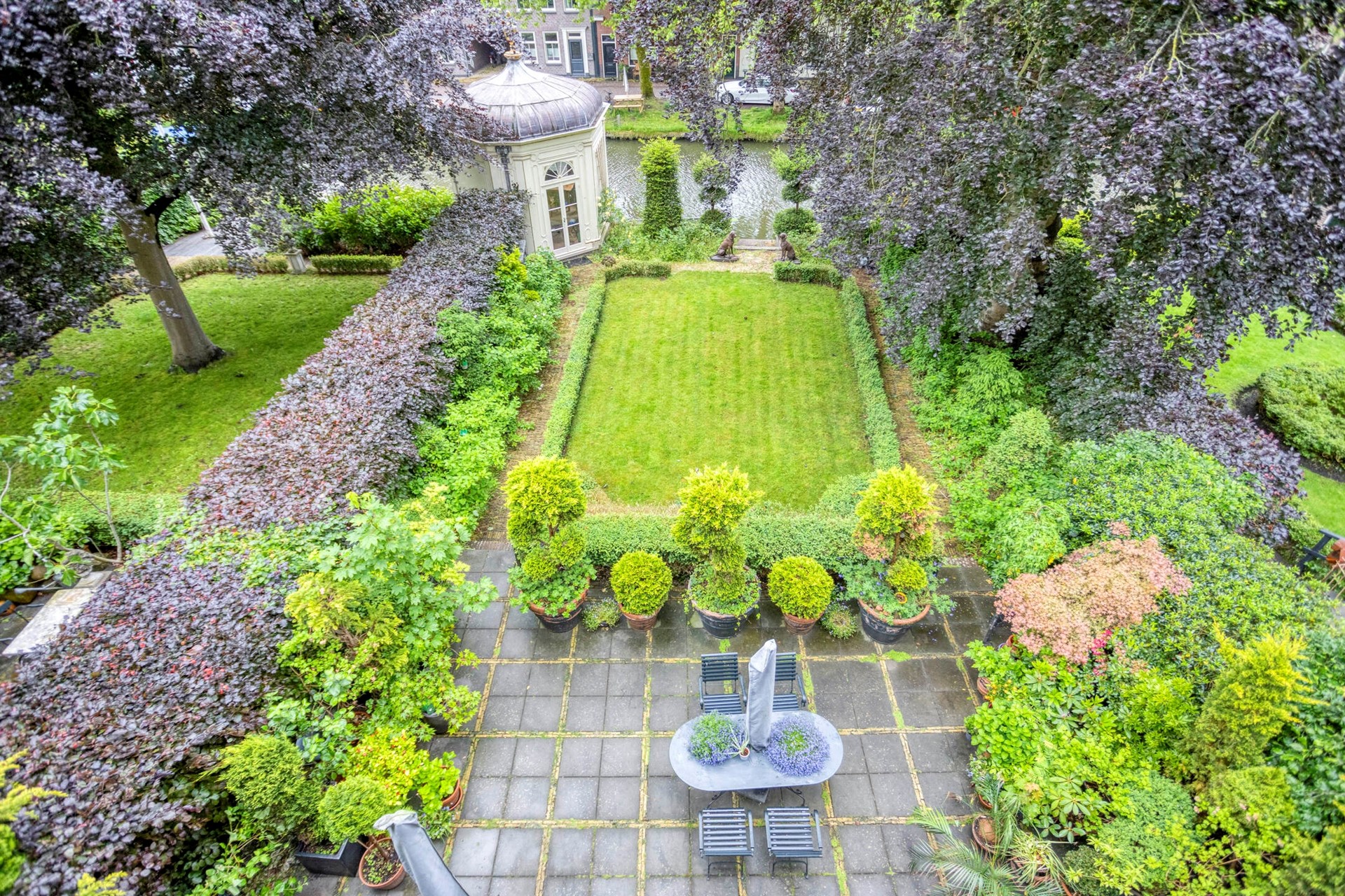 Via een tweede stalen deur in de hal bereikt u de tuin. U stapt het zuidoostelijk gelegen terras op. De tuin, die een beschermd ontwerp kent, past perfect bij het statige karakter van het huis. Aan de grachtzijde bevindt zich het voormalige ‘theehuis’, waar in het verleden informeel bezoek formeel werd ontvangen. Tegenwoordig fungeert het als kantoor, met een fenomenaal uitzicht over de gracht.
