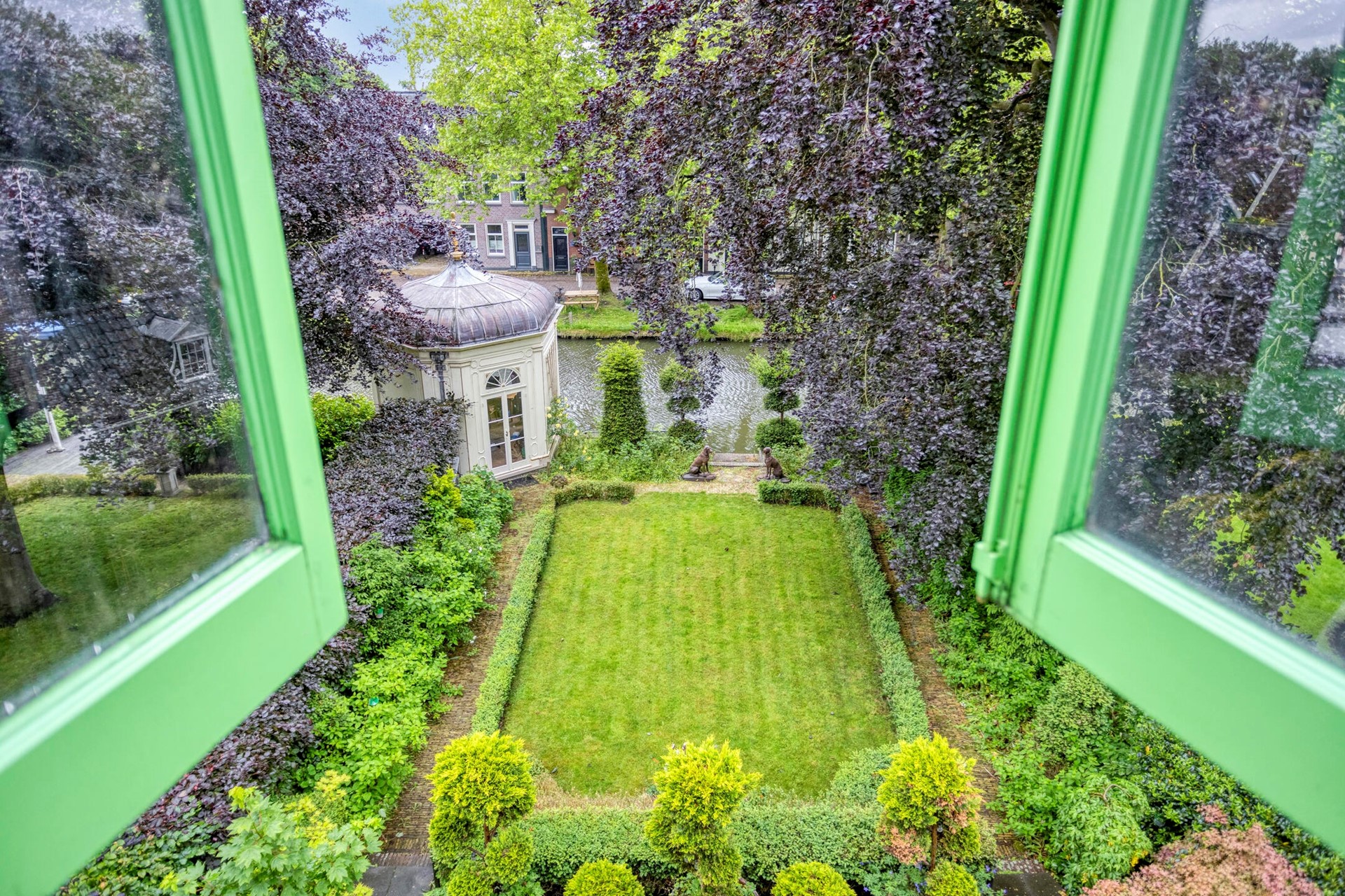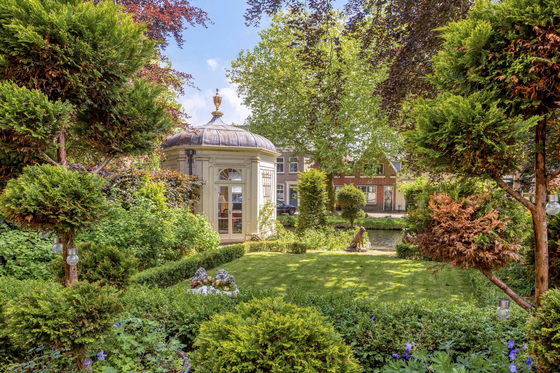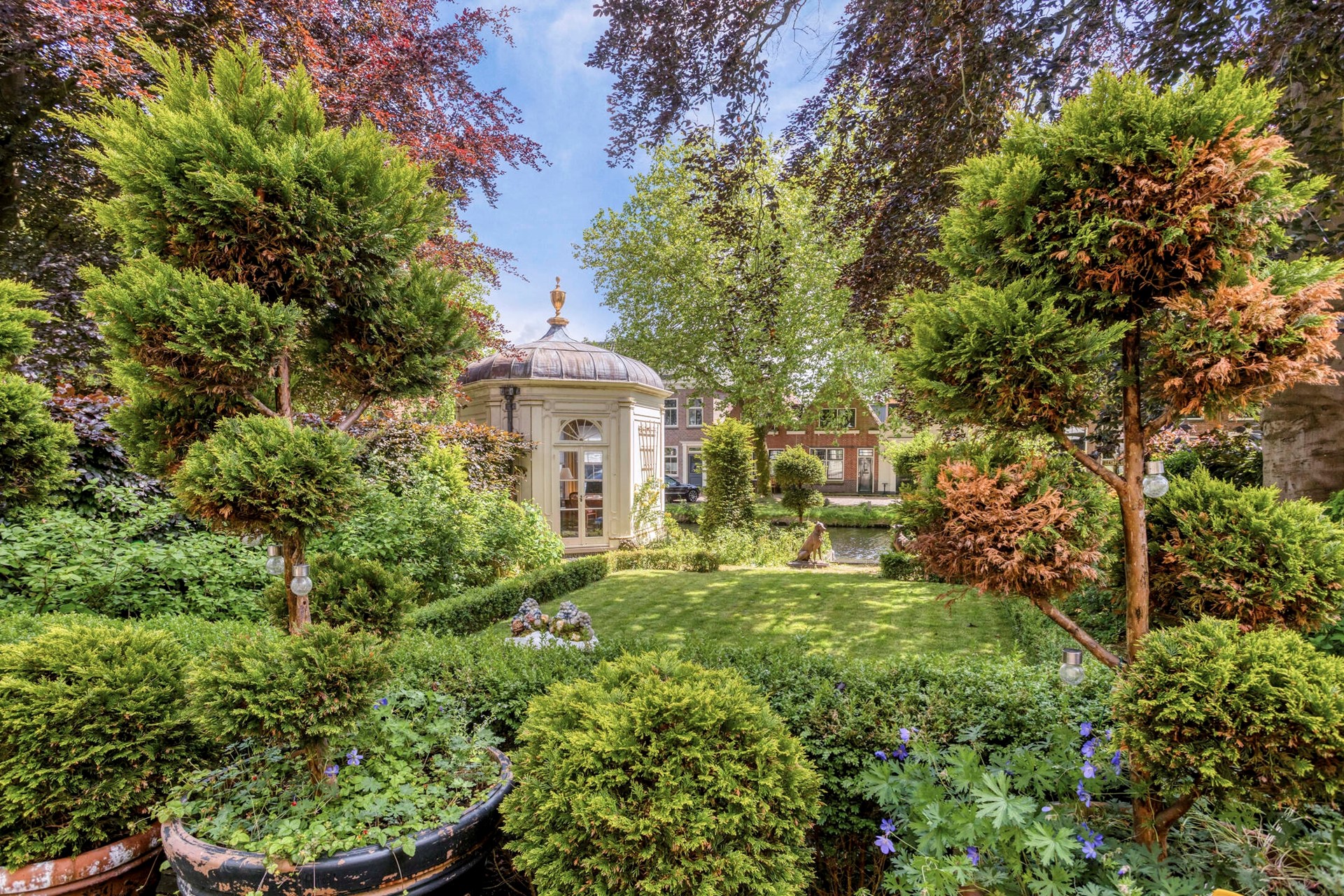 Via een tweede stalen deur in de hal bereikt u de tuin. U stapt het zuidoostelijk gelegen terras op. De tuin, die een beschermd ontwerp kent, past perfect bij het statige karakter van het huis. Aan de grachtzijde bevindt zich het voormalige ‘theehuis’, waar in het verleden informeel bezoek formeel werd ontvangen. Tegenwoordig fungeert het als kantoor, met een fenomenaal uitzicht over de gracht.