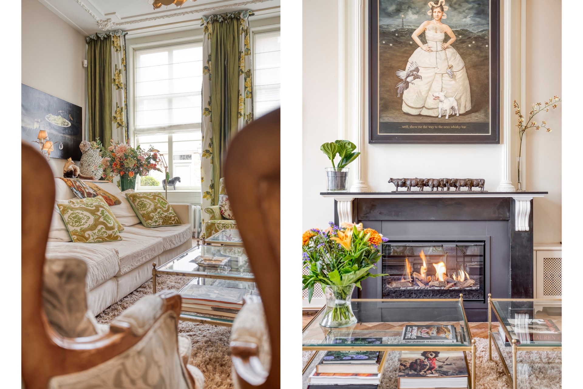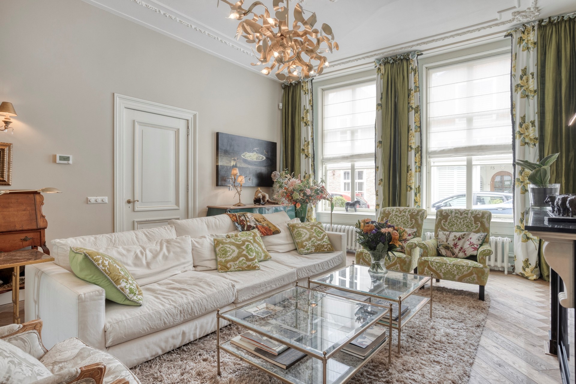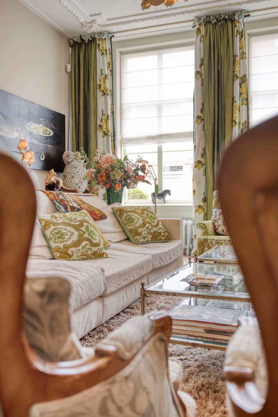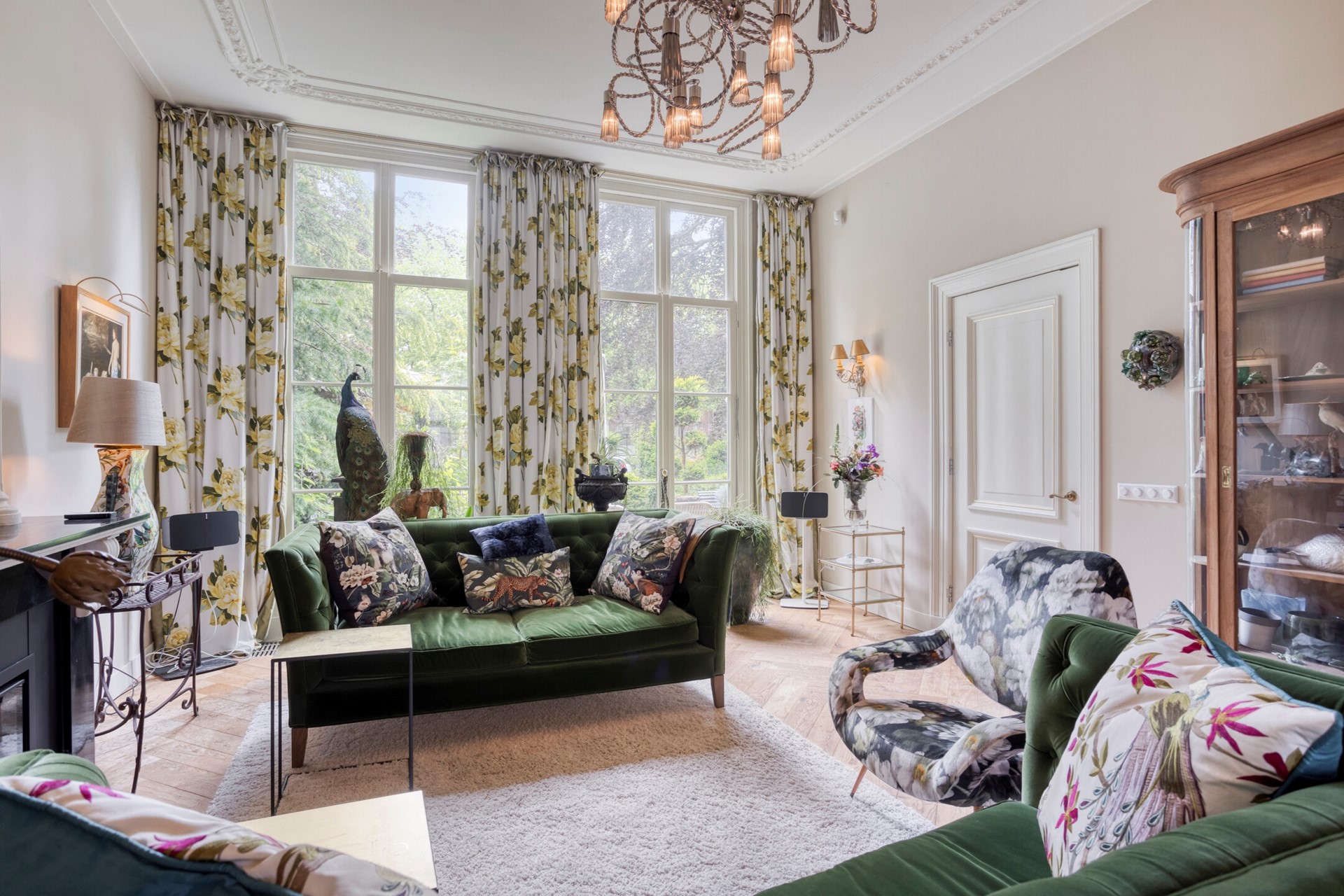 De eerste ruimte aan de halzijde is de voorkamer, thans in gebruik als woonkamer. Het royale formaat springt meteen in het oog. De kamer is ingericht met een 3 meter lange bank en biedt ruimte aan meerdere comfortabele zitmeubels. Originele plafondornamenten en een fraai vormgegeven gashaard geïntegreerd in de schouw versterken het karakter van de ruimte. De grote ramen aan de voorzijde hebben prachtig bewerkt houtwerk, en de originele binnen luiken zijn discreet weggewerkt in de wanden. Uiteraard ontbreekt de eikenhouten visgraatvloer hier niet.