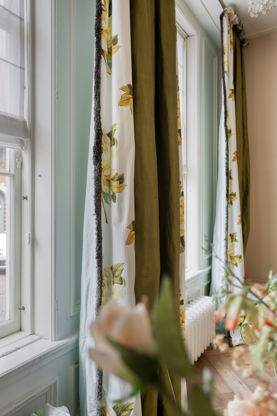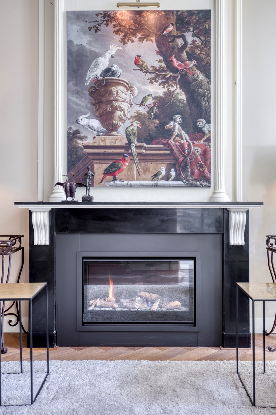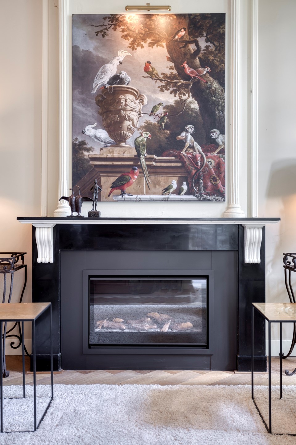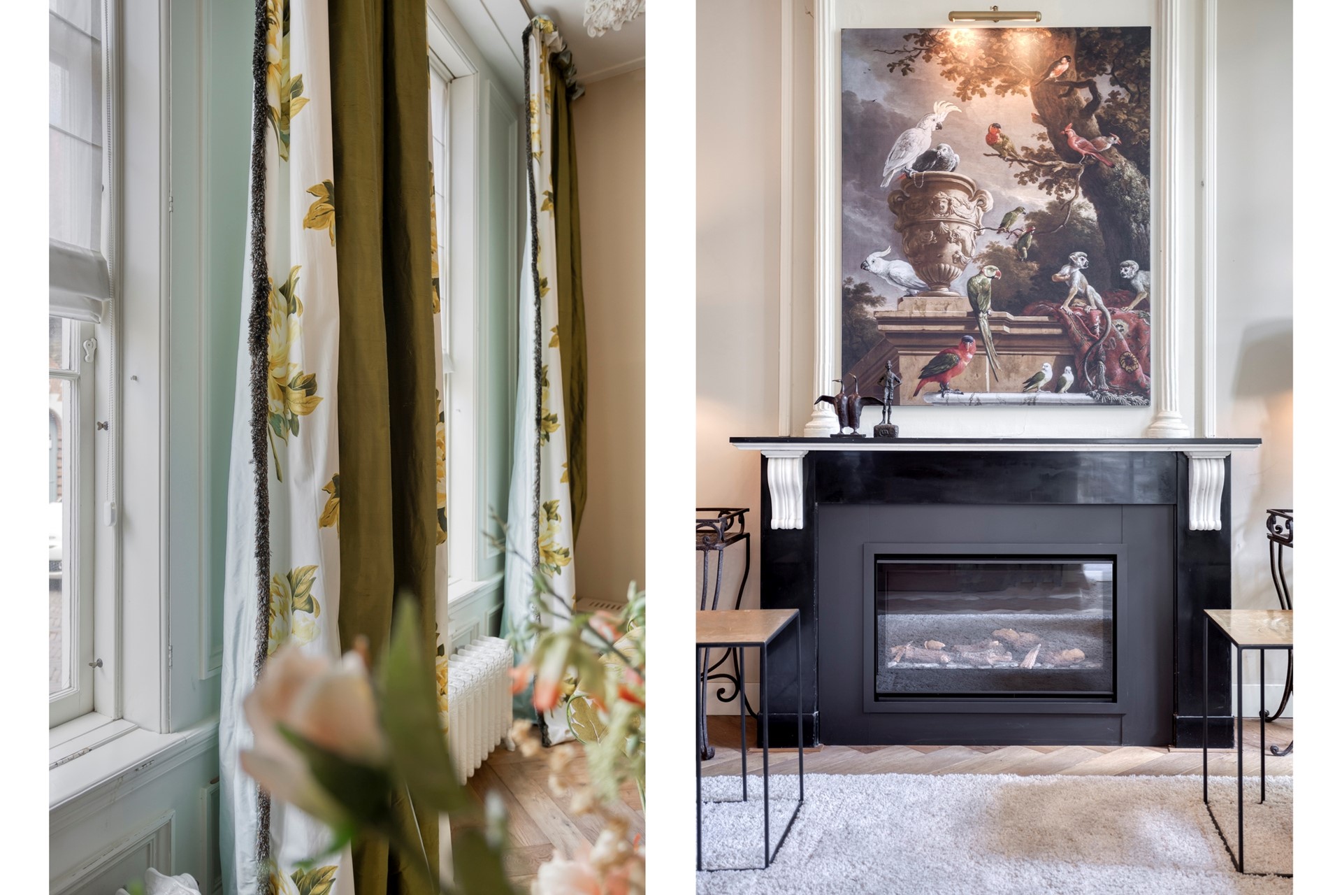 De eerste ruimte aan de halzijde is de voorkamer, thans in gebruik als woonkamer. Het royale formaat springt meteen in het oog. De kamer is ingericht met een 3 meter lange bank en biedt ruimte aan meerdere comfortabele zitmeubels. Originele plafondornamenten en een fraai vormgegeven gashaard geïntegreerd in de schouw versterken het karakter van de ruimte. De grote ramen aan de voorzijde hebben prachtig bewerkt houtwerk, en de originele binnen luiken zijn discreet weggewerkt in de wanden. Uiteraard ontbreekt de eikenhouten visgraatvloer hier niet.