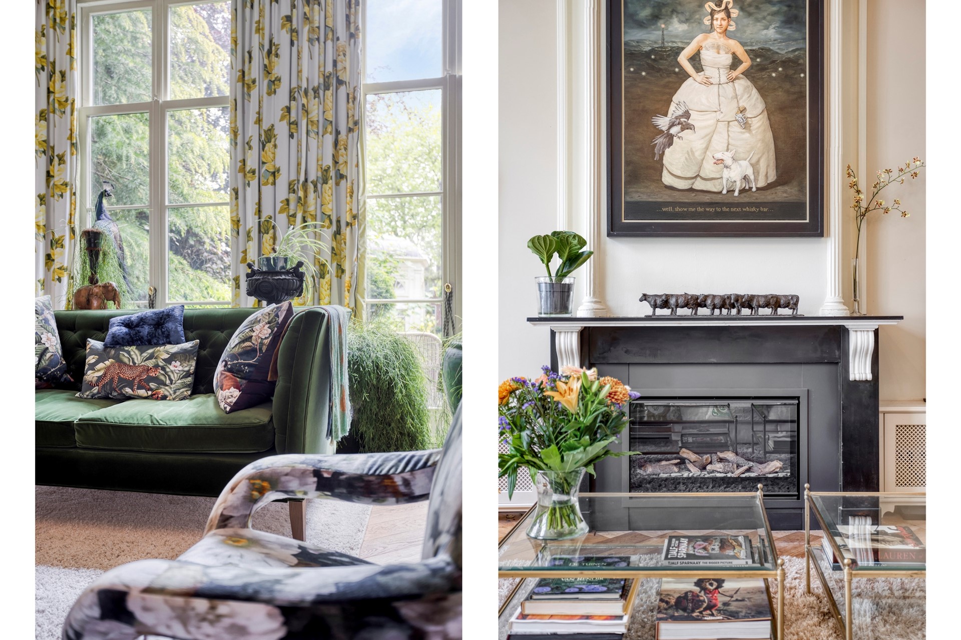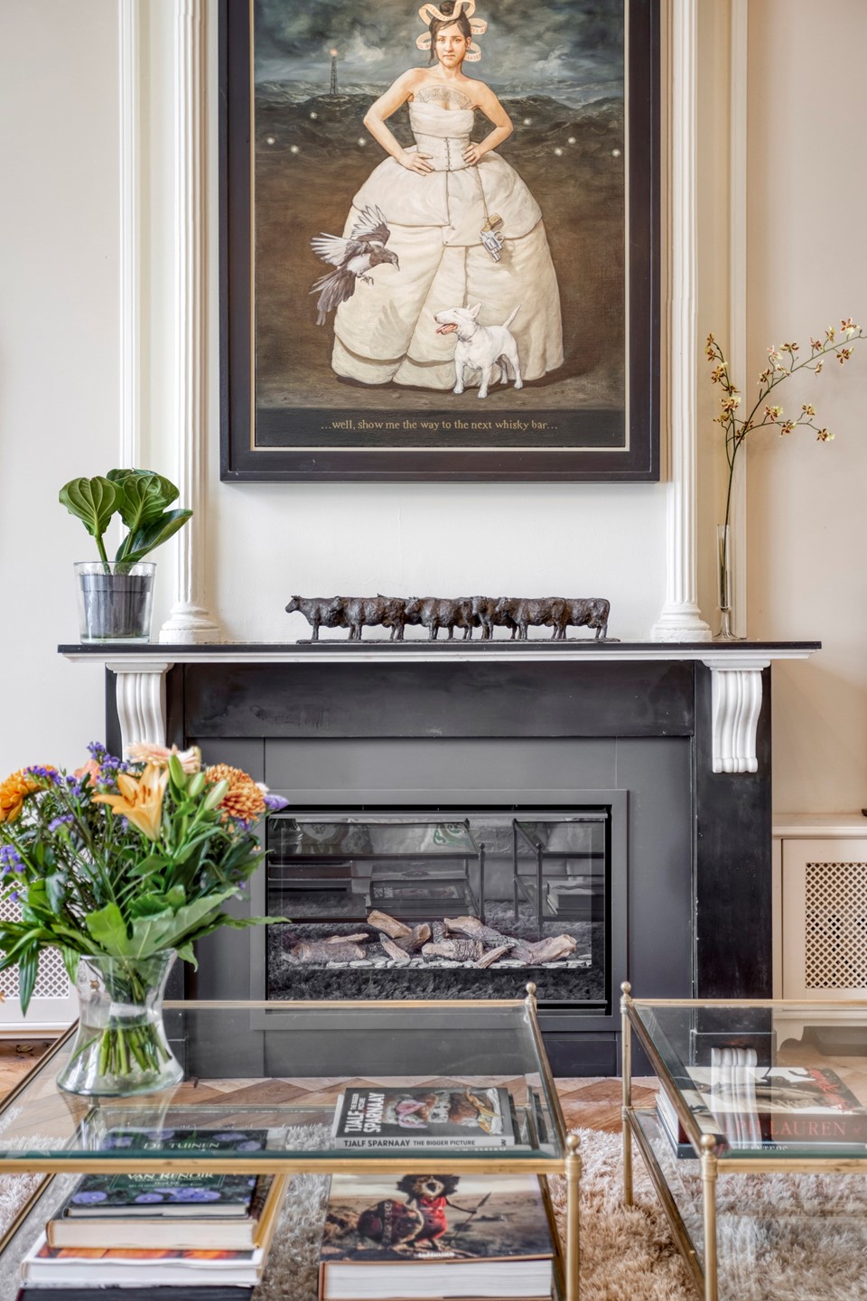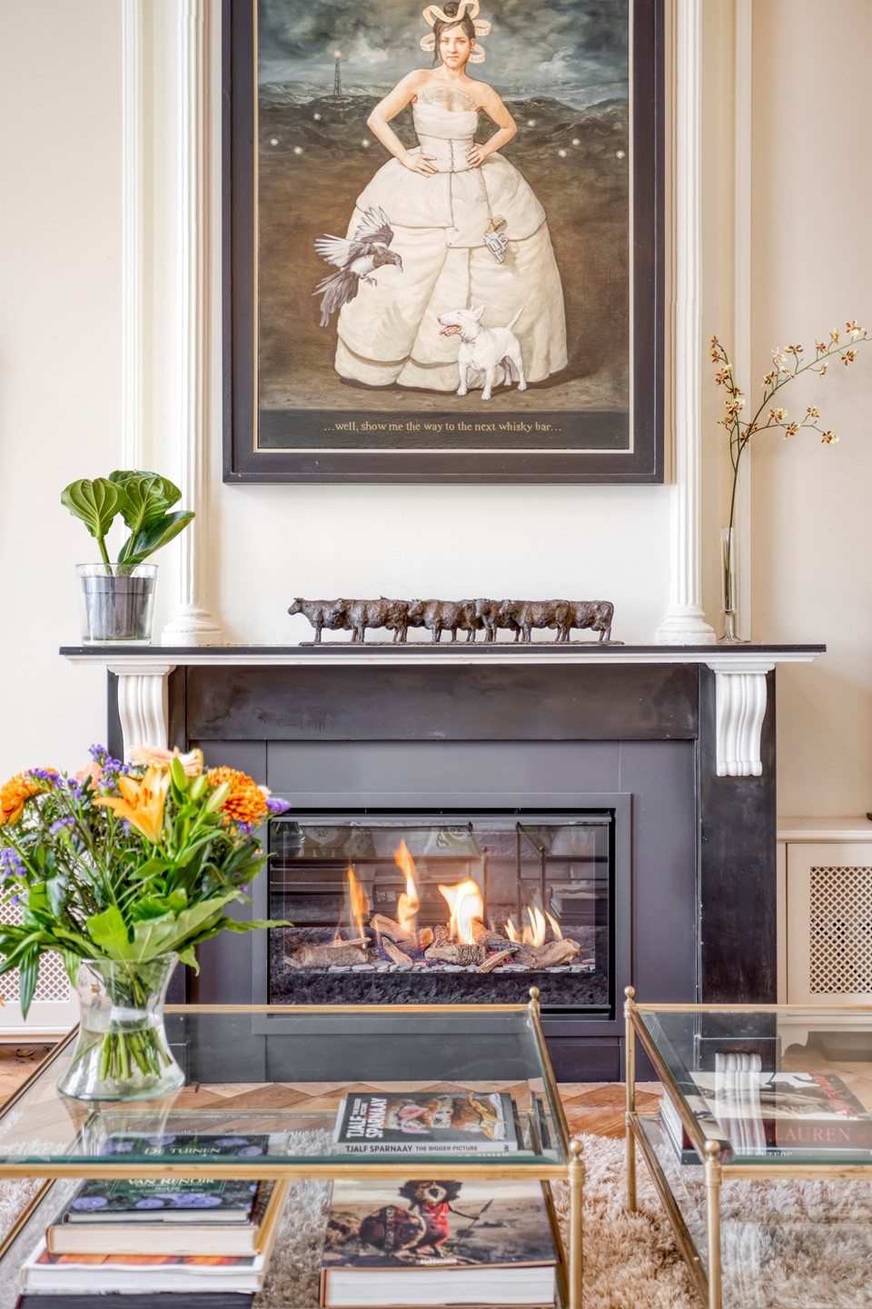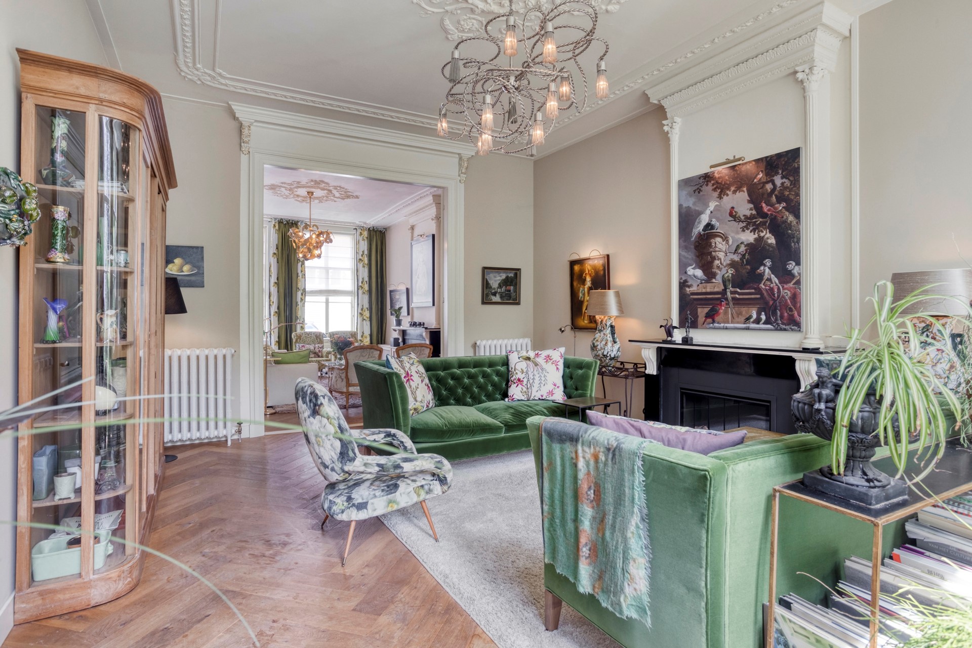 De eerste ruimte aan de halzijde is de voorkamer, thans in gebruik als woonkamer. Het royale formaat springt meteen in het oog. De kamer is ingericht met een 3 meter lange bank en biedt ruimte aan meerdere comfortabele zitmeubels. Originele plafondornamenten en een fraai vormgegeven gashaard geïntegreerd in de schouw versterken het karakter van de ruimte. De grote ramen aan de voorzijde hebben prachtig bewerkt houtwerk, en de originele binnen luiken zijn discreet weggewerkt in de wanden. Uiteraard ontbreekt de eikenhouten visgraatvloer hier niet.