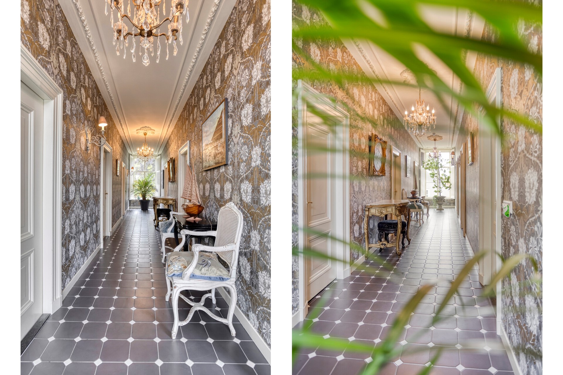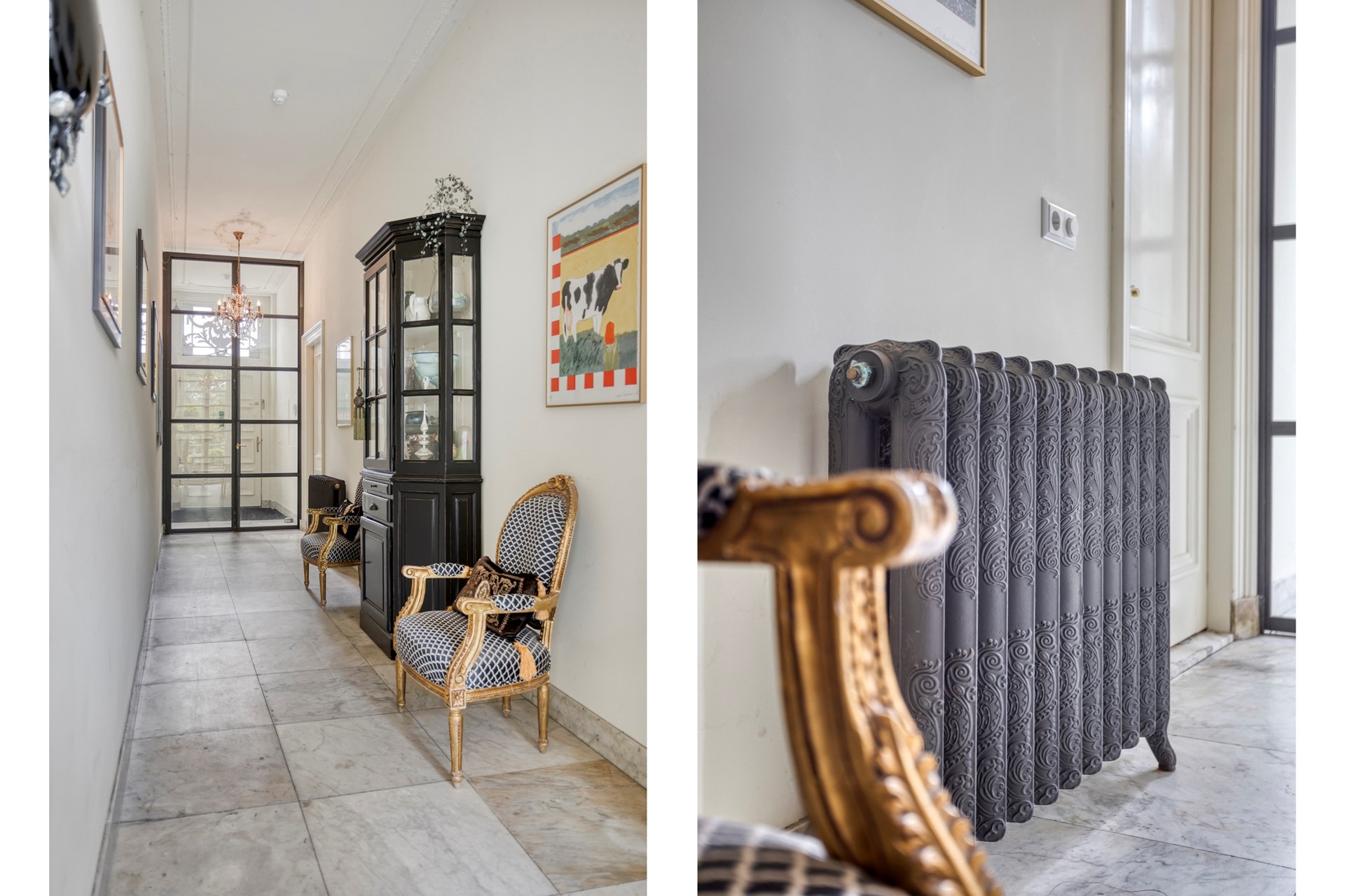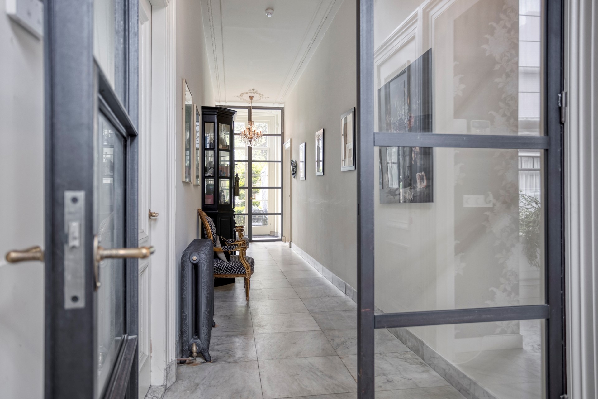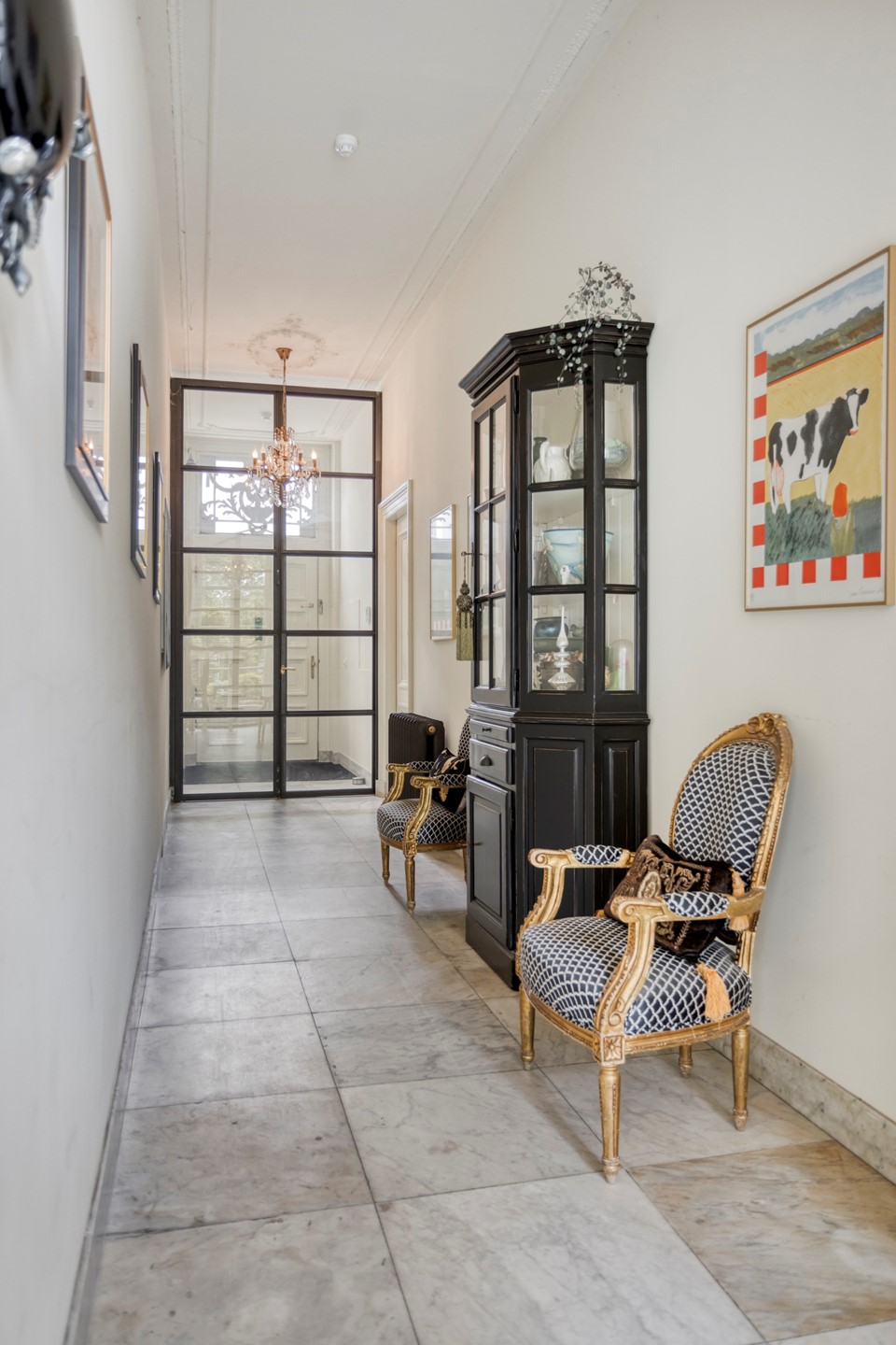 Achter de brede voordeur bevindt zich een royale hal die de volledige diepte van de woning beslaat. De vloer is voorzien van originele witmarmeren plavuizen. Aan weerszijden zijn hoge, stalen deuren van maar liefst 4,20 meter geplaatst — voorzien van glazen ramen, waardoor het licht vrij spel heeft. Rechts vindt u de ruime garderobe en het eerste toilet, evenals de toegang tot de trap en lift naar de boven gelegen verdiepingen.