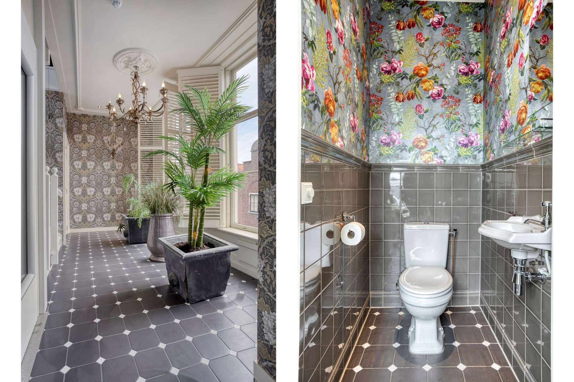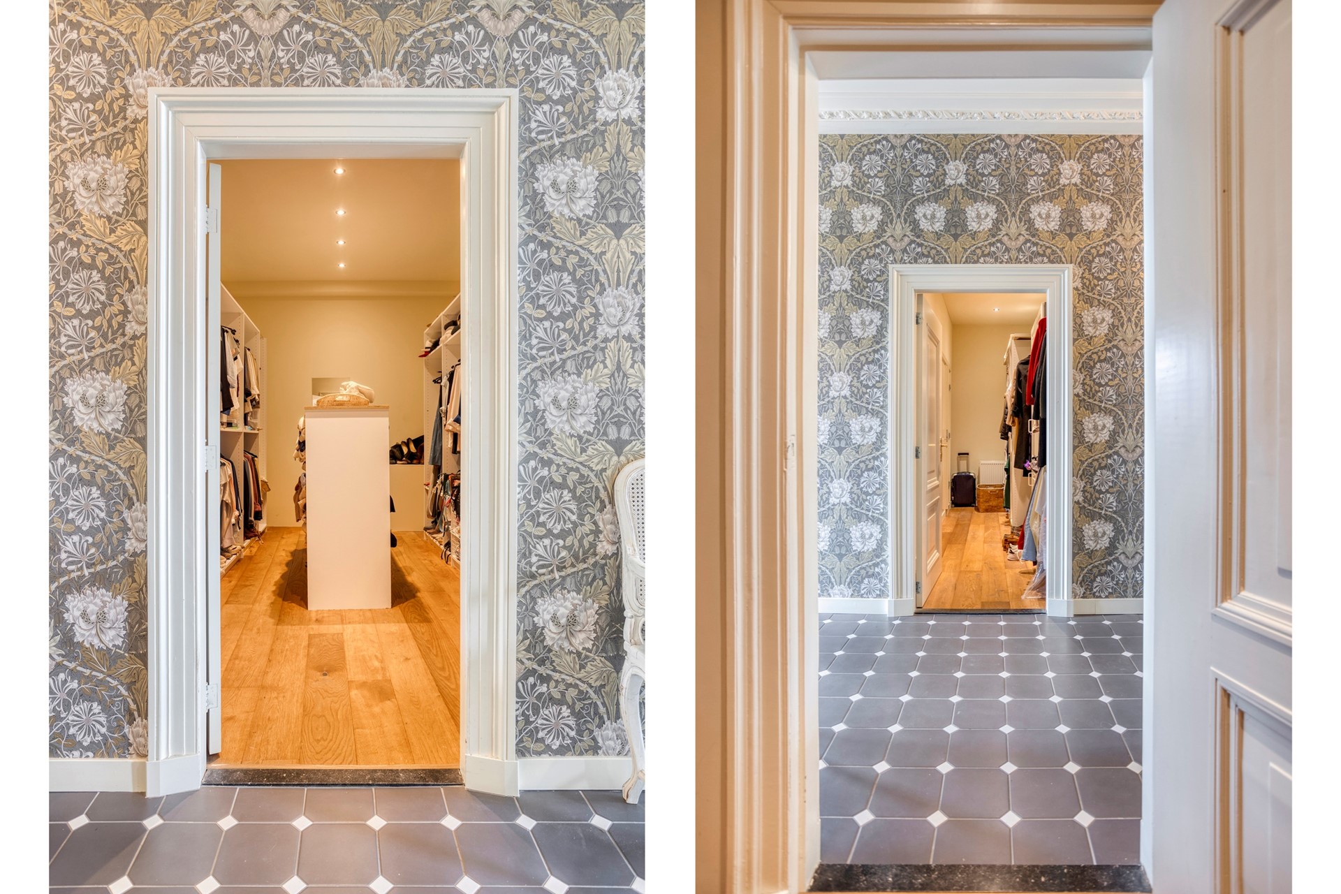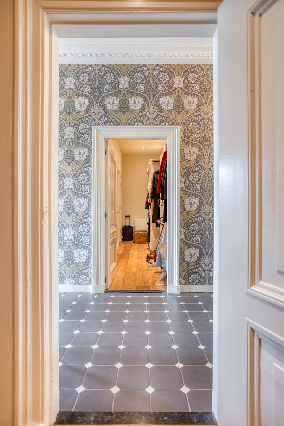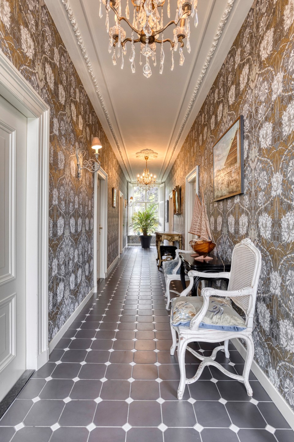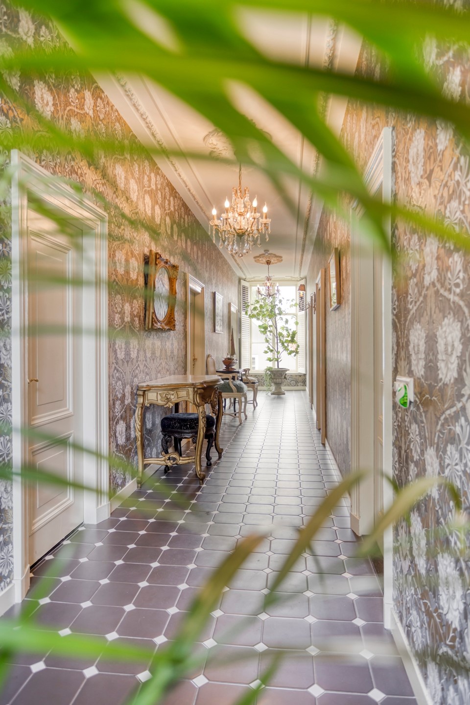 Achter de brede voordeur bevindt zich een royale hal die de volledige diepte van de woning beslaat. De vloer is voorzien van originele witmarmeren plavuizen. Aan weerszijden zijn hoge, stalen deuren van maar liefst 4,20 meter geplaatst — voorzien van glazen ramen, waardoor het licht vrij spel heeft. Rechts vindt u de ruime garderobe en het eerste toilet, evenals de toegang tot de trap en lift naar de boven gelegen verdiepingen.