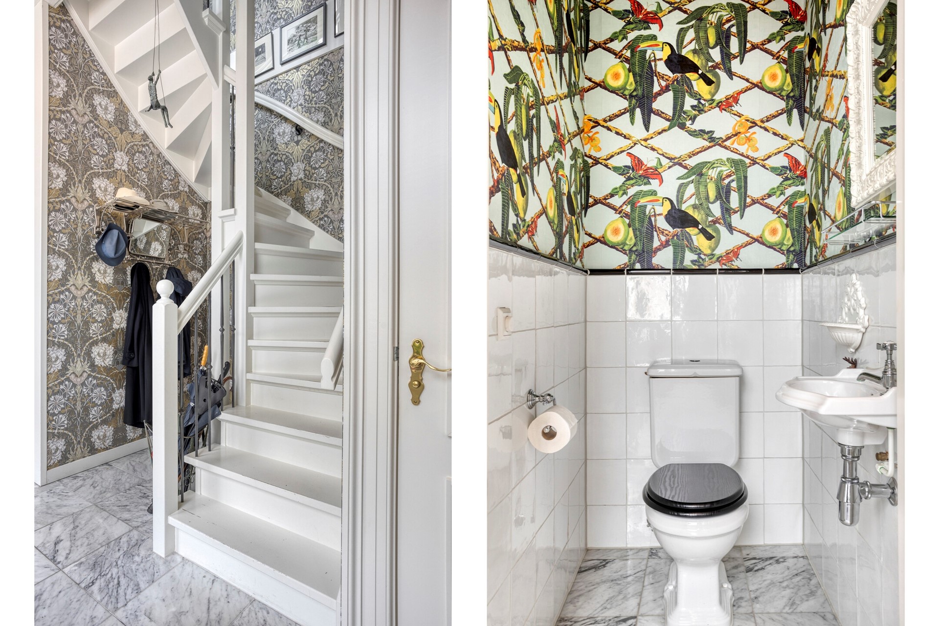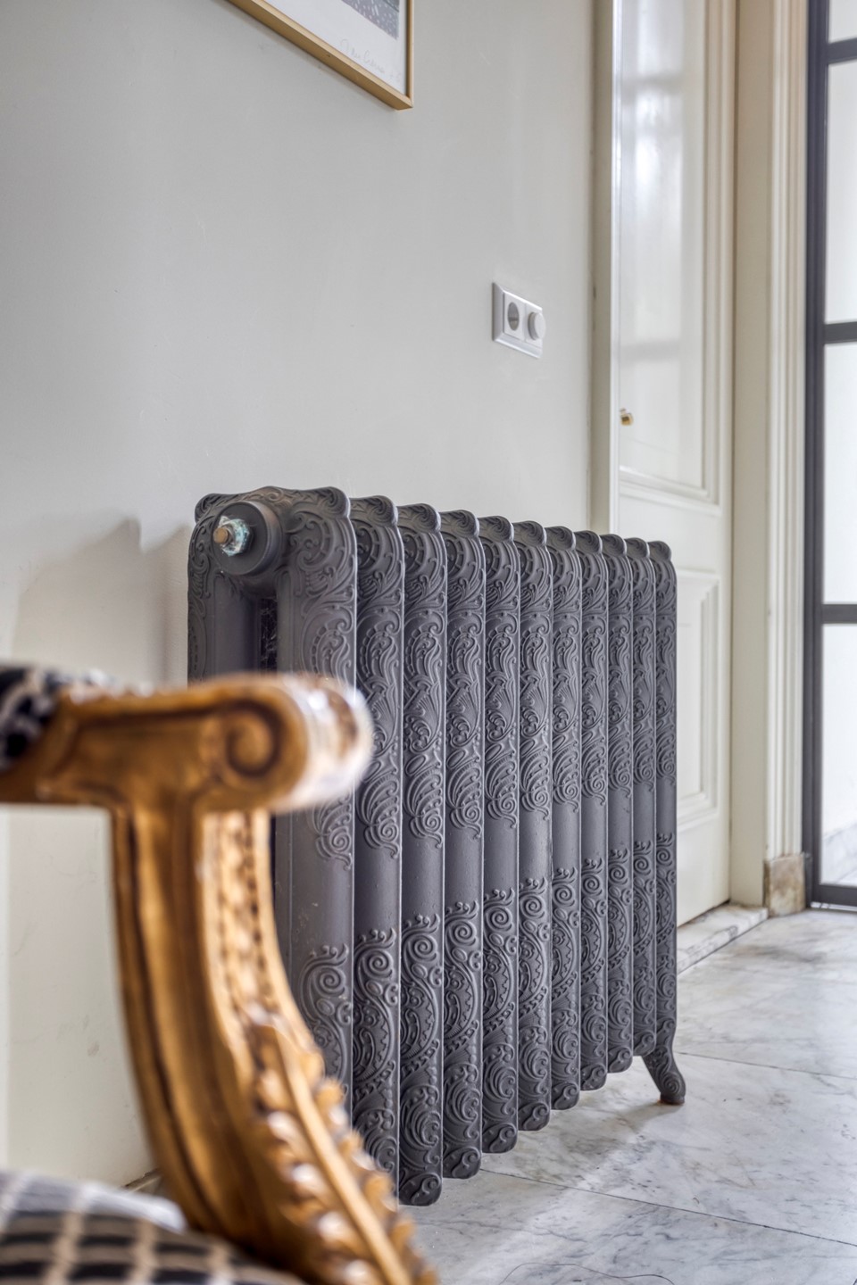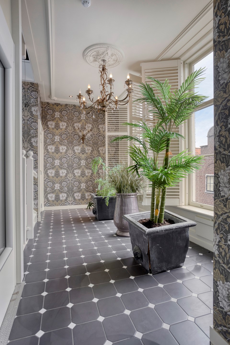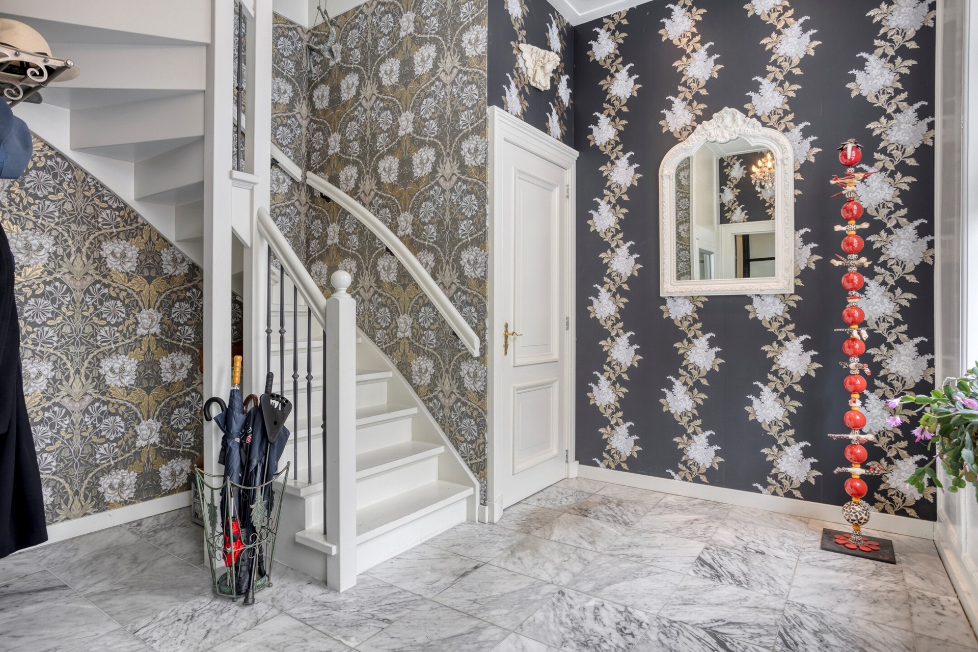 Achter de brede voordeur bevindt zich een royale hal die de volledige diepte van de woning beslaat. De vloer is voorzien van originele witmarmeren plavuizen. Aan weerszijden zijn hoge, stalen deuren van maar liefst 4,20 meter geplaatst — voorzien van glazen ramen, waardoor het licht vrij spel heeft. Rechts vindt u de ruime garderobe en het eerste toilet, evenals de toegang tot de trap en lift naar de boven gelegen verdiepingen.