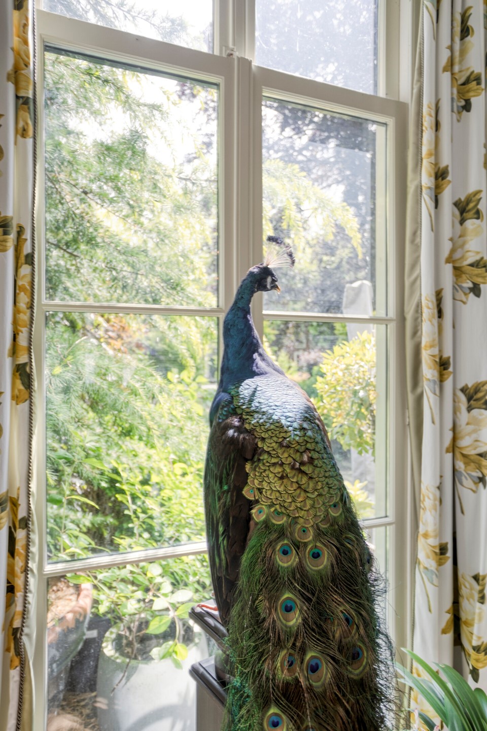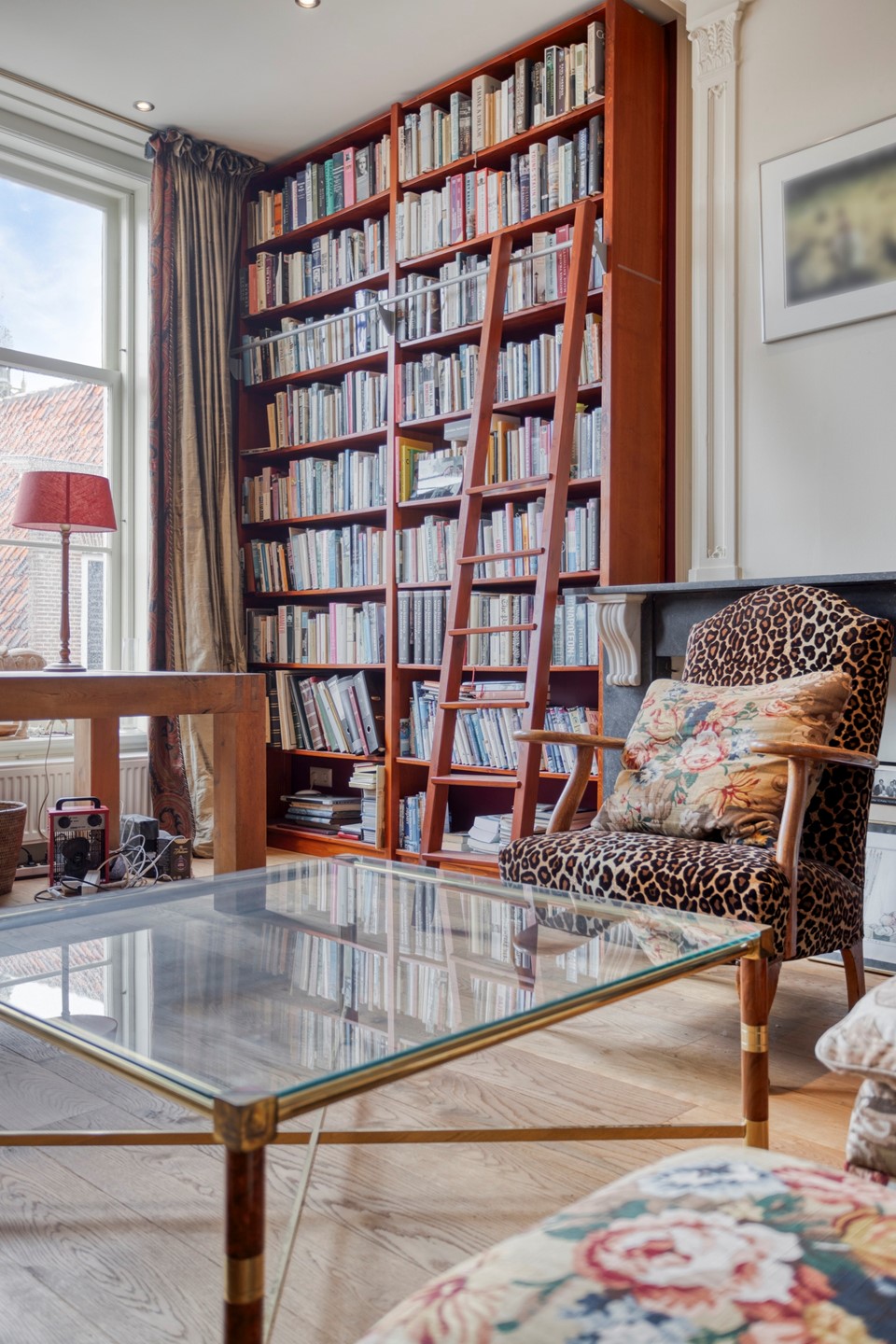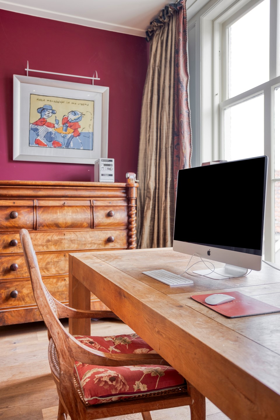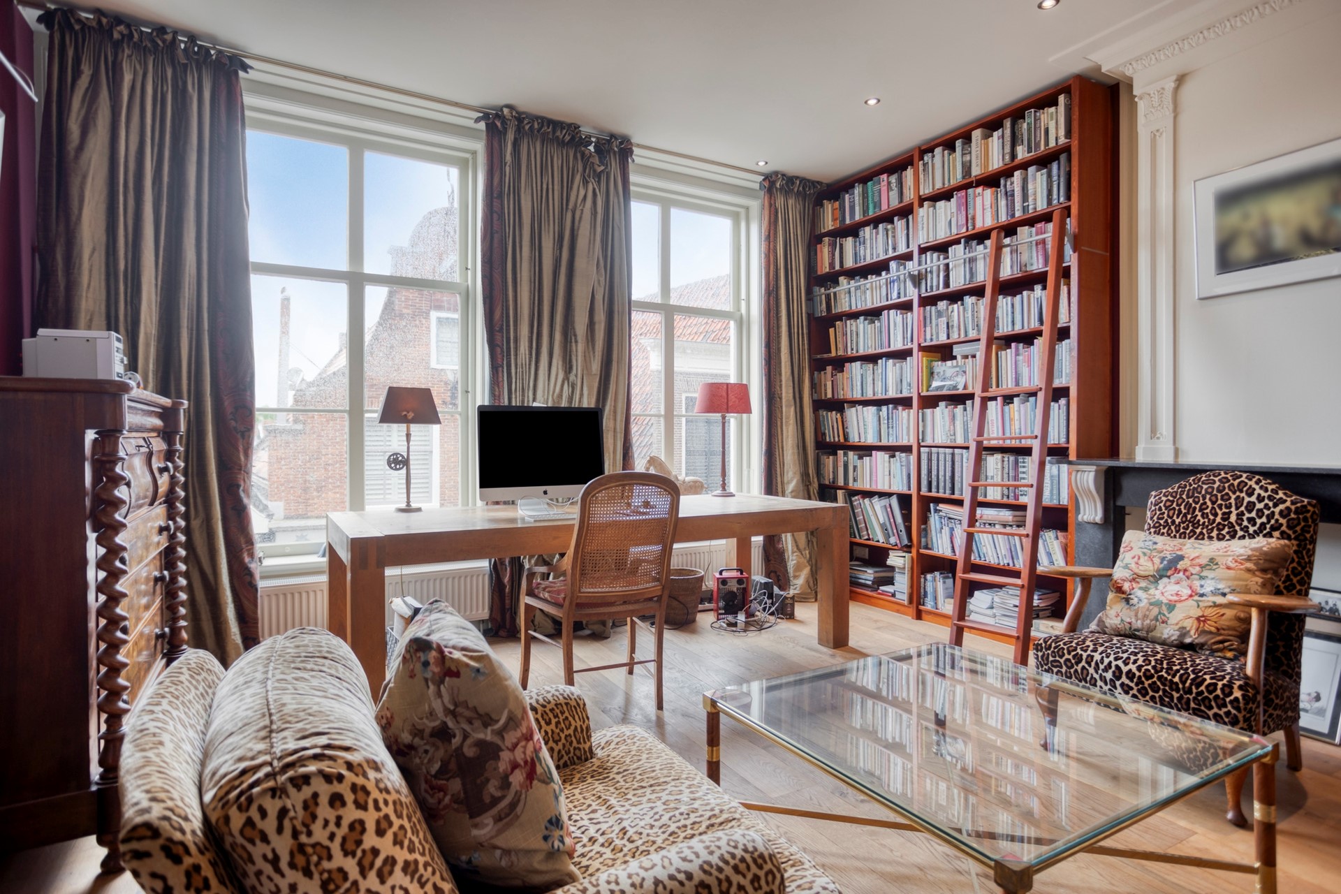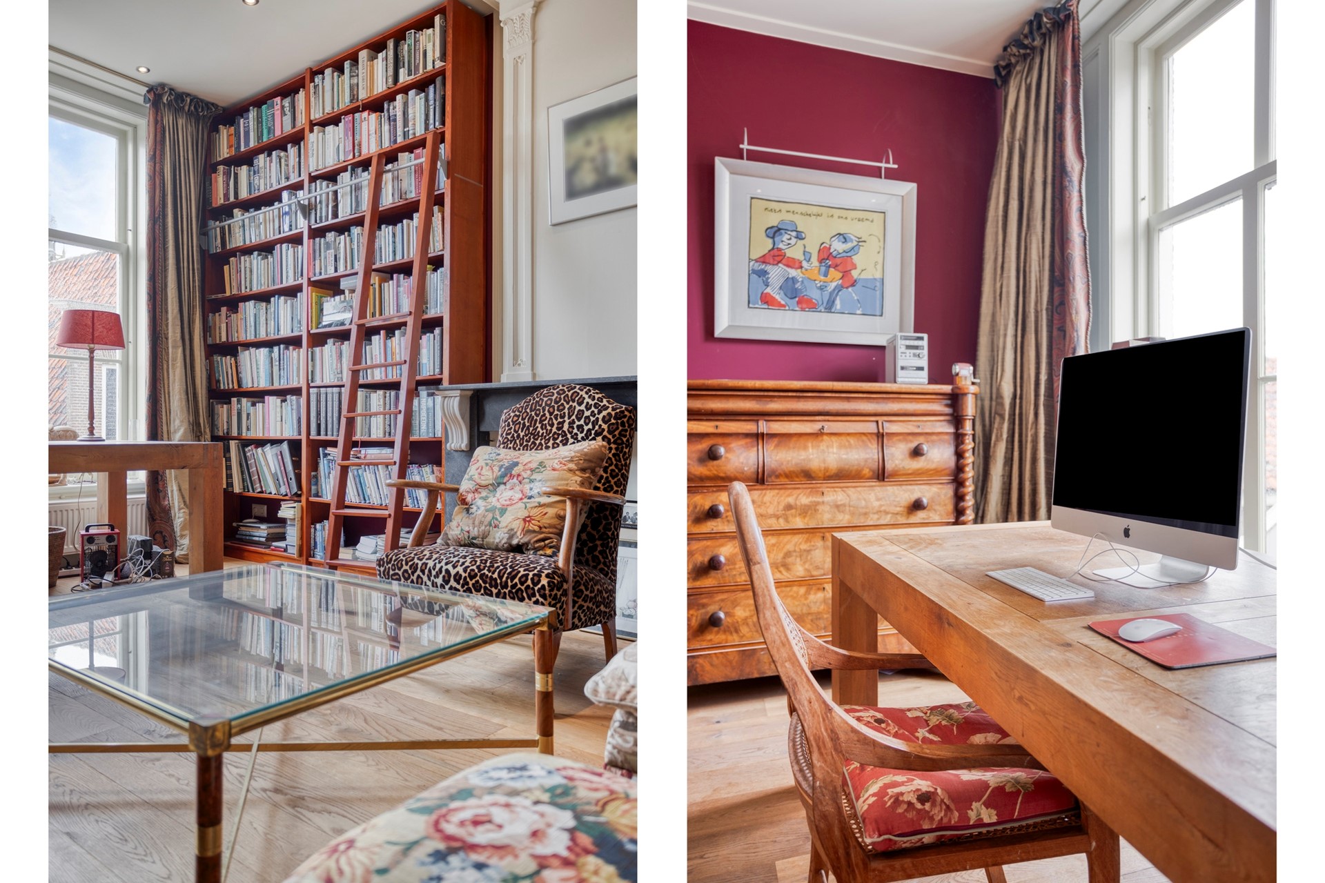 De eerste kamer is in gebruik als kantoor. De visgraatvloer keert hier prachtig terug, net als de plafondornamenten en originele schouw. De wanden zijn voorzien van boekenkasten tot aan het plafond, wat de ruimte het karakter van een bibliotheek geeft.