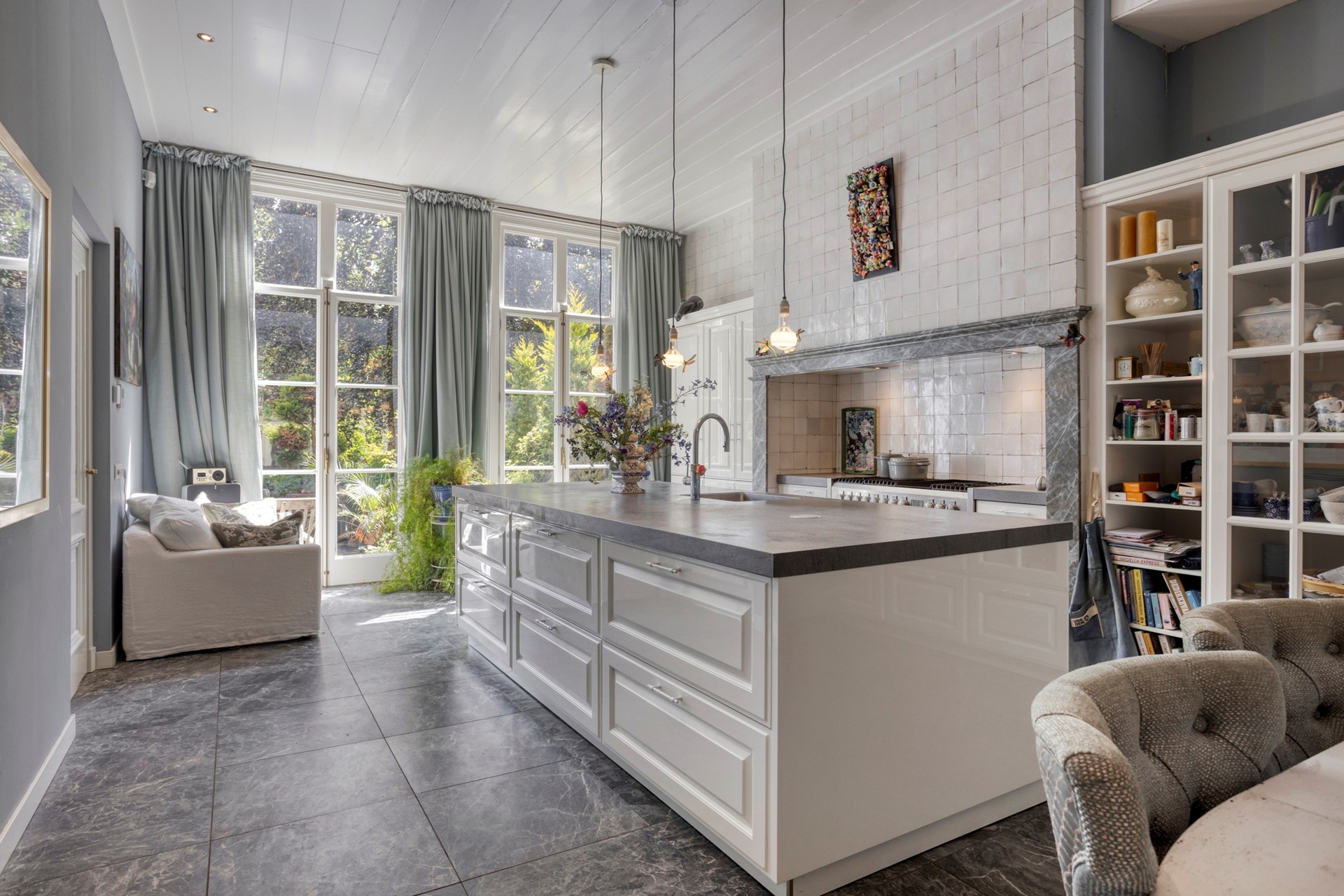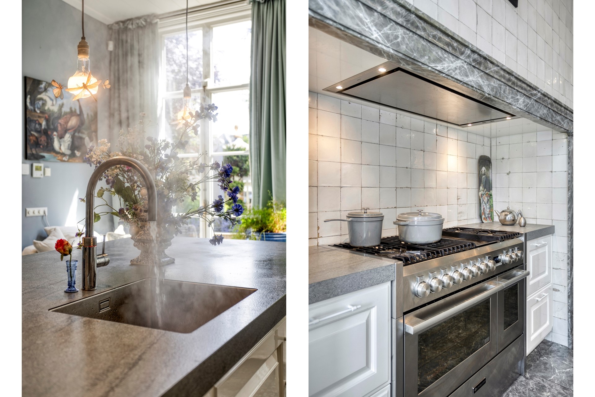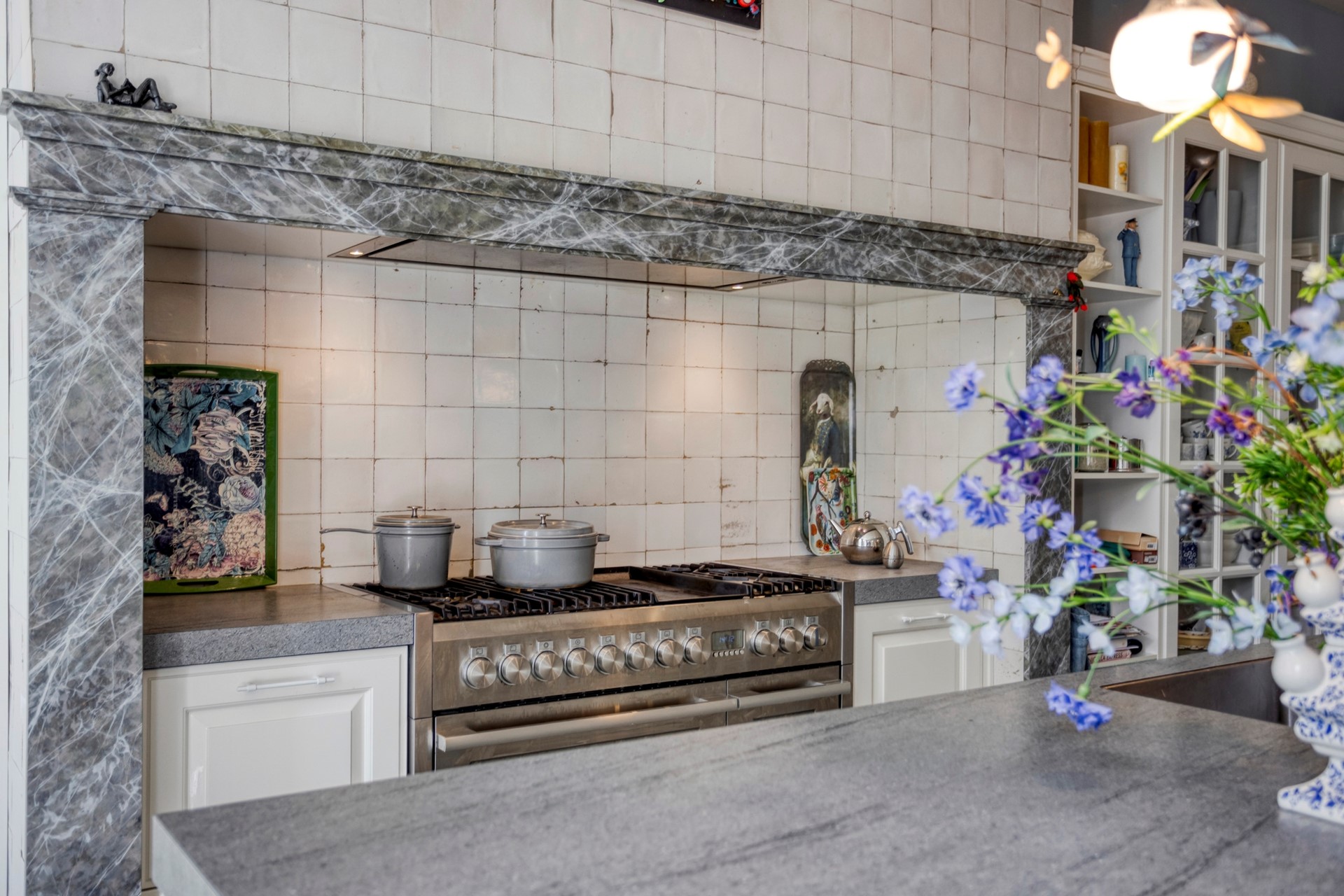 De keuken is bereikbaar via de hal of achterkamer. Hier vindt u een zeer ruime leef-keuken, met een spoeleiland van maar liefst 1,10 x 2,50 meter. De originele schouw – waar tot voor kort nog een echt hout gestookt fornuis stond – is vervangen door een modern 6-pits fornuis met bakplaat en drie ovens. Aan de wand bevinden zich authentieke ‘witjes’, tegels die moeilijk nog origineel te verkrijgen zijn. Langs de zij- en achterwand staan hoge kasten met voornamelijk glazen deuren – goed voor een zee aan opbergruimte. Ingebouwd zijn o.a. twee koel-vriescombinaties, een koffiemachine en een magnetron. Ook vanuit de keuken bieden openslaande deuren toegang tot het terras.