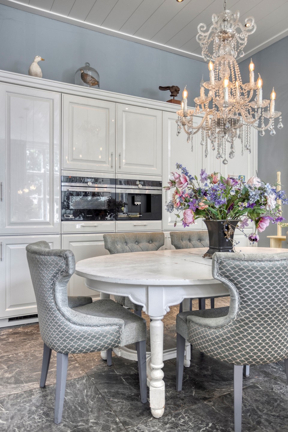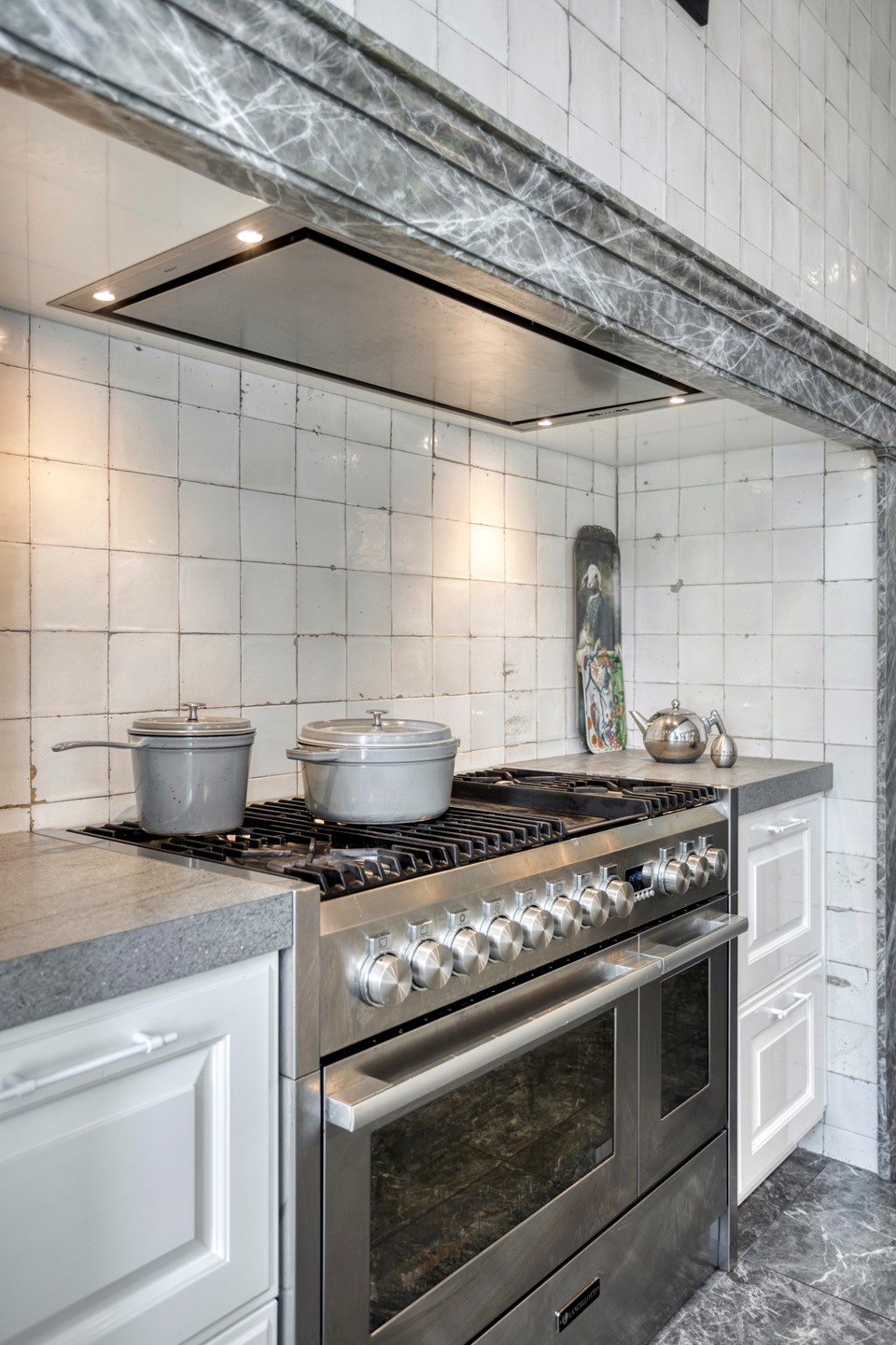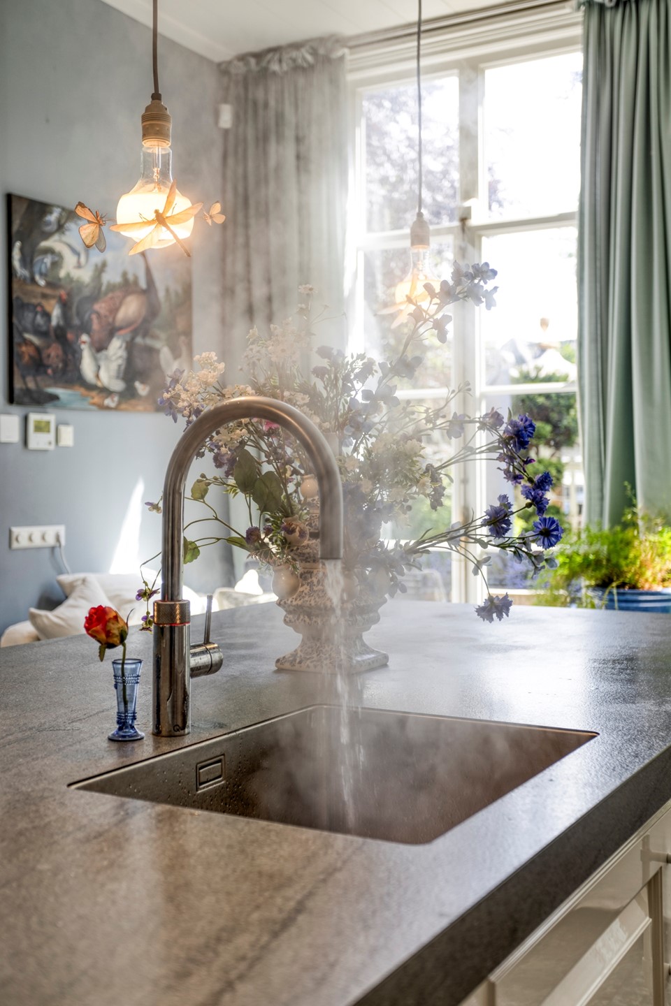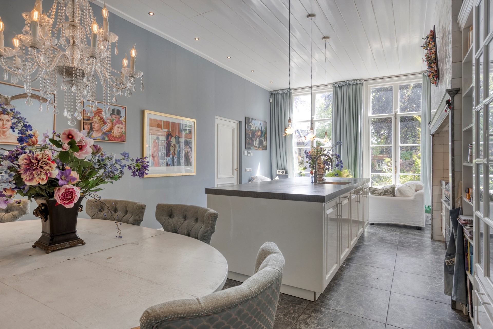 De keuken is bereikbaar via de hal of achterkamer. Hier vindt u een zeer ruime leef-keuken, met een spoeleiland van maar liefst 1,10 x 2,50 meter. De originele schouw – waar tot voor kort nog een echt hout gestookt fornuis stond – is vervangen door een modern 6-pits fornuis met bakplaat en drie ovens. Aan de wand bevinden zich authentieke ‘witjes’, tegels die moeilijk nog origineel te verkrijgen zijn. Langs de zij- en achterwand staan hoge kasten met voornamelijk glazen deuren – goed voor een zee aan opbergruimte. Ingebouwd zijn o.a. twee koel-vriescombinaties, een koffiemachine en een magnetron. Ook vanuit de keuken bieden openslaande deuren toegang tot het terras.
