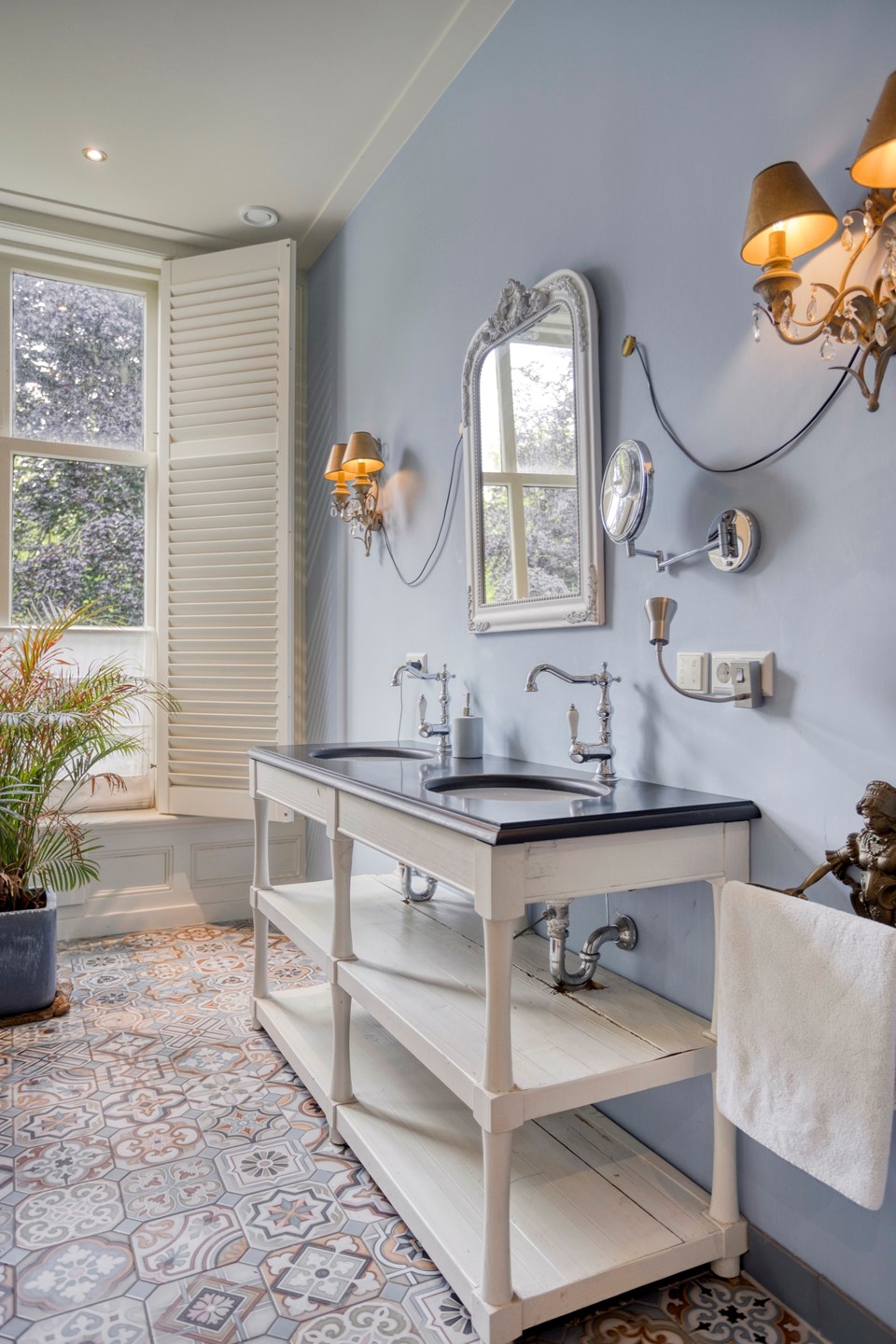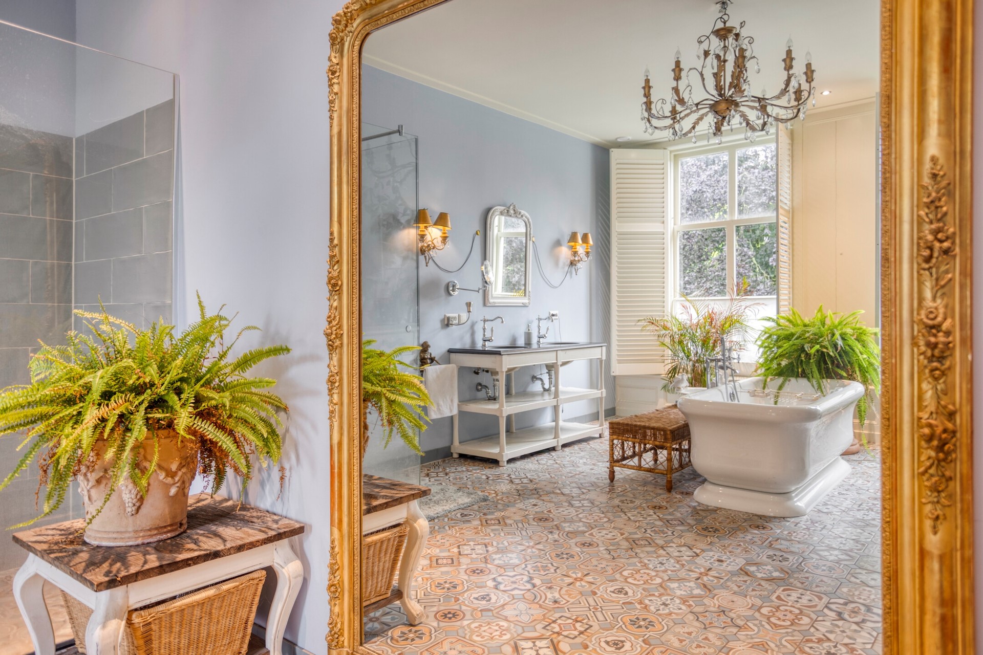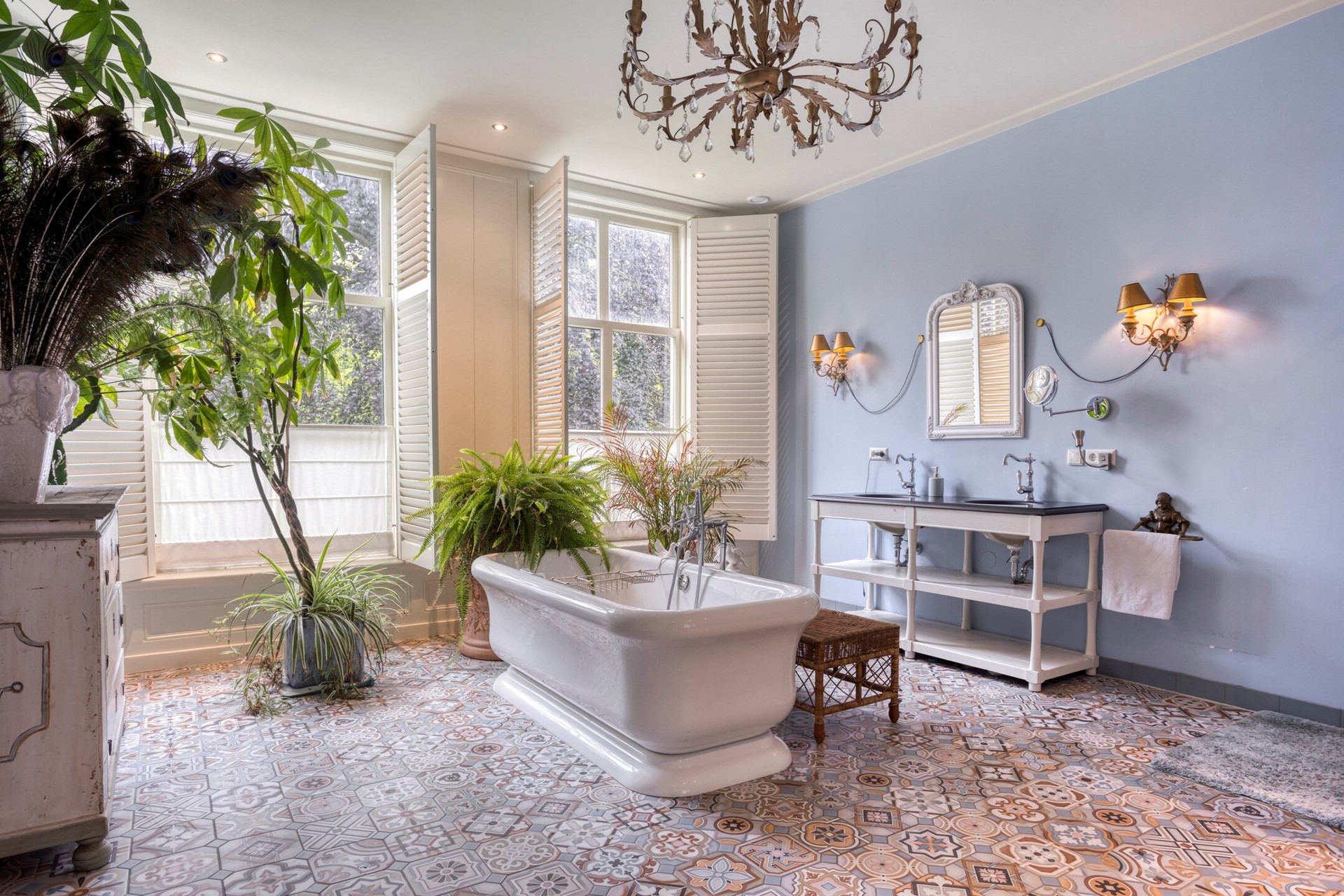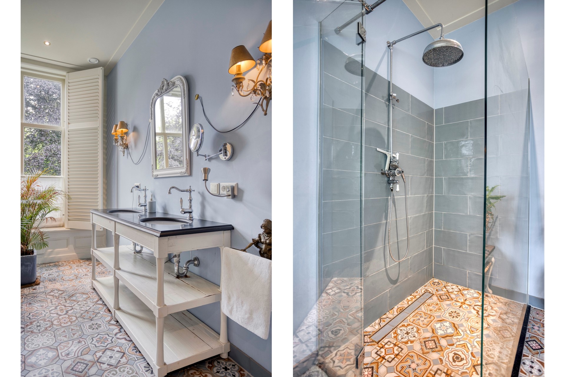 De badkamer is een ware blikvanger. De vloer is afgewerkt met mozaïektegels en tegen de wand hangt een imposant grote spiegel in een rijkversierd frame. Centraal staat een vrijstaand ligbad, omgeven door planten, wat zorgt voor een bijna tropische sfeer. Verder is er een inloopdouche en een wastafelmeubel met dubbele ovale waskommen.