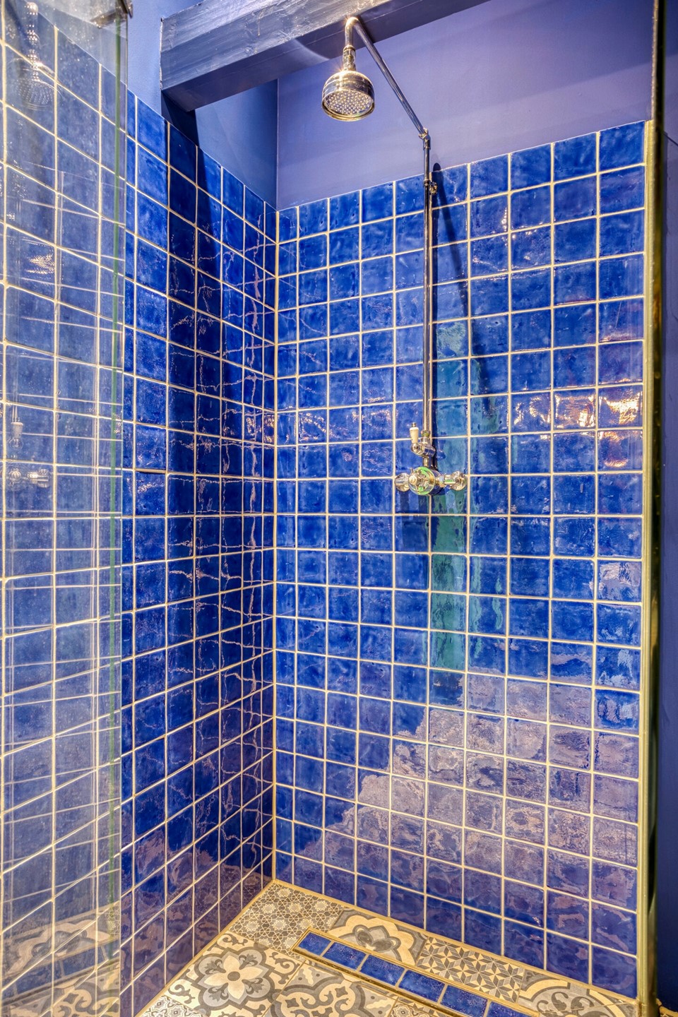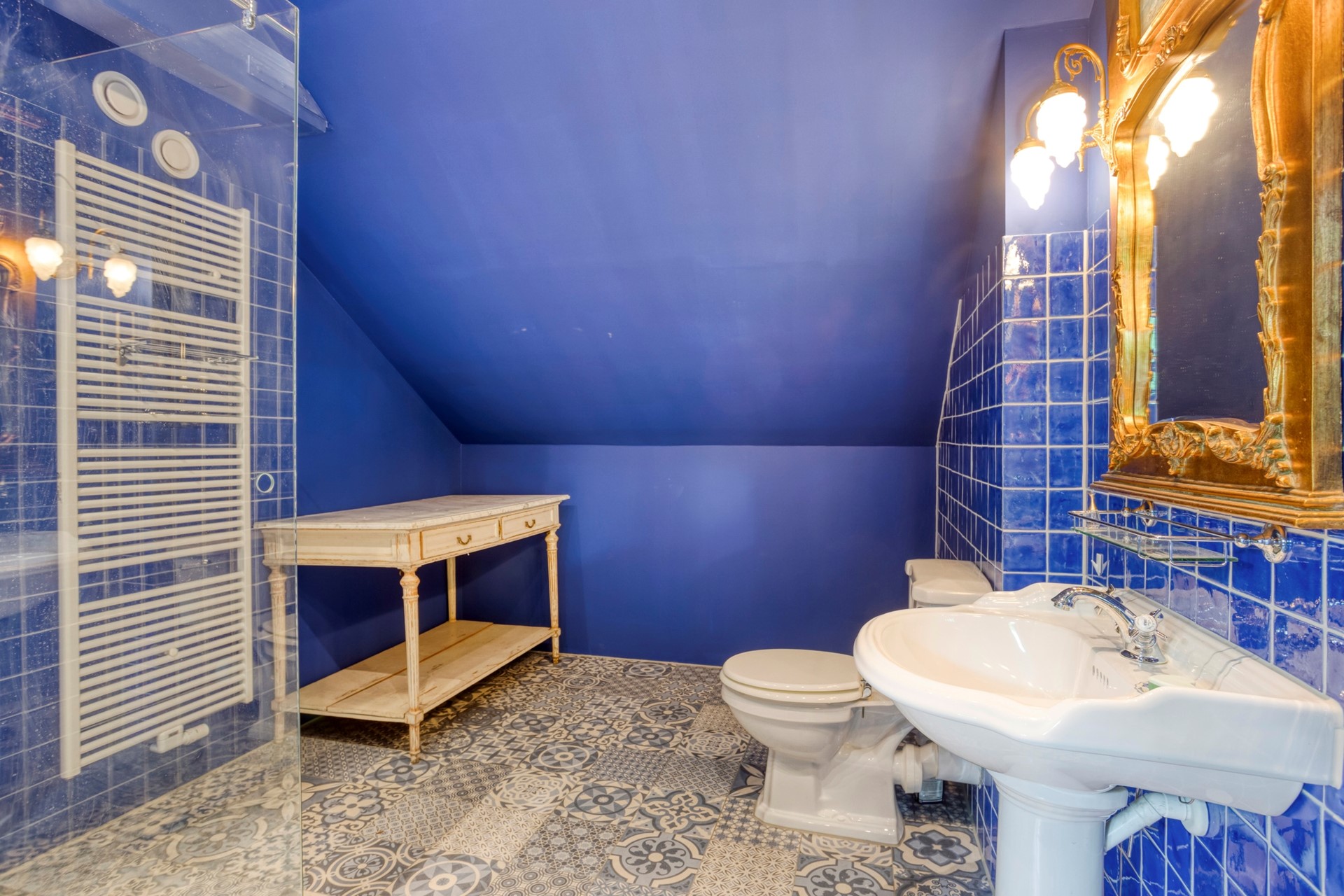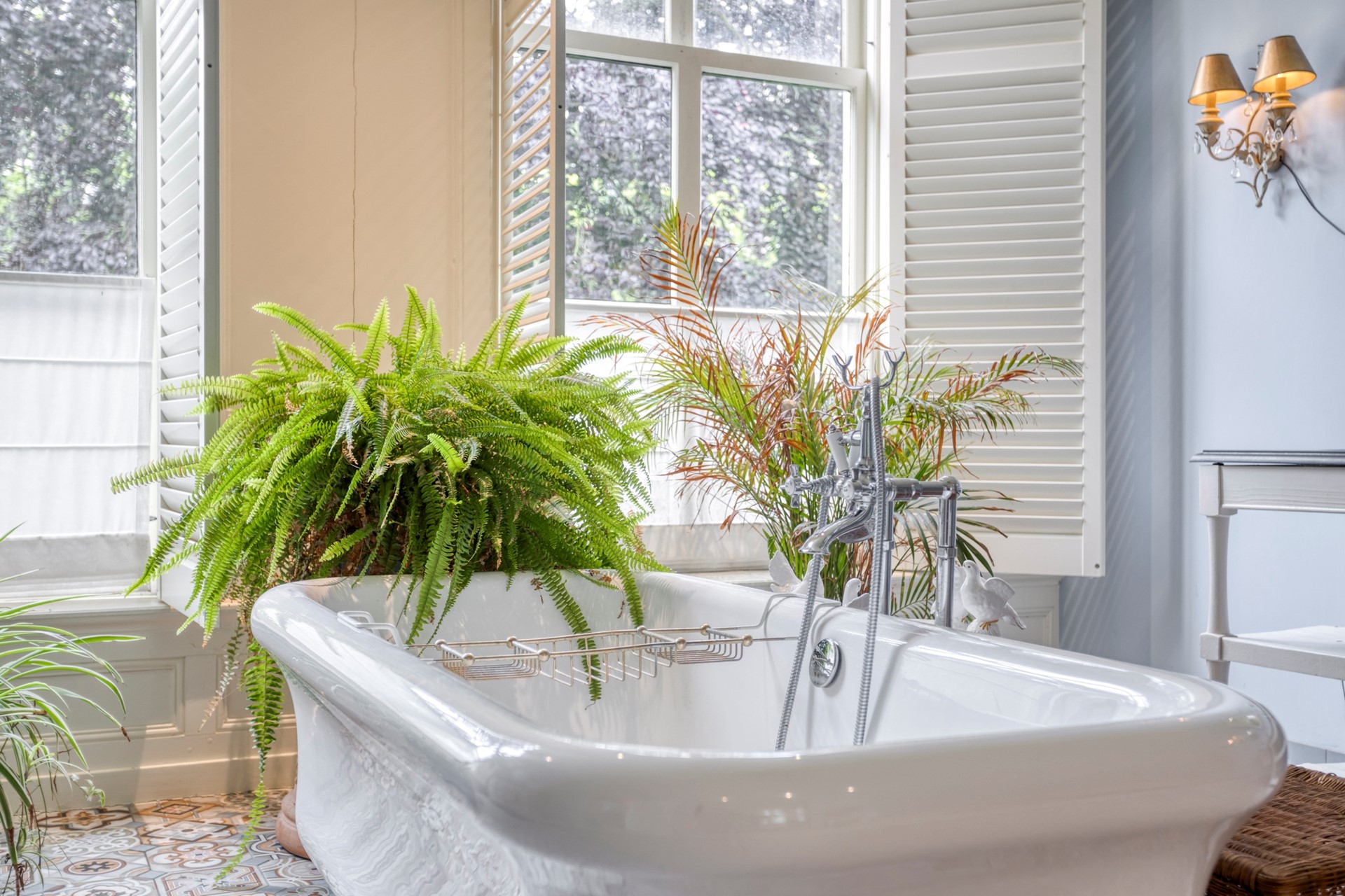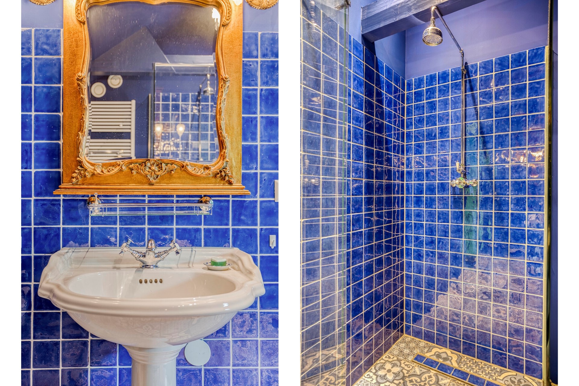 De badkamer is een ware blikvanger. De vloer is afgewerkt met mozaïektegels en tegen de wand hangt een imposant grote spiegel in een rijkversierd frame. Centraal staat een vrijstaand ligbad, omgeven door planten, wat zorgt voor een bijna tropische sfeer. Verder is er een inloopdouche en een wastafelmeubel met dubbele ovale waskommen.