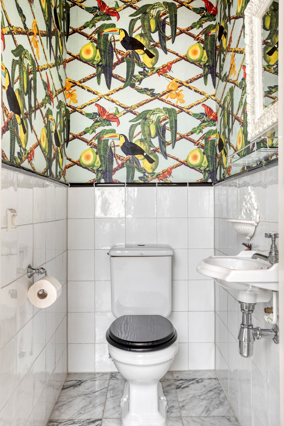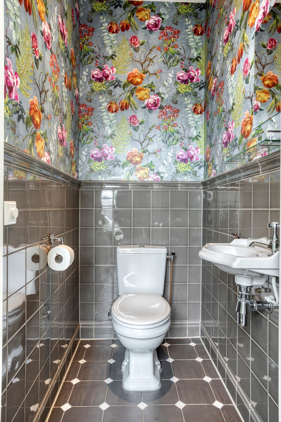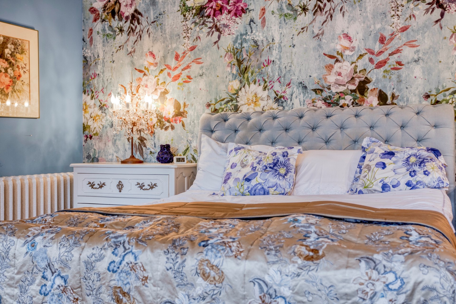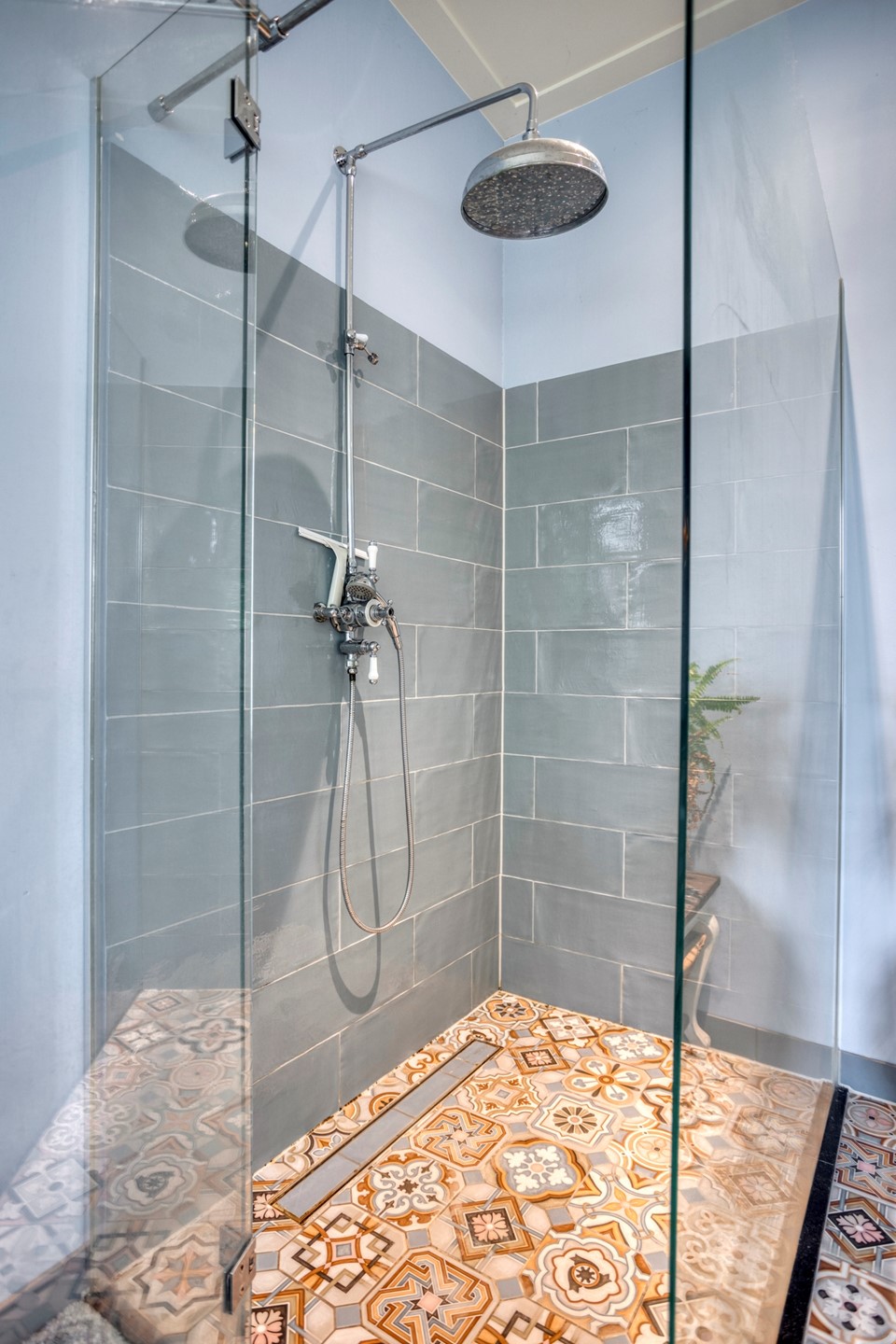 De badkamer is een ware blikvanger. De vloer is afgewerkt met mozaïektegels en tegen de wand hangt een imposant grote spiegel in een rijkversierd frame. Centraal staat een vrijstaand ligbad, omgeven door planten, wat zorgt voor een bijna tropische sfeer. Verder is er een inloopdouche en een wastafelmeubel met dubbele ovale waskommen.