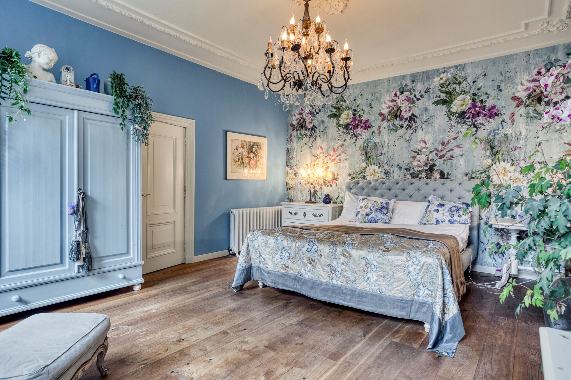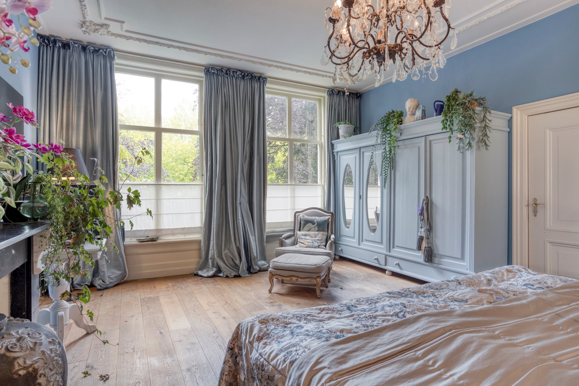 Via een corridor met aan weerszijden twee inloopkasten met inbouwverlichting, bereikt u de master bedroom. De kamer is ruim opgezet, voorzien van een tweepersoonsbed, linnenkast en zitgedeelte. Ook hier komen de visgraatvloer, schouw en ornamenten terug.