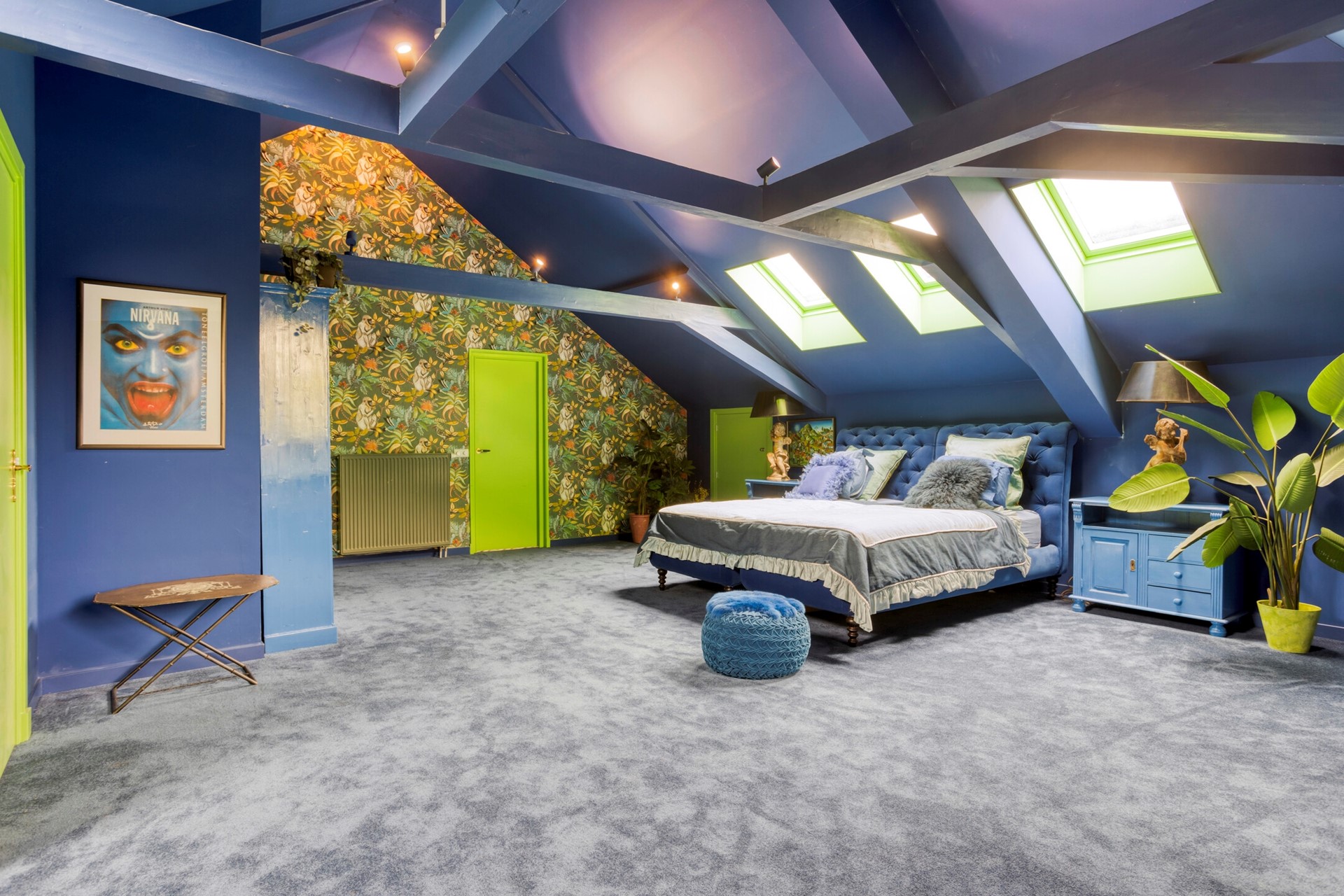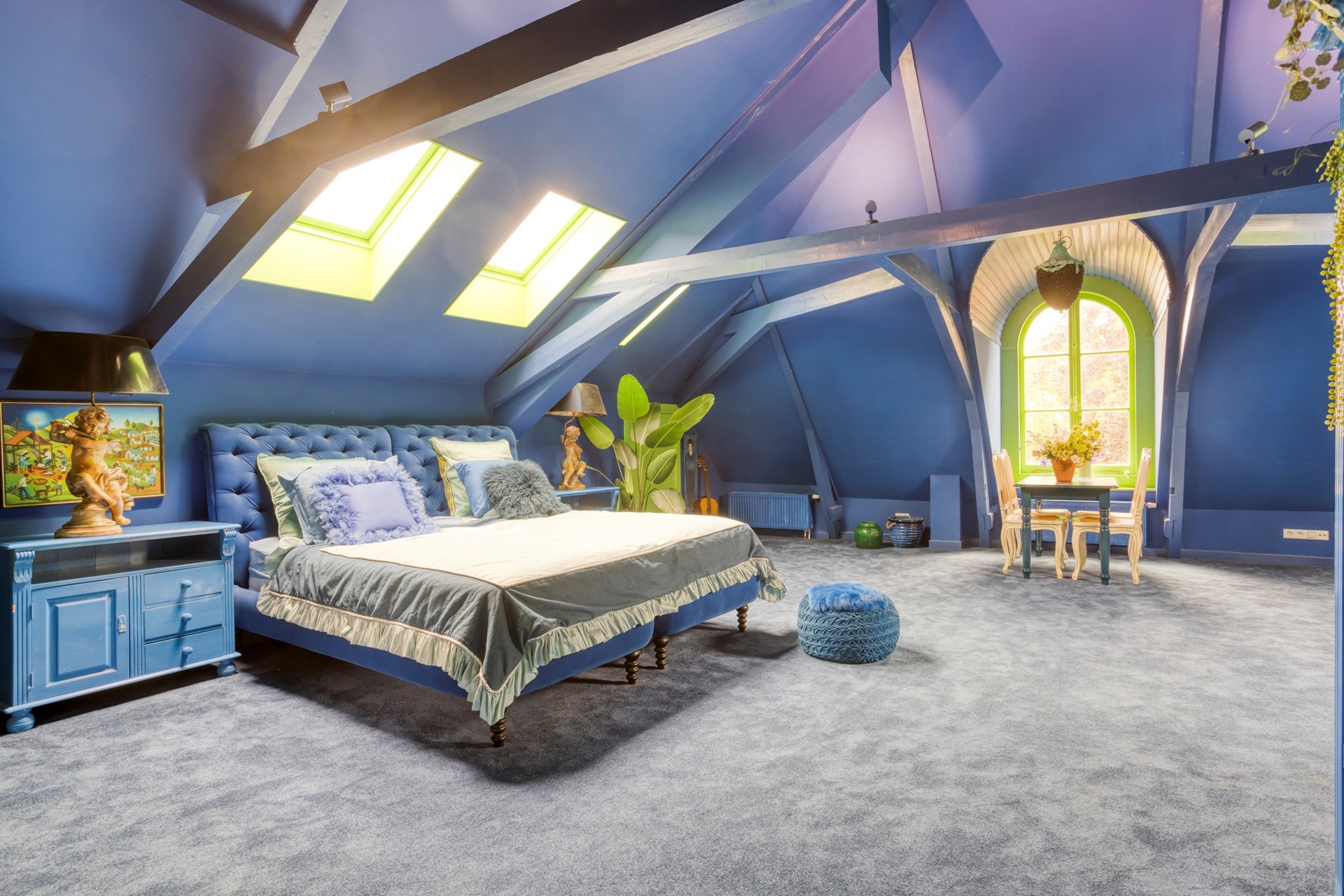 Via een tussendeur bereikt u de royale zolderkamer, momenteel ingericht als gastenverblijf met eigen badkamer. De ruimte heeft een warme uitstraling, mede dankzij het hoogpolige tapijt en de diepblauwe wandkleur. De zichtbare dakspanten en hoge nok geven extra charme en gevoel van ruimte. Met vier dakramen én een koepeldakkapel aan de tuinzijde is er veel daglicht. De totale vloeroppervlakte is ca. 98 m² – dit maakt alternatieve indelingen, zoals het creëren van twee of drie slaapkamers, eenvoudig mogelijk.