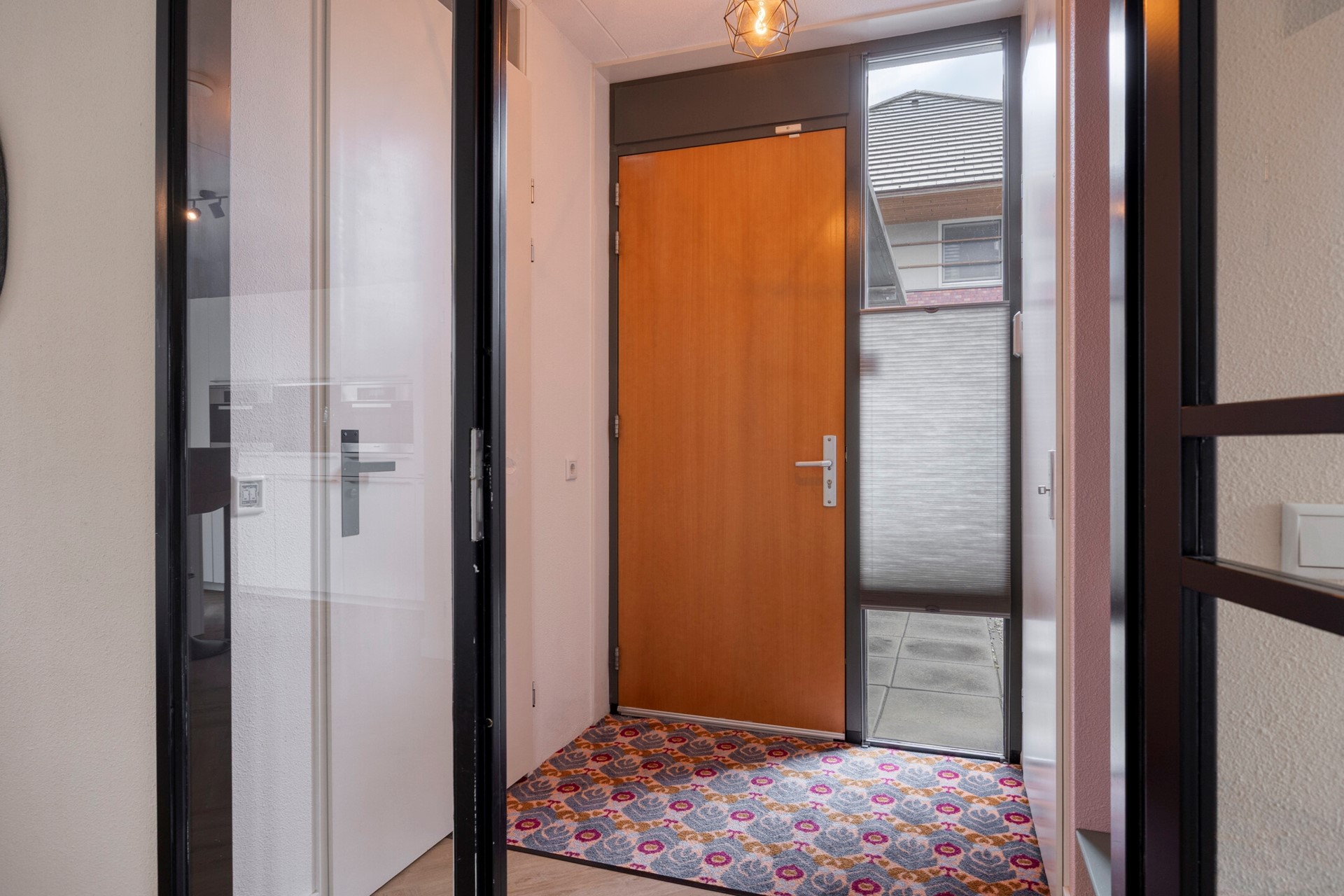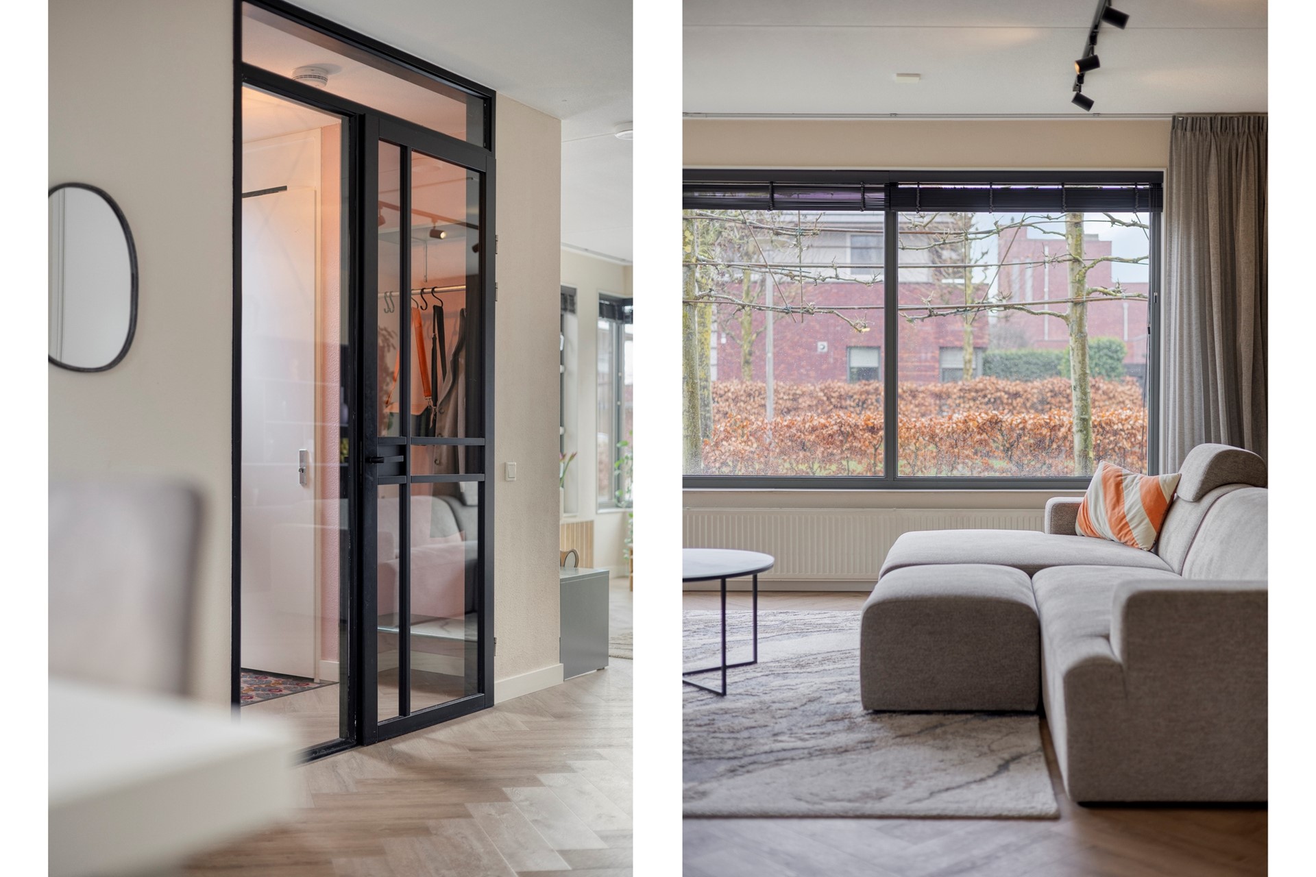 De entree leidt naar een verzorgde hal met garderobe en modern toilet. Via een elegante glazen deur wordt het leefgedeelte bereikt, waar direct de openheid en het overvloedige daglicht opvallen.