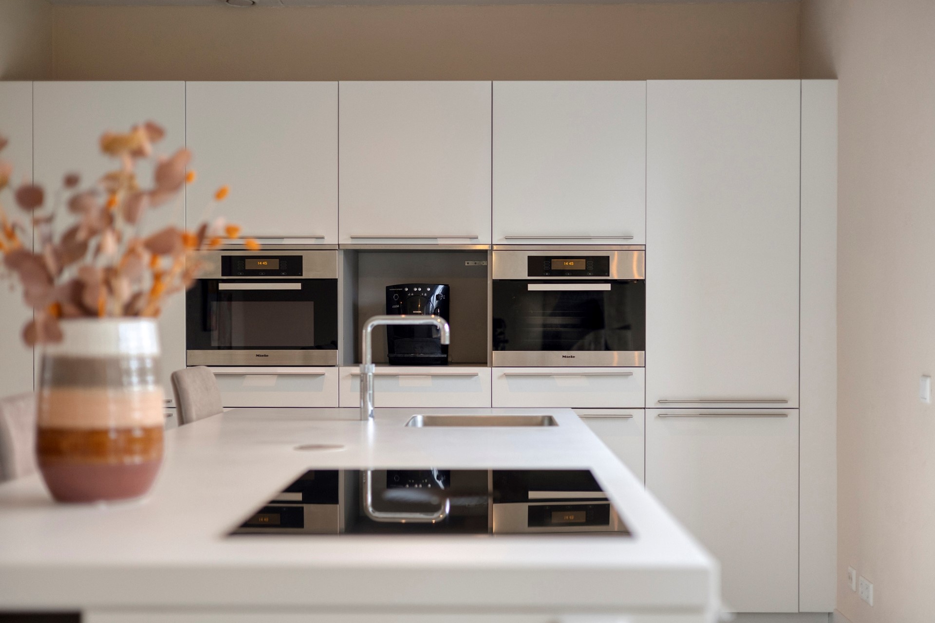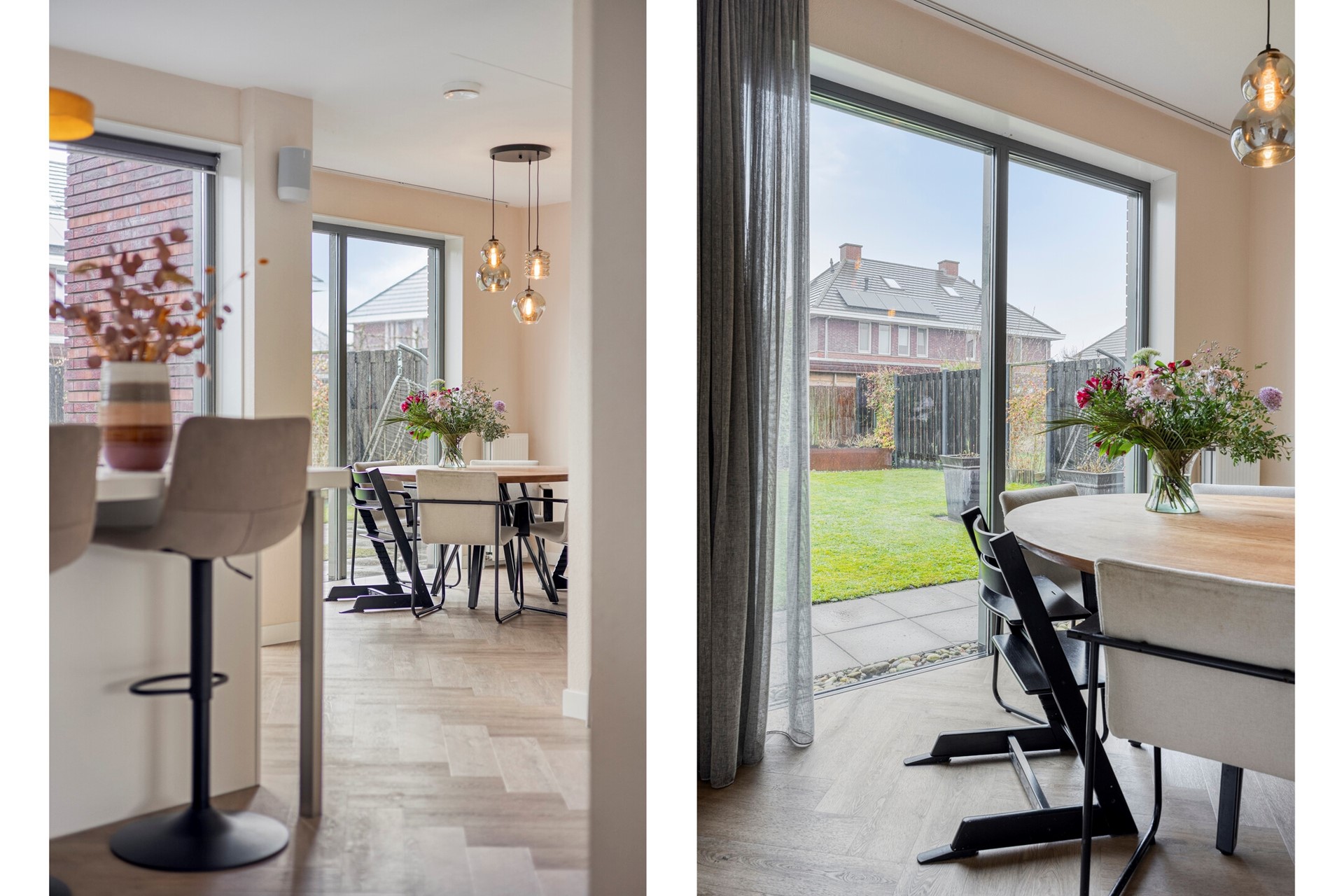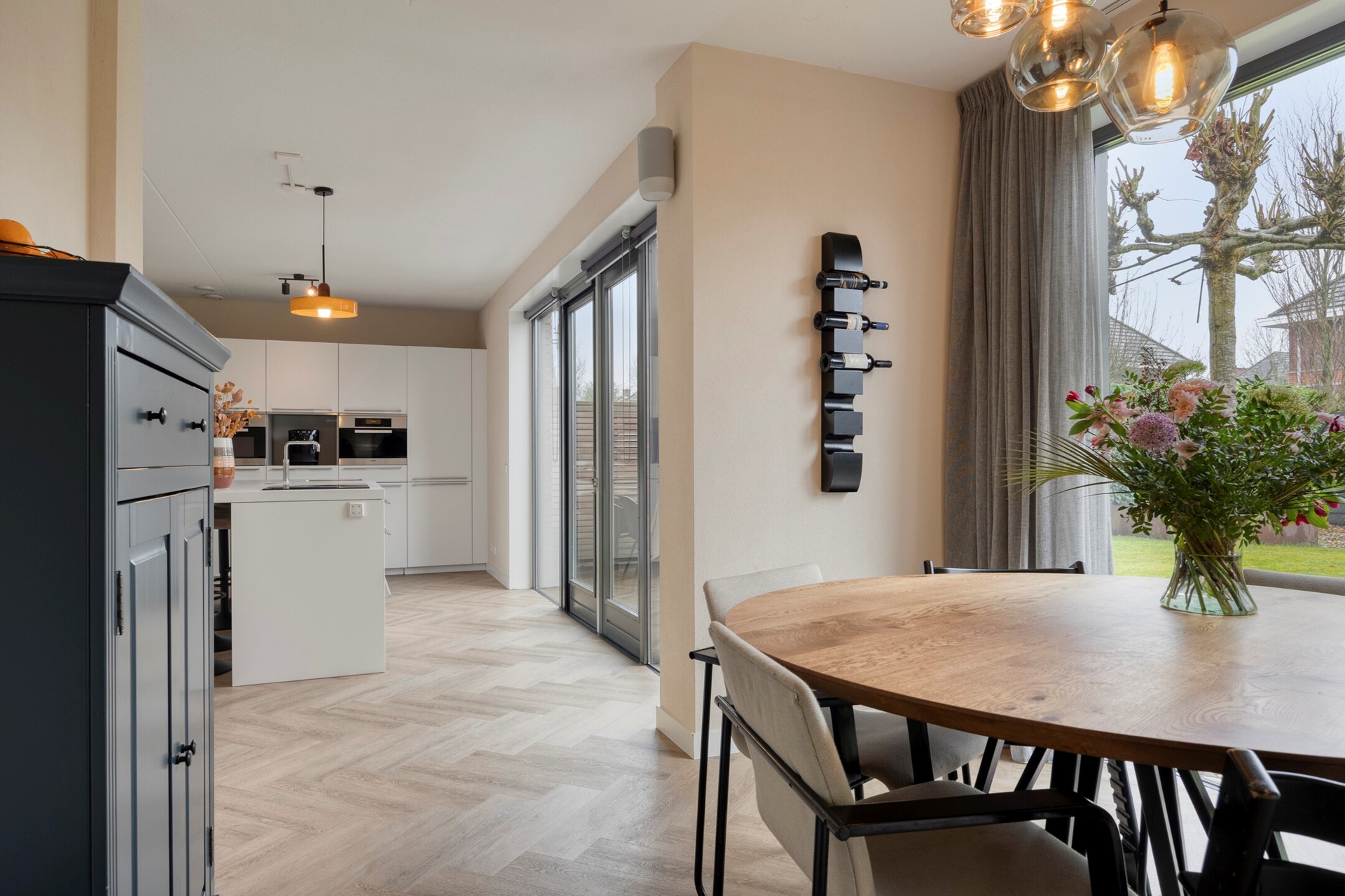 Aan de voorzijde bevindt zich de sfeervolle woonkamer, gekenmerkt door grote raampartijen en een aangename lichtinval gedurende de dag. Aan de achterzijde is de luxe woonkeuken gesitueerd, uitgevoerd met een royaal kookeiland en hoogwaardige inbouwapparatuur. Deze ruimte vormt het centrale punt van de woning en staat in open verbinding met het eetgedeelte, dat een fraai uitzicht biedt op de tuin. Vanuit hier is tevens de praktische bijkeuken bereikbaar, voorzien van maatwerkkasten en een eigen entree.