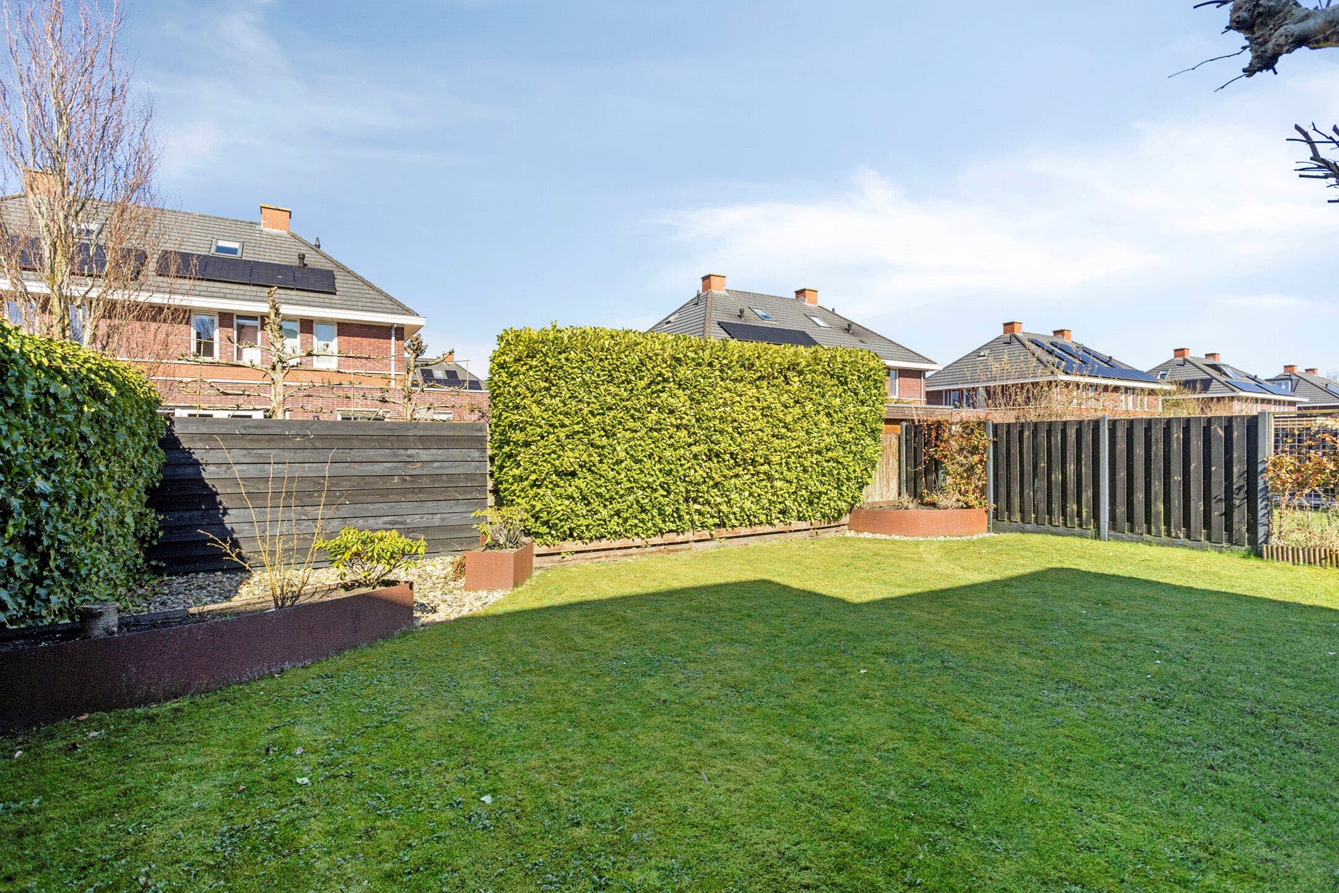 De achtertuin is verzorgd aangelegd en kenmerkt zich door een fraai, open gazon in combinatie met diverse beplantingen die zorgen voor privacy en een groene uitstraling. Direct aan de woning ligt een ruim terras, dat naadloos aansluit op de woonkeuken en een prettige plek biedt om buiten te verblijven. De tuin heeft een gunstige zonligging en biedt gedurende de dag zowel zon als schaduw. Daarnaast is er een houten berging aanwezig, gerealiseerd in 2020, die zeer geschikt is voor het stallen van fietsen en extra opslagruimte.