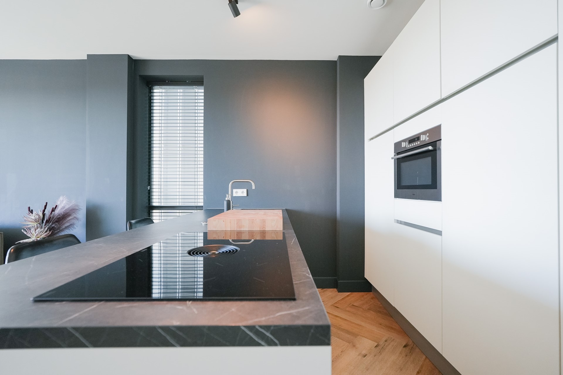 De moderne open keuken heeft een eiland wat ervoor zorgt dat je niet met je rug naar het uitzicht en de gasten staan. Deze keuken is uitgerust met luxe apparatuur, waaronder een inductiekookplaat, vaatwasser, spoelbak, koelkast, combi-oven en voldoende opbergruimte. Aansluitend is er nog een praktische grote opbergkast met extra opslagmogelijkheden. Vanuit de hal heb je toegang tot de aparte technische ruimte, waar onder andere de wasmachineaansluiting zit.