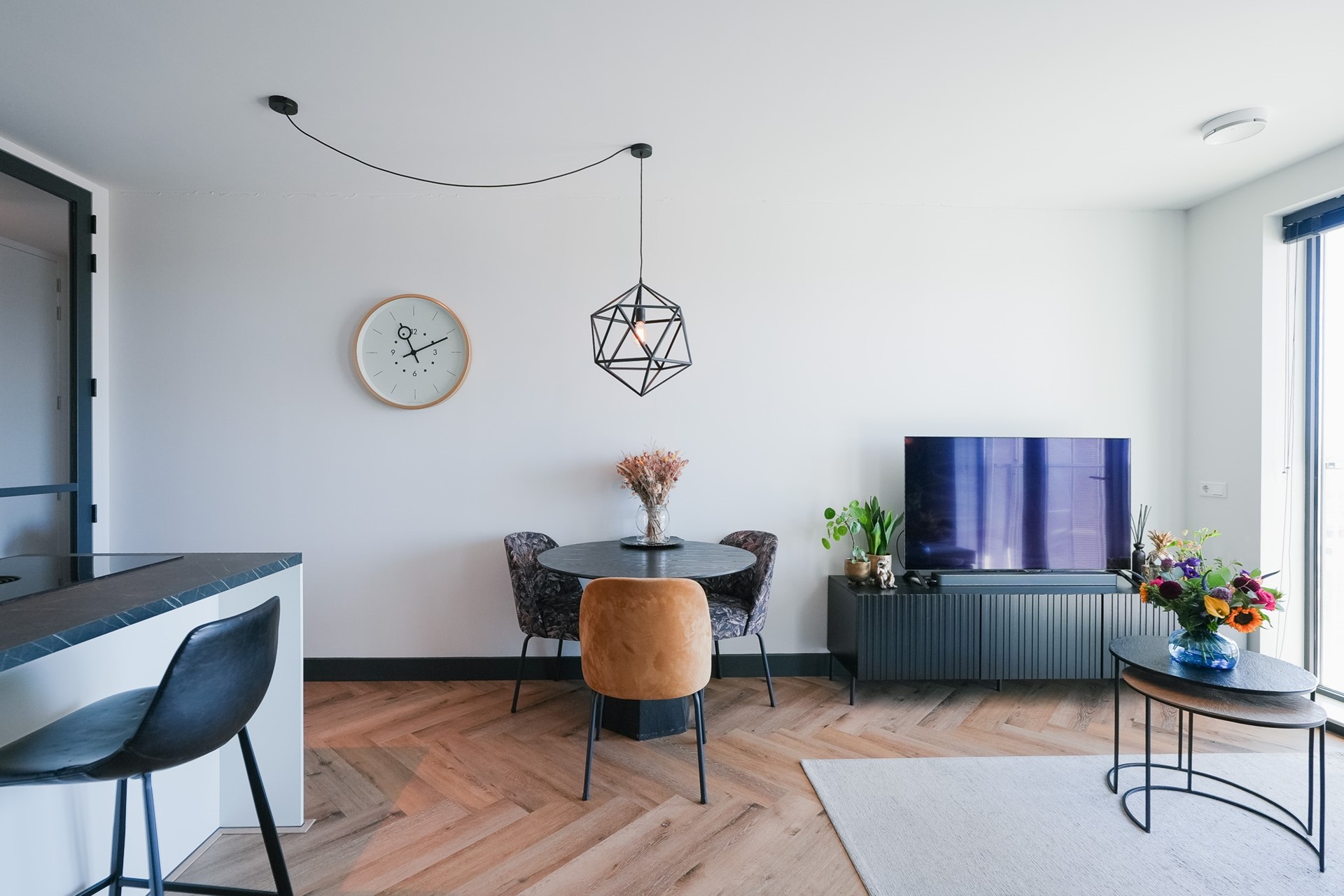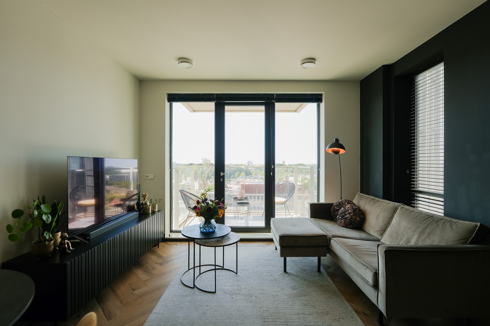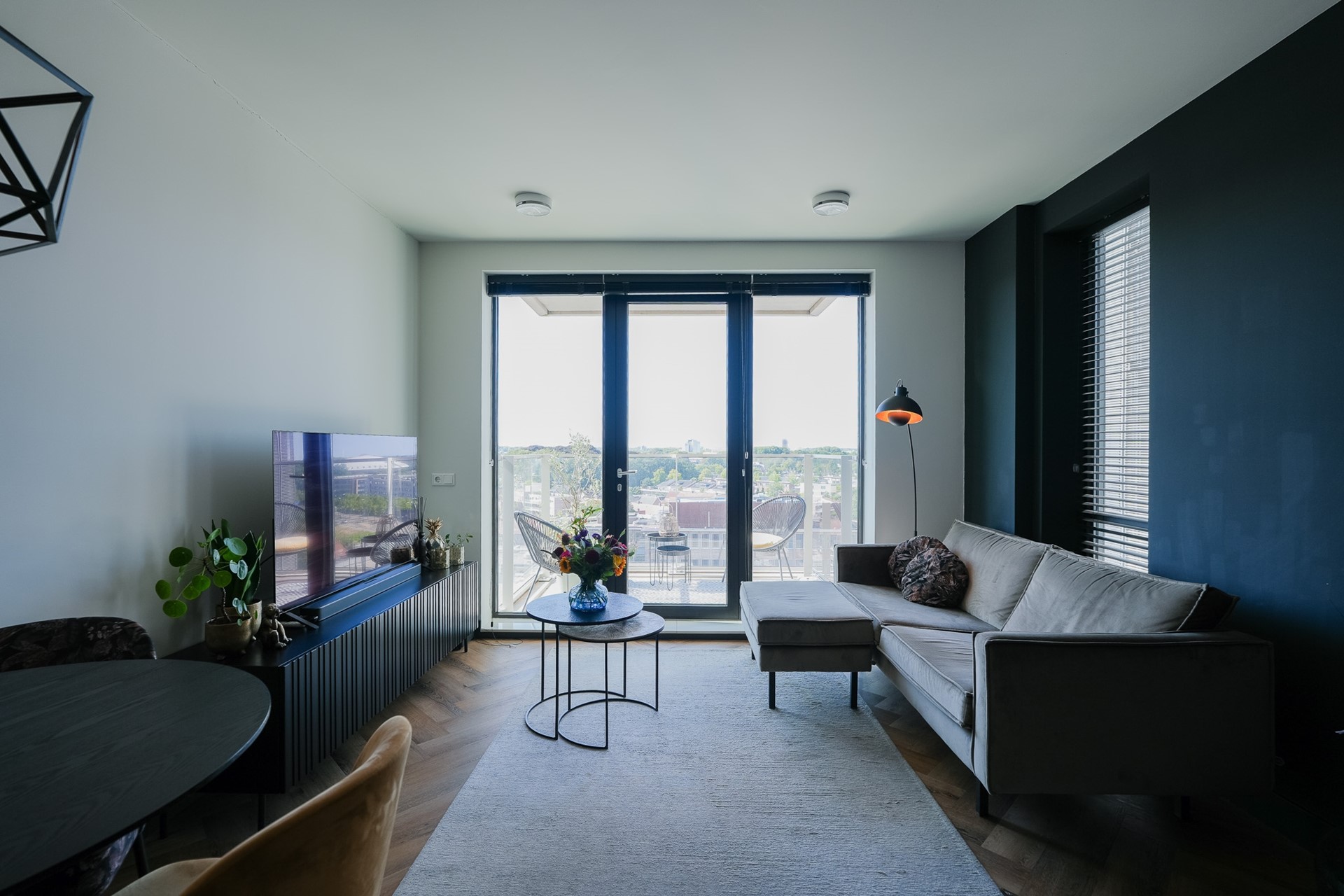 De wanden zijn deels strak gestucte en in de slaapkamer is mooi behang gebruikt. Via de woonkamer bereik je het balkon: een heerlijke plek om na een lange dag te ontspannen met een drankje, terwijl je geniet van het rustgevende uitzicht.