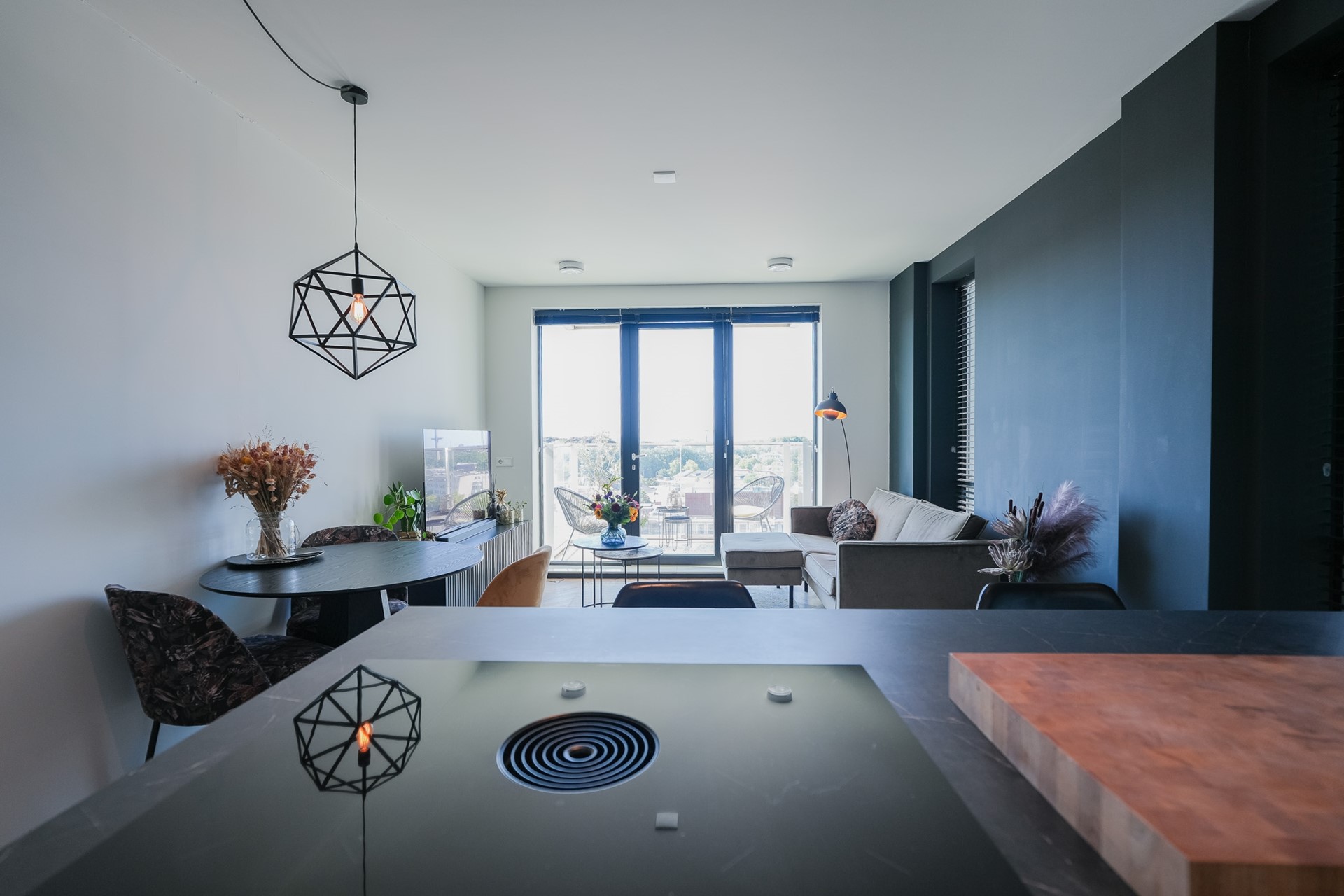 De woonkamer is afgewerkt met een hoogwaardige PVC-vloer (uitgerust met vloerverwarming én vloerkoeling).