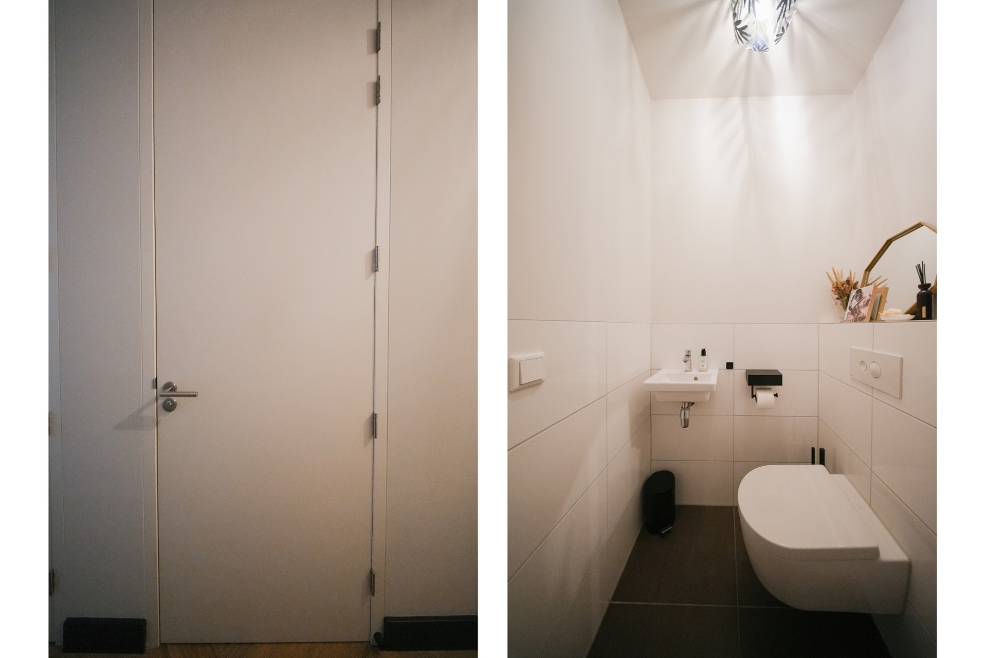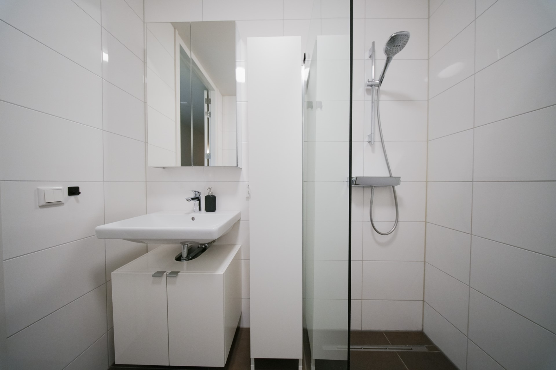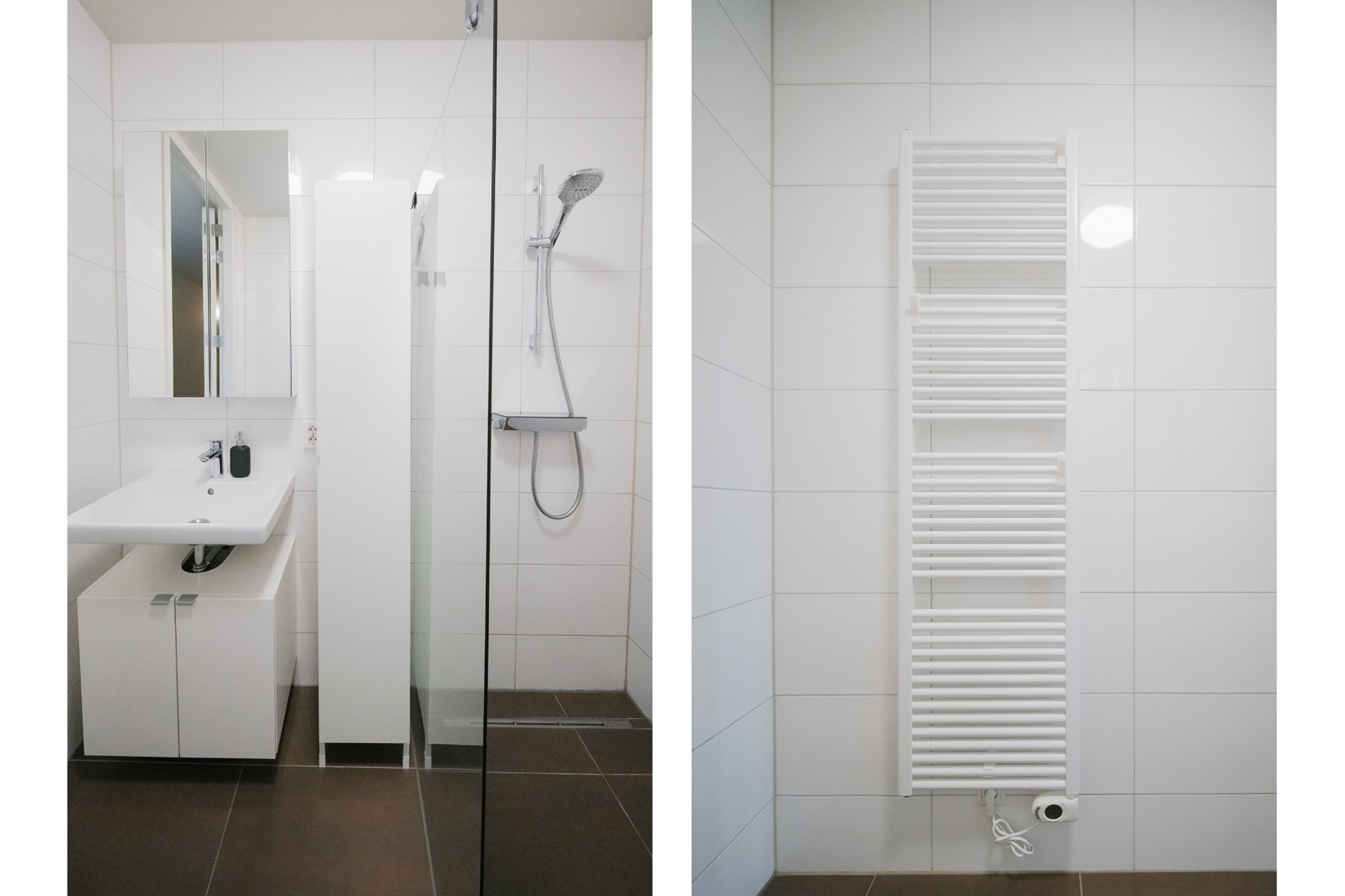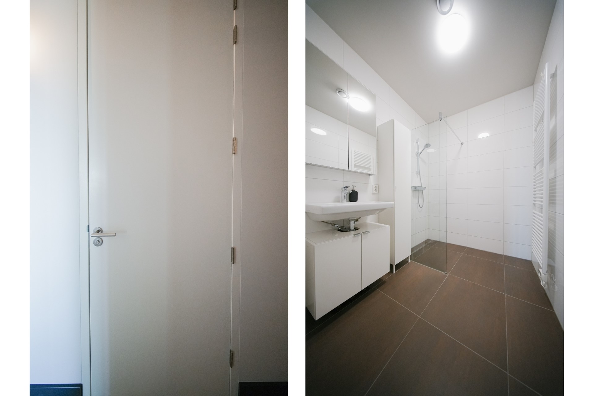 De badkamer is volledig betegeld en beschikt over een riante inloopdouche en een wastafel. Het stijlvolle en moderne design sluit naadloos aan bij de rest van het appartement. Daarnaast is er een aparte toiletruimte, deels betegeld, met een vrijhangend toilet en een fonteintje.
