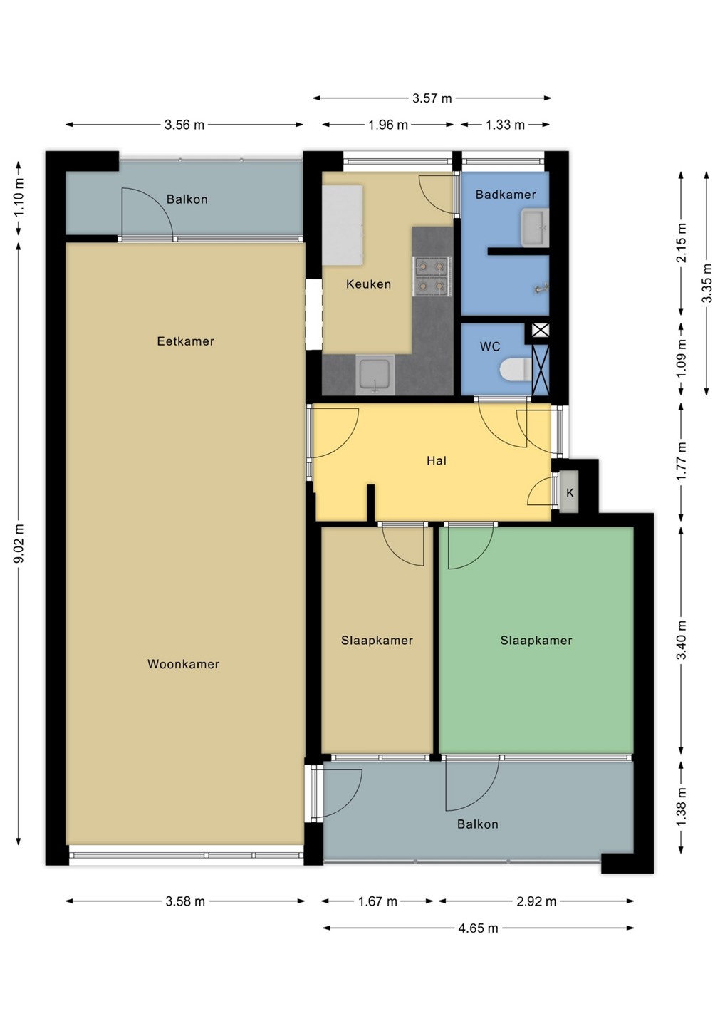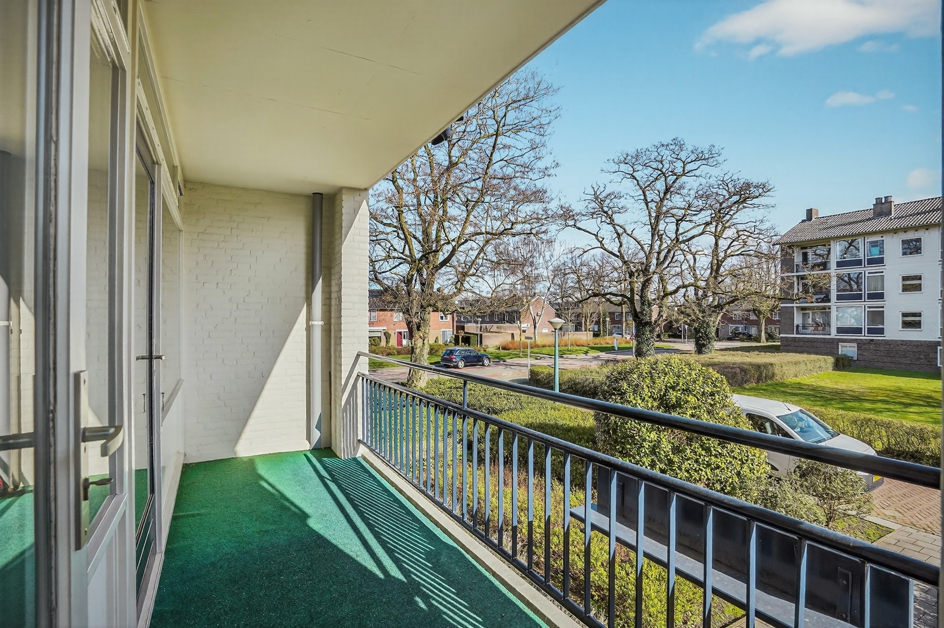 Eén balkon op het zuiden gericht, bereikbaar vanuit de woonkamer en de grote slaapkamer.