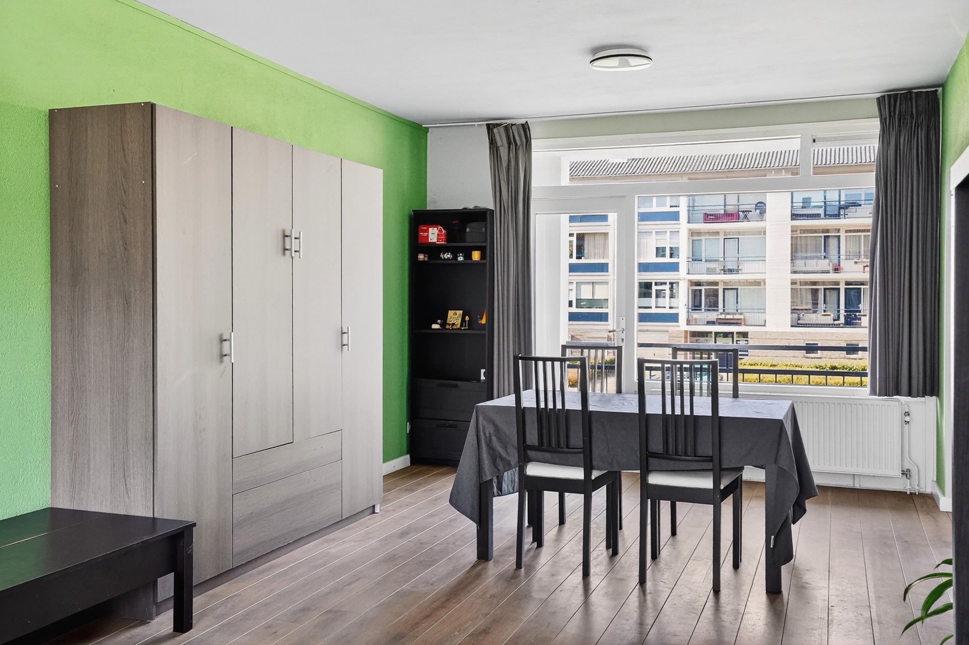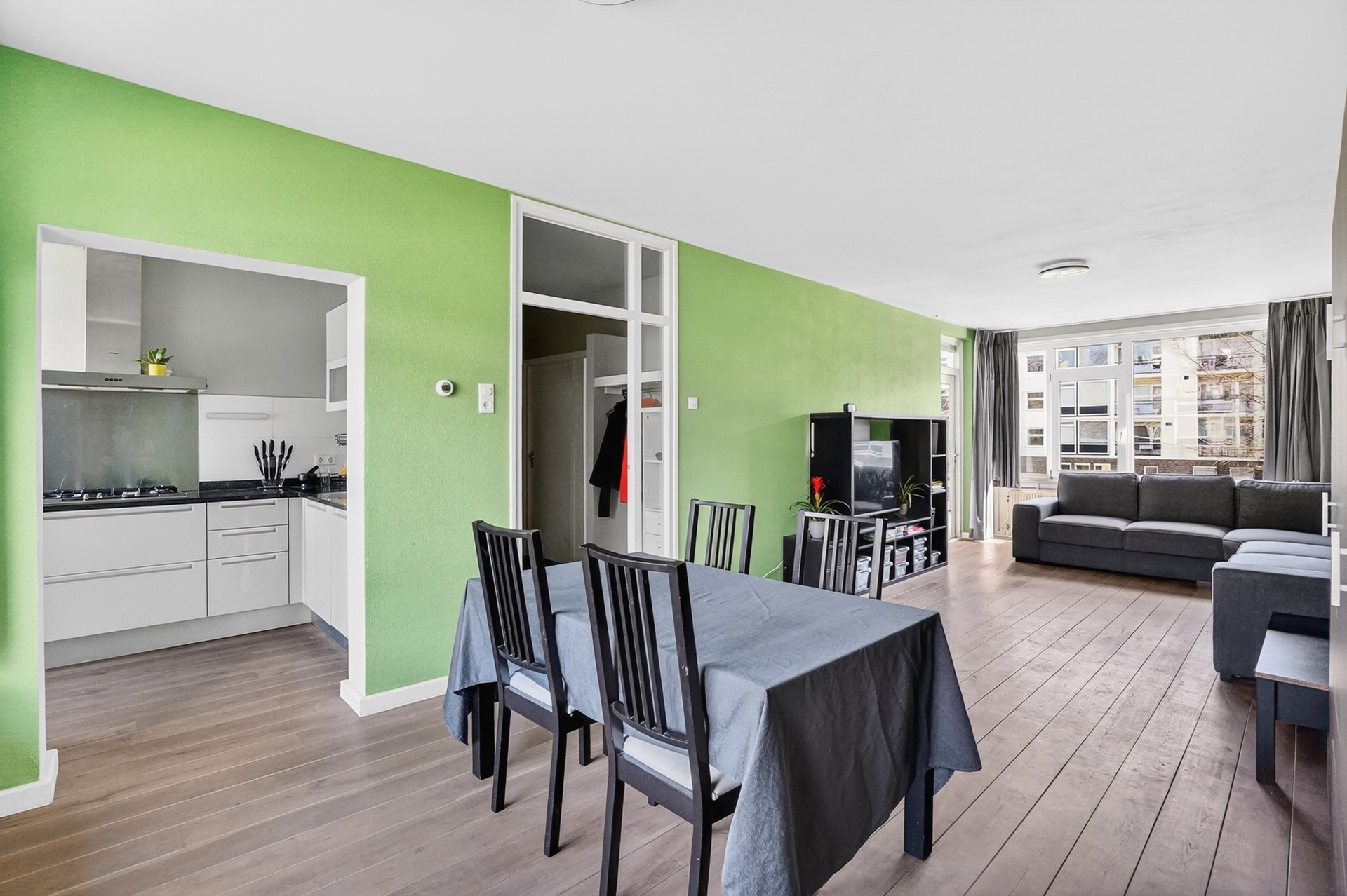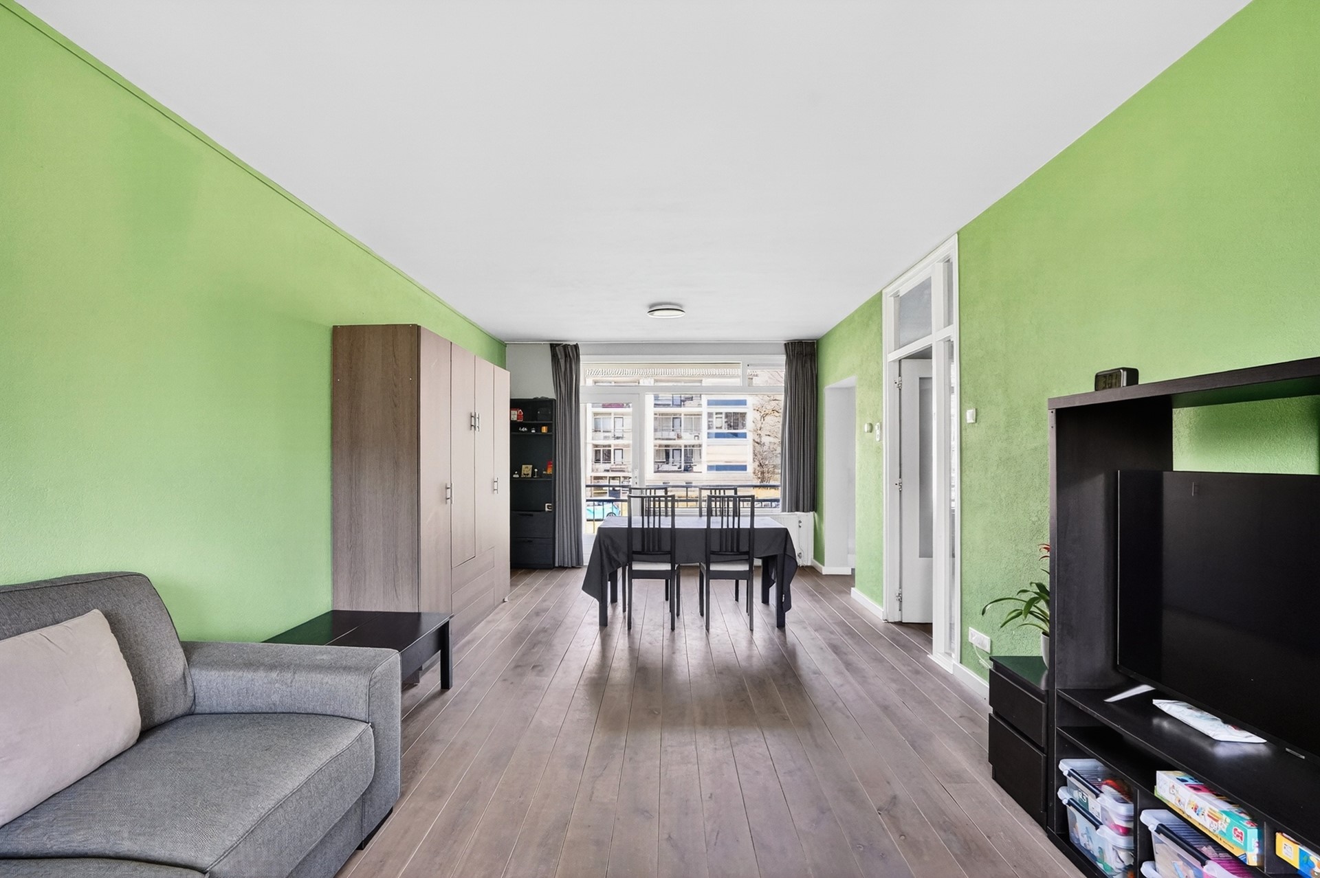 De royale woonkamer is voorzien van een laminaat vloer, stucwerk wanden en dito plafond. Door de grote raampartijen aan weerszijden komt een overvloed aan daglicht binnen. De balkons (noord- en zuid-gericht) zijn beiden toegankelijk vanuit de woonkamer.