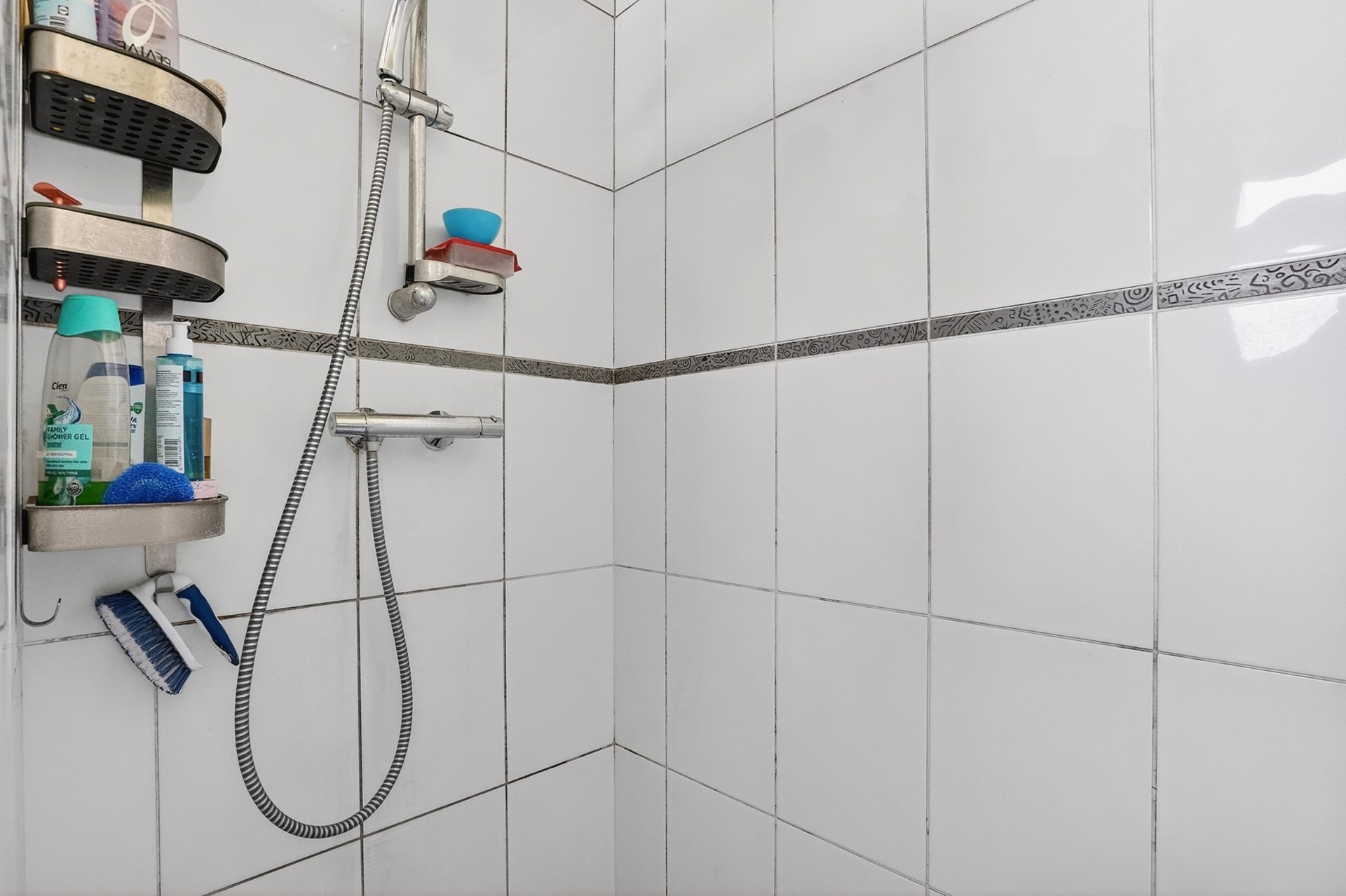 De badkamer is aansluitend aan de keuken bereikbaar. De badkamer is geheel betegeld en bestaat uit een ruime inloopdouche en een vaste wastafel met spiegel.