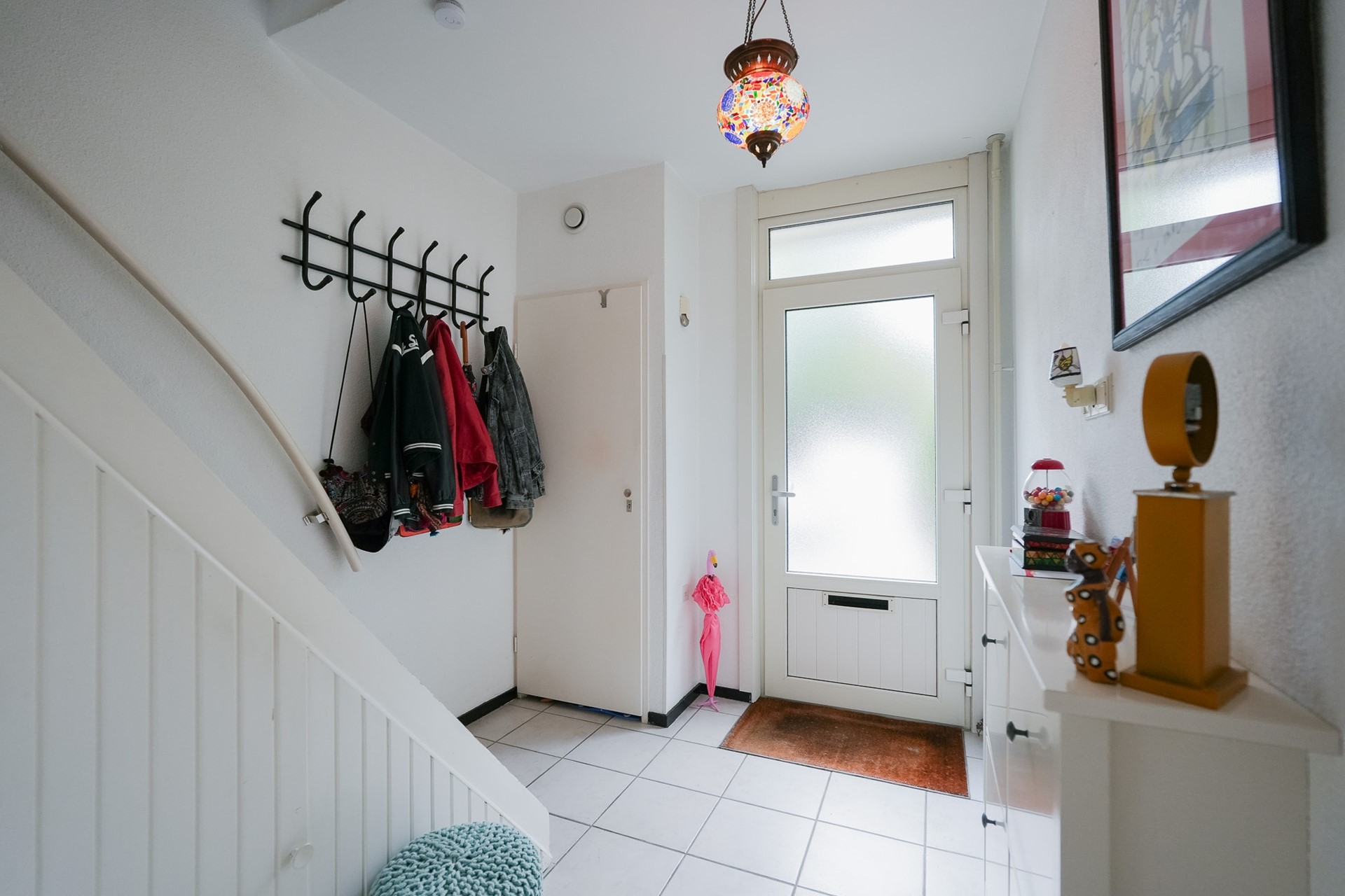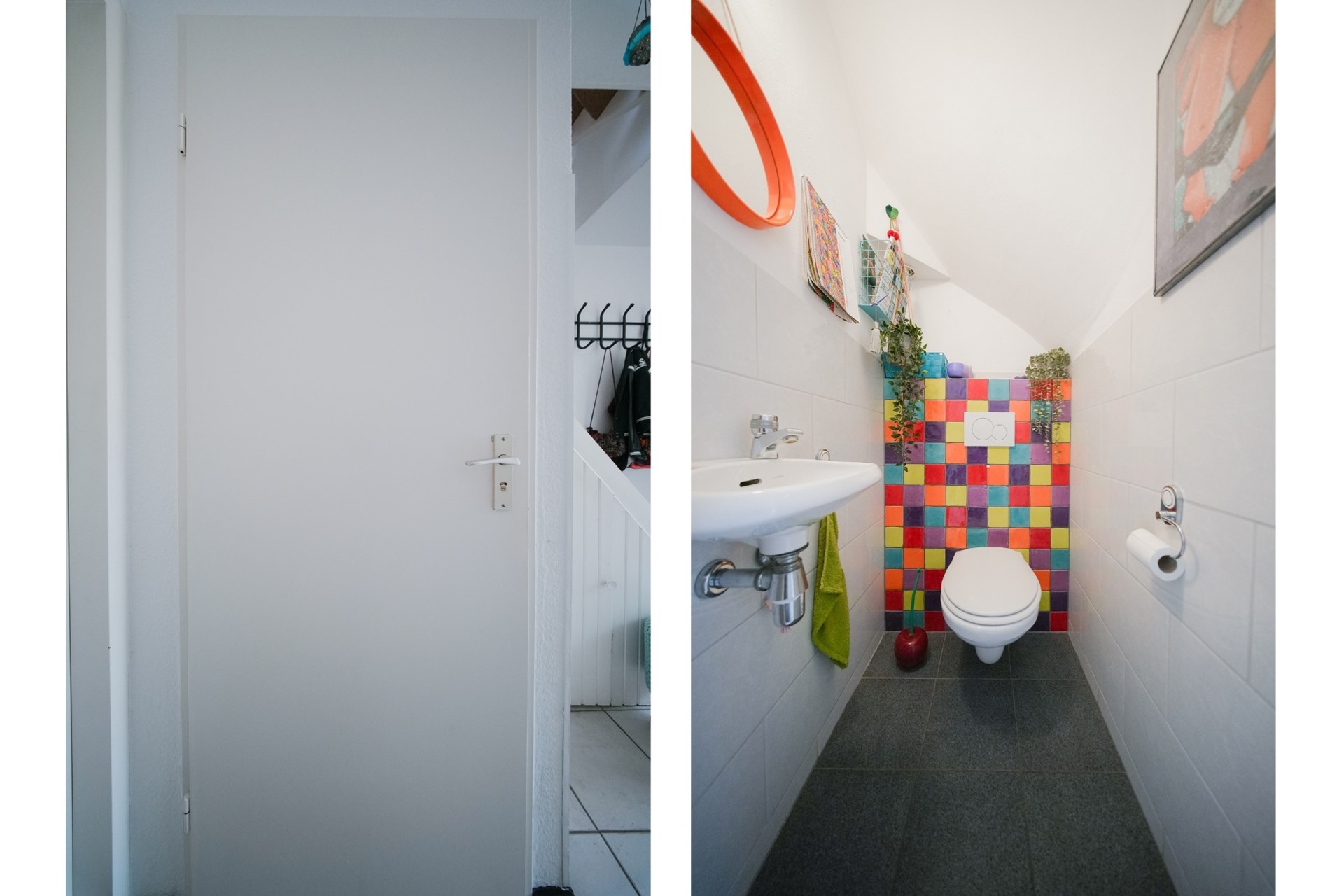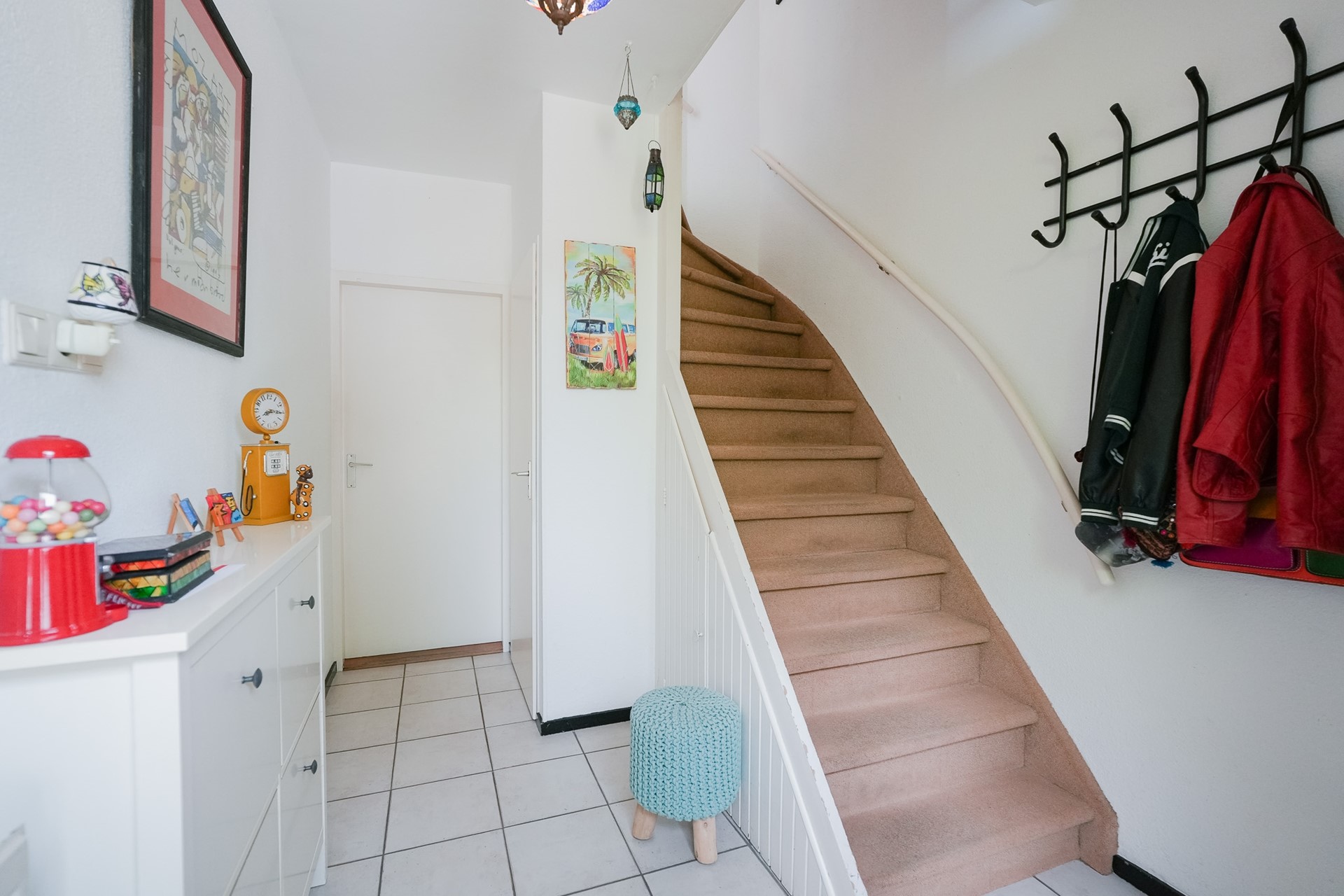 Entree met tegel vloer en deels gelambriseerde en deels stucwerk wandafwerking. Kast met locatie nutsvoorzieningen. Volledig betegeld toilet met hang closet, fonteintje en ventilatie.