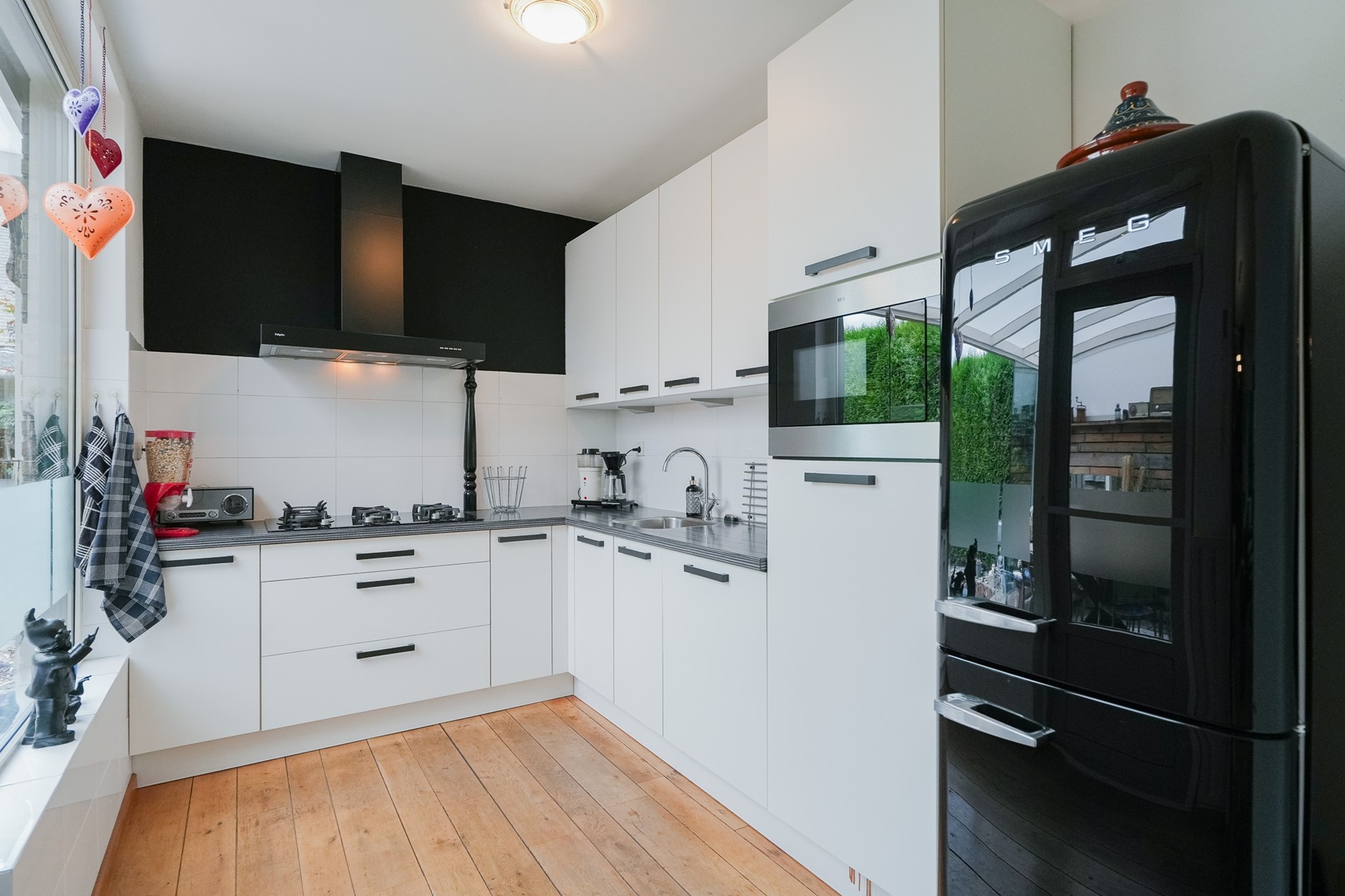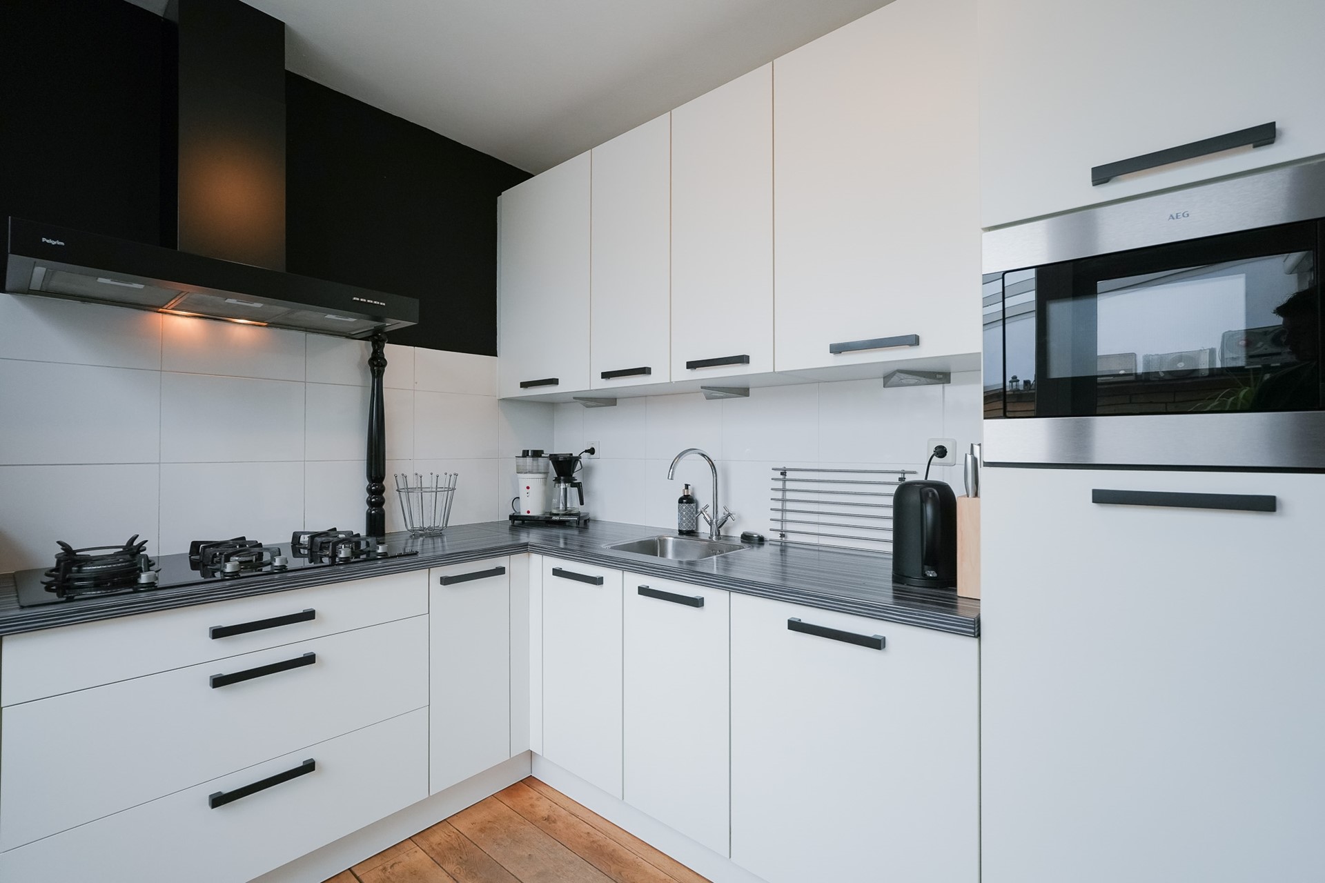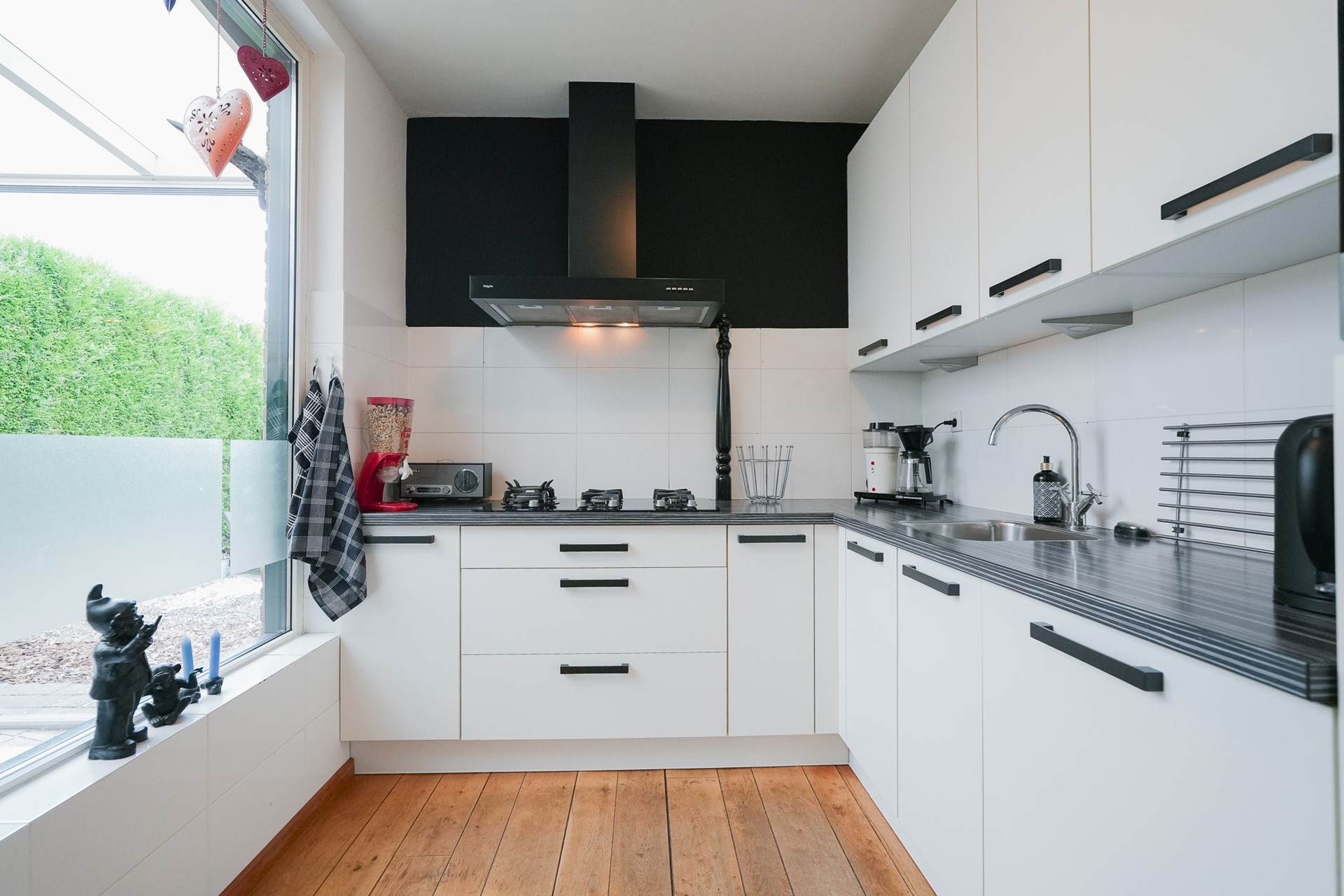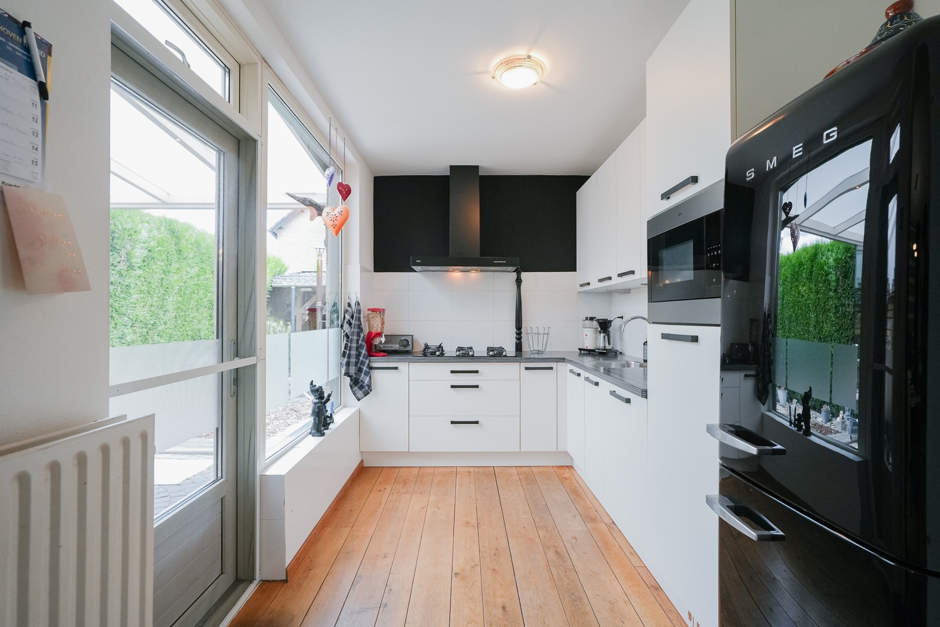 Aan de achterzijde van het huis vind je de nette, moderne keuken. Goed onderhouden, praktisch ingericht en voorzien van alle basisgemakken die koken leuk maken. En wil je je bakkunsten showen aan je gasten of samen met het gezin aan de slag? Hier kan het allemaal. Vanuit de keuken loop je bovendien gemakkelijk door naar de achtertuin met veranda – buiten eten wordt hiermee wel héél verleidelijk.