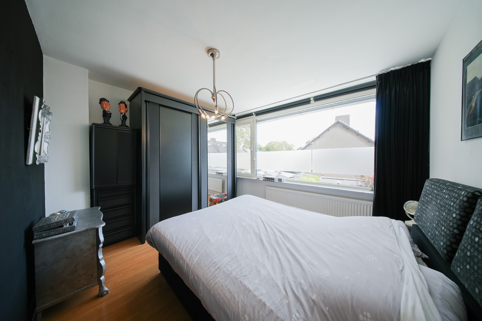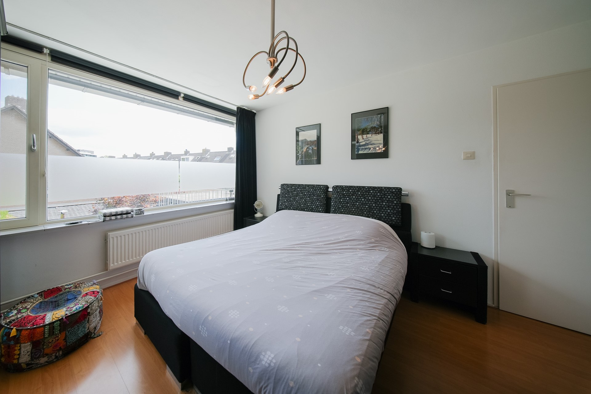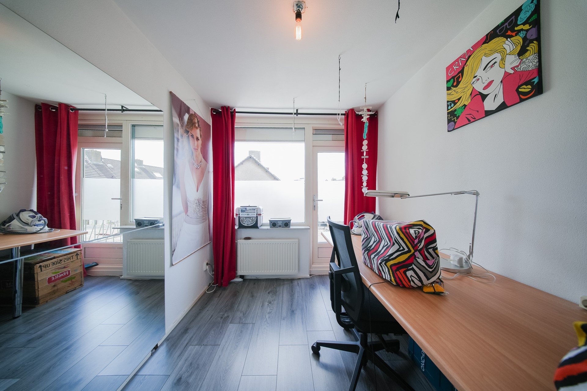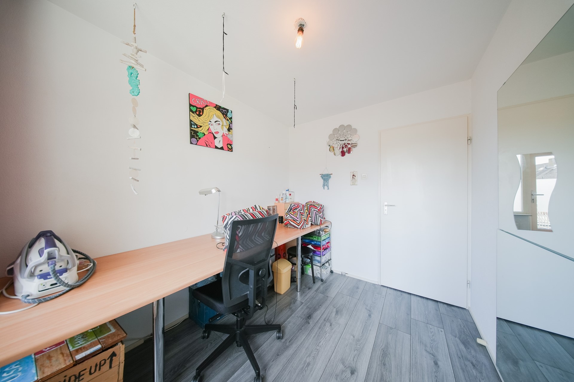 Overloop met tapijt vloer en deels stucwerk wandafwerking. Slaapkamer 1 aan de achterzijde met laminaat vloer, stucwerk wandafwerking. Slaapkamer/werkkamer 2 aan de achterzijde met laminaat vloer en rolluik. Deze kamer biedt toegang tot een dakterras. Slaapkamer 3 aan de voorzijde met laminaat vloer en een screen voor de laaghangende zon.