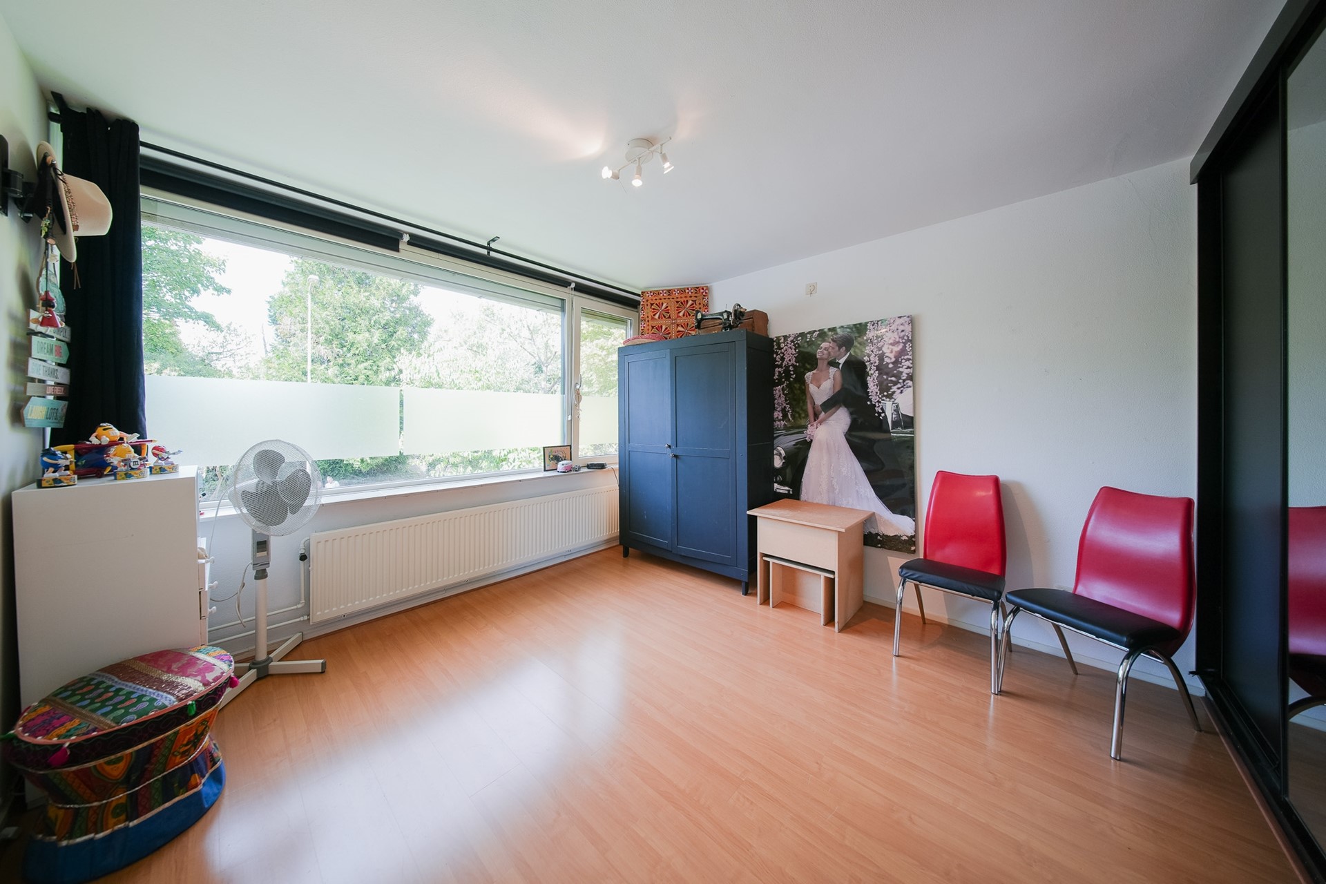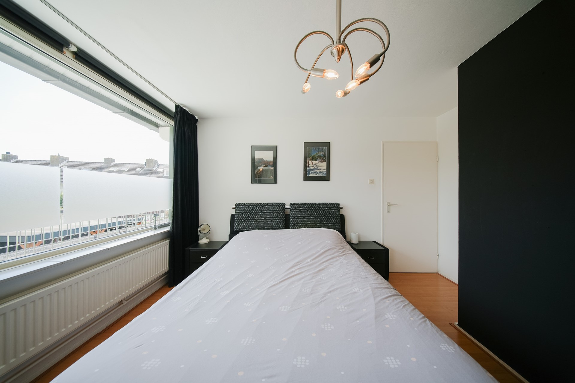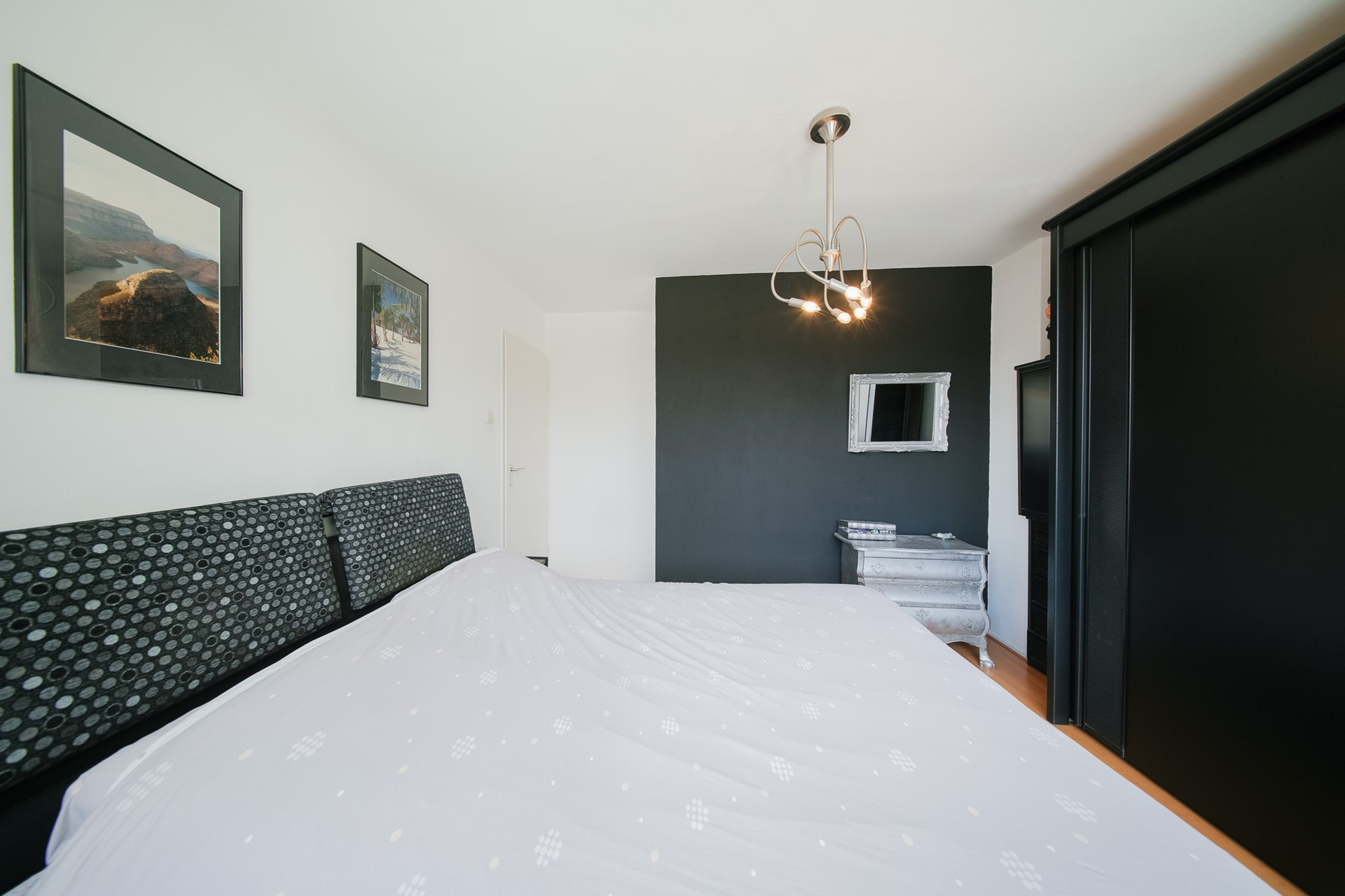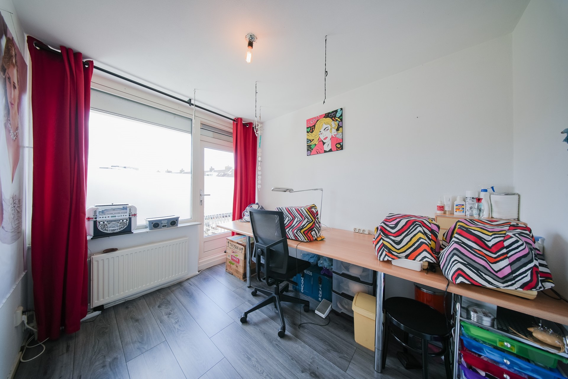 Overloop met tapijt vloer en deels stucwerk wandafwerking. Slaapkamer 1 aan de achterzijde met laminaat vloer, stucwerk wandafwerking. Slaapkamer/werkkamer 2 aan de achterzijde met laminaat vloer en rolluik. Deze kamer biedt toegang tot een dakterras. Slaapkamer 3 aan de voorzijde met laminaat vloer en een screen voor de laaghangende zon.