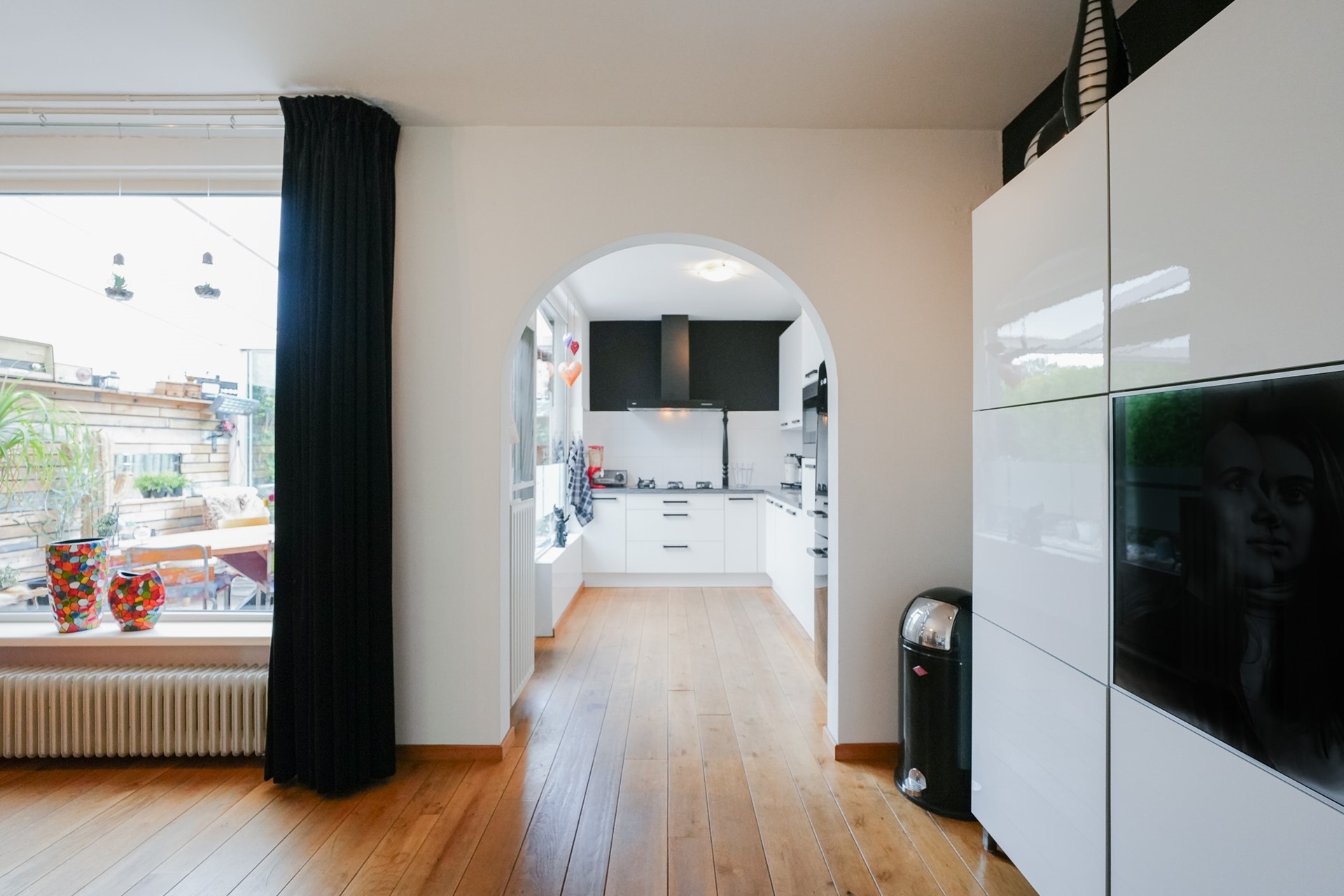 Ruime, lichte woonkamer met houten vloer, stucwerk wandafwerking. Elektrische zonneluifel . Dezelfde houten vloer van de woonkamer loopt netjes door in de keuken, tevens is er in de keuken een deur naar de achtertuin. De half open keuken is verder voorzien van deels betegelde wandafwerking.